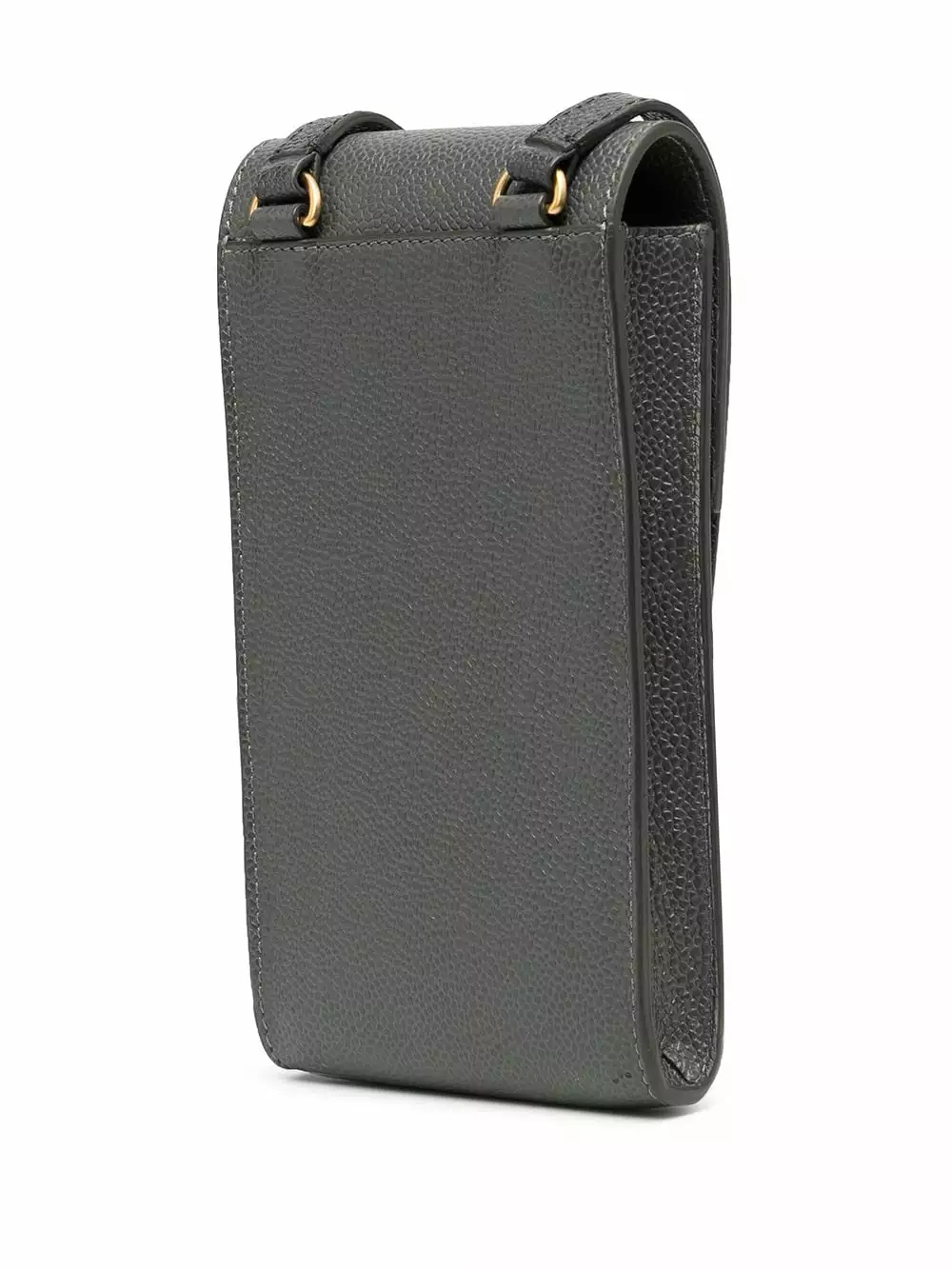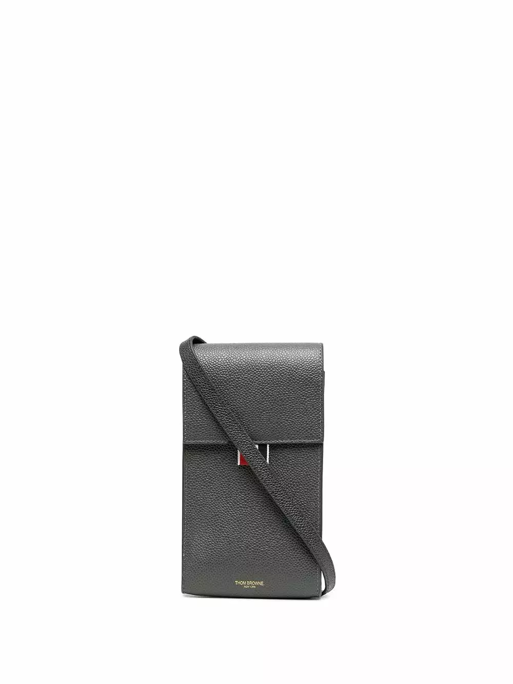 Keep the extension of your arm safe and sound wherever you are with this pebbled calf leather Thom Browne phone holder. Decorated with a signature RWB ribbon tag, it makes sure everyone knows where your loyalties lie. Featuring a shoulder strap, a front flap closure and a signature RWB stripe.