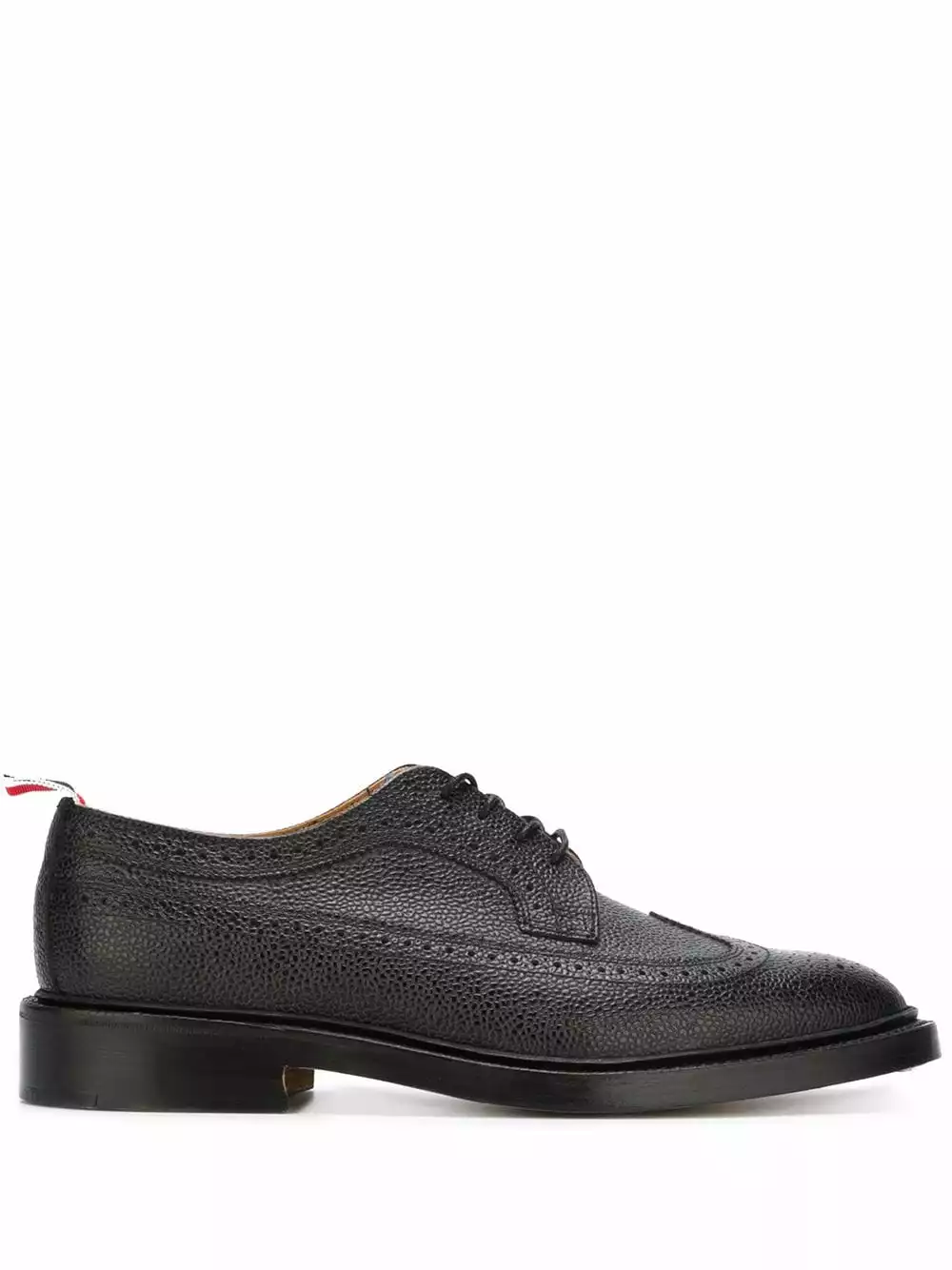 Acclaimed for his subtly deconstructed tailoring, Browne incorporates traditional craftsmanship techniques to modern transformations in men’s formalwear. Crafted in the United Kingdom from black pebble grain leather, these timeless brogues features an almond toe, a lace-up front fastening, a pull tab at the rear, punch hole detailing and a pebbled leather texture.