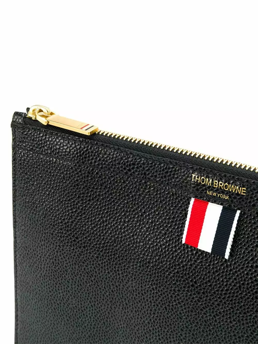 Banish those unsightly bulging pockets once and for all with this mini gusset folio from Thom Browne. Made from black pebbled leather, this slimline accessory is perfect for transporting small essentials in the most stylish way possible. Featuring a front embossed logo stamp, a signature tri-colour striped tab, an all-around zip fastening, a main internal compartment, and a striped lining.