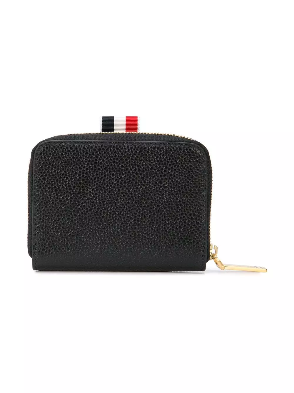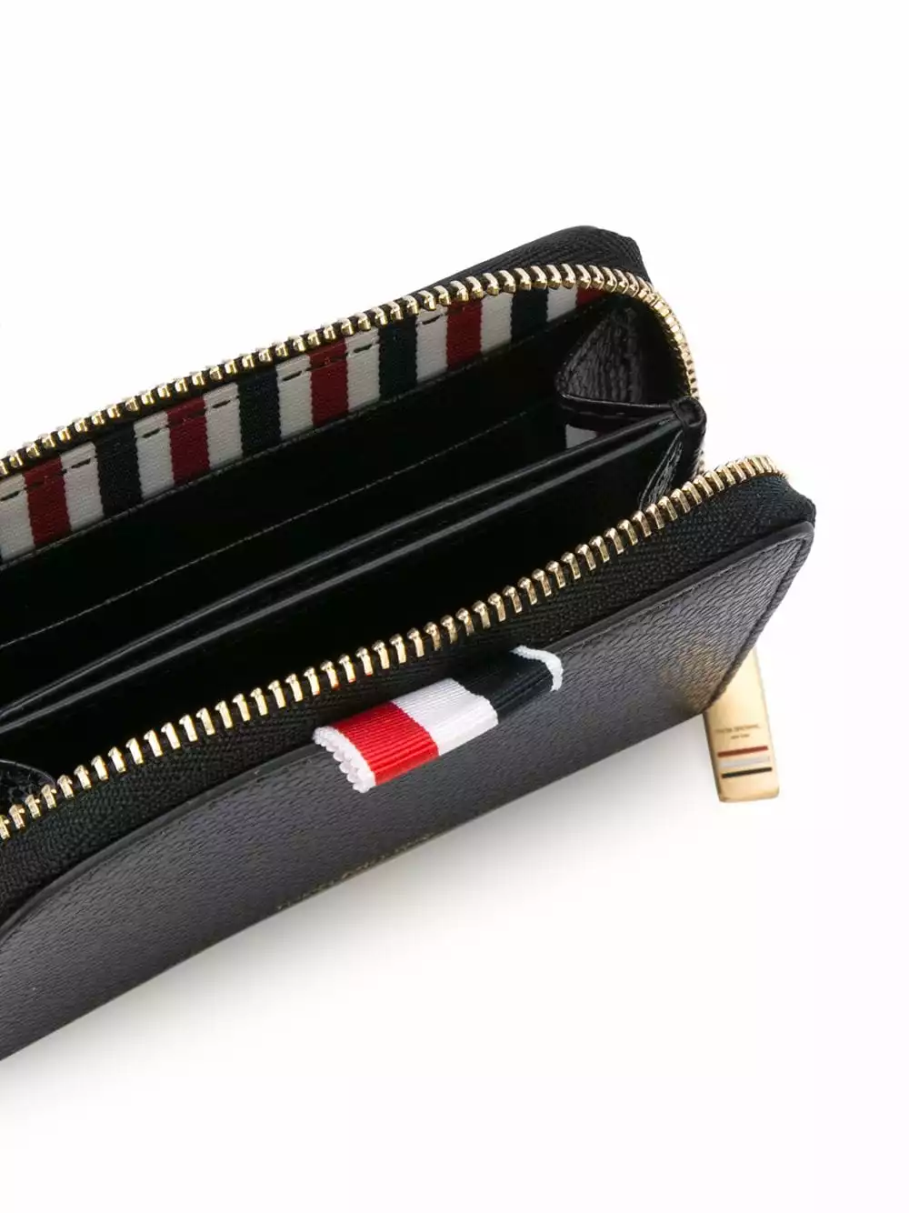 Thom Browne’s newest edit captures the immaculate craftsmanship and minimalist designs that have come to define the American label, as showcased by this black leather Pebbled Slim Short Purse. Featuring an all around zip fastening, gold-tone hardware, a front centre logo stamp, multiple interior compartments, a tricolour grosgrain tab on the front and a striped lining.