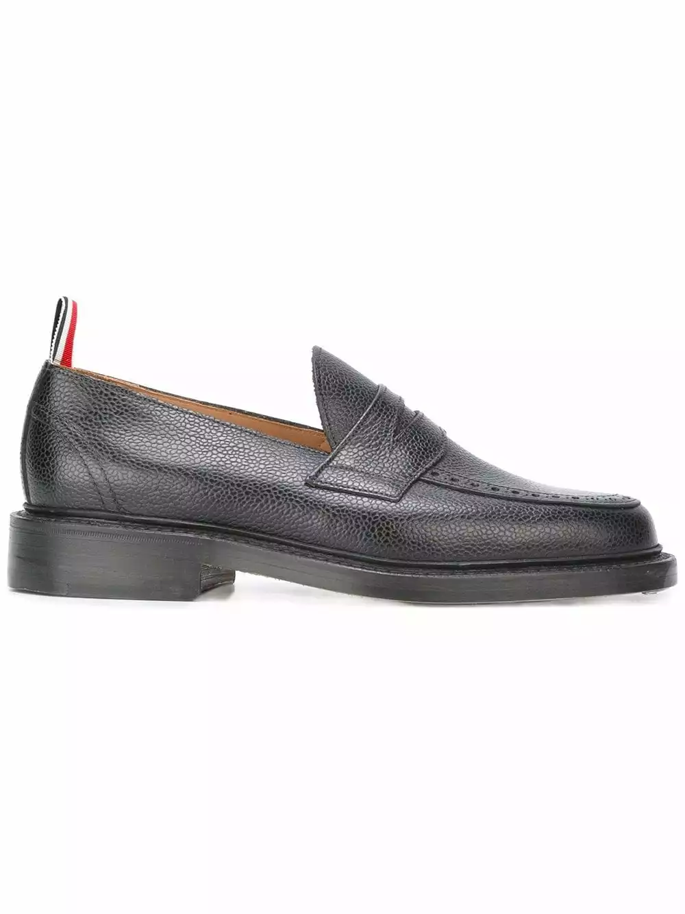 When tradition impacts as much as innovation, Thom Browne excels in perfectly balancing prominent characteristics with unforeseen modifications. The casual model to a well-thought ensemble, classic loafers certainly never go out of style. With a pull tab replaced with Browne’s remarkable signature red, white and navy blue stripe in grosgrain material, this pebble grained leather pair features a round toe, punch hole detailing and a slip-on style.