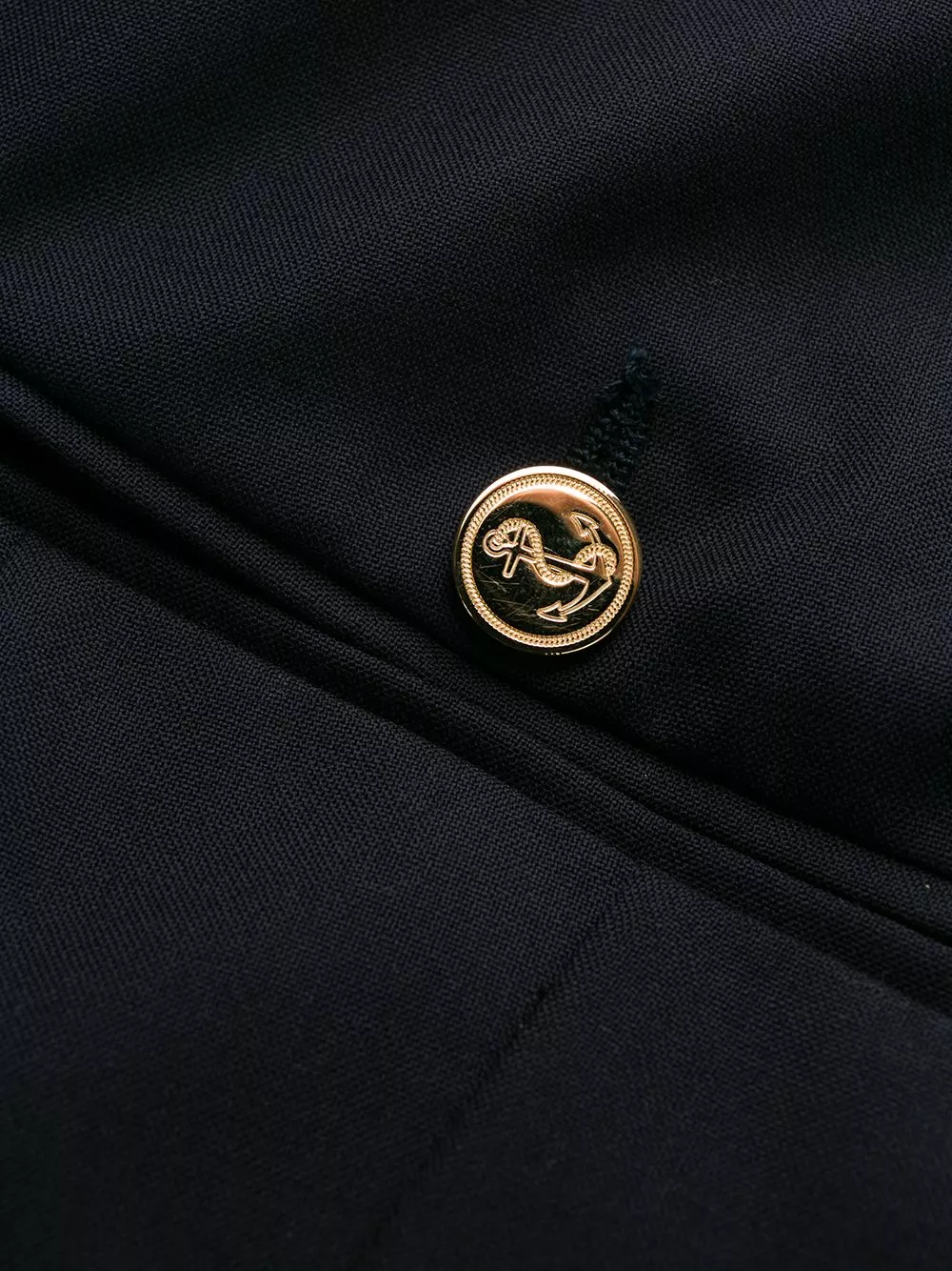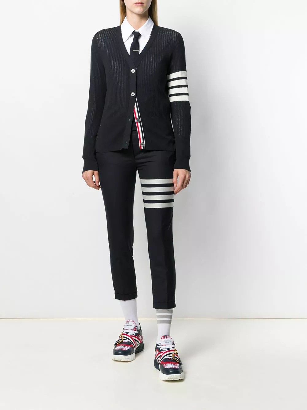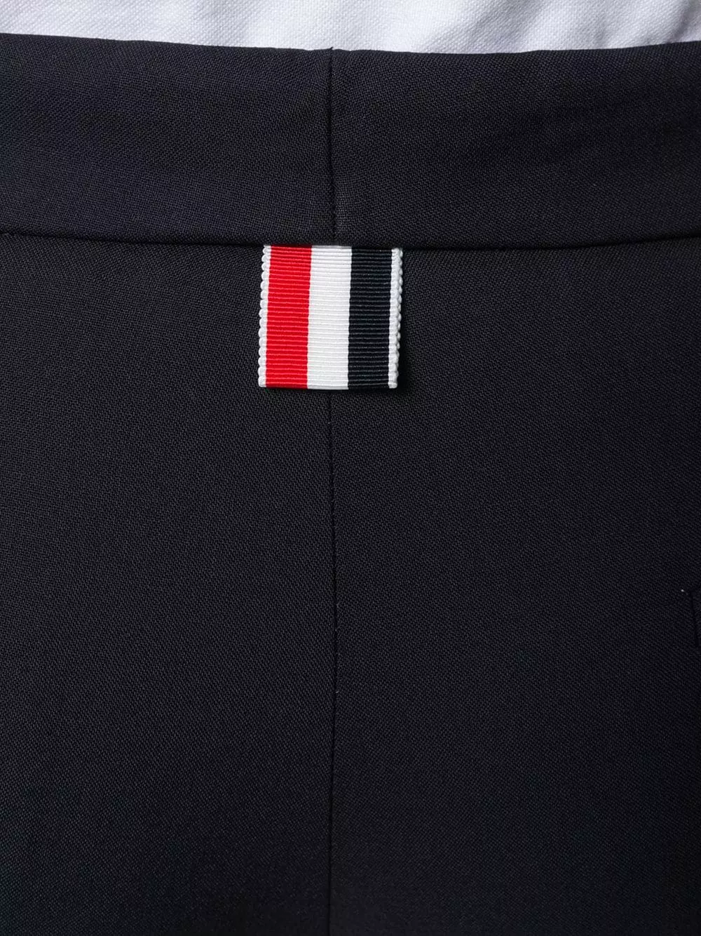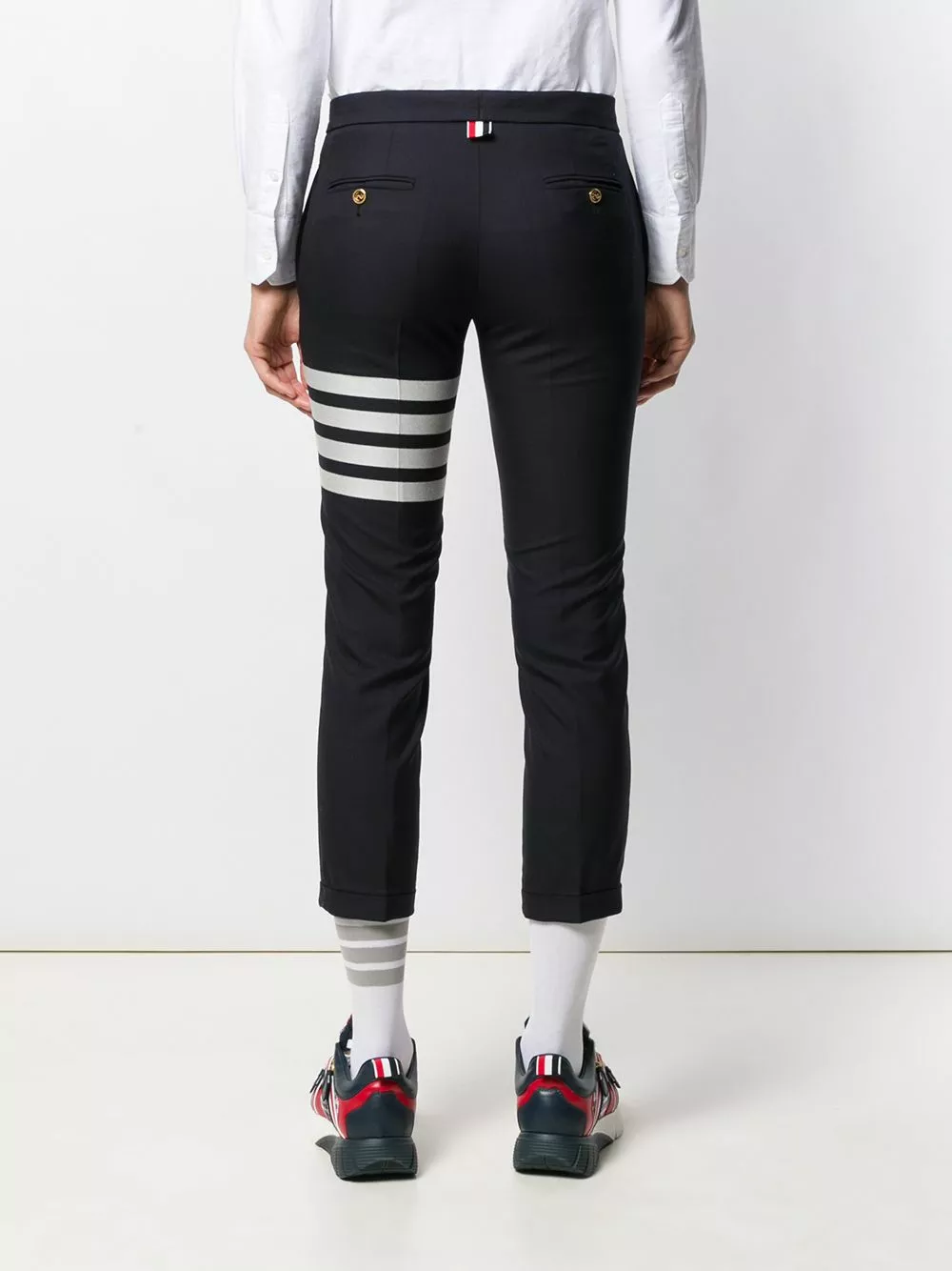 Look out for Thom Browne’s iconic 4-Bar stripe on these skinny cropped trousers. Crafted from navy and white tones, they combine classic details with a modern silhouette. Get the best of both worlds. Featuring two back buttoned welt pockets, a skinny fit, a cropped length, a signature grosgrain loop tab and a 4-Bar stripe.