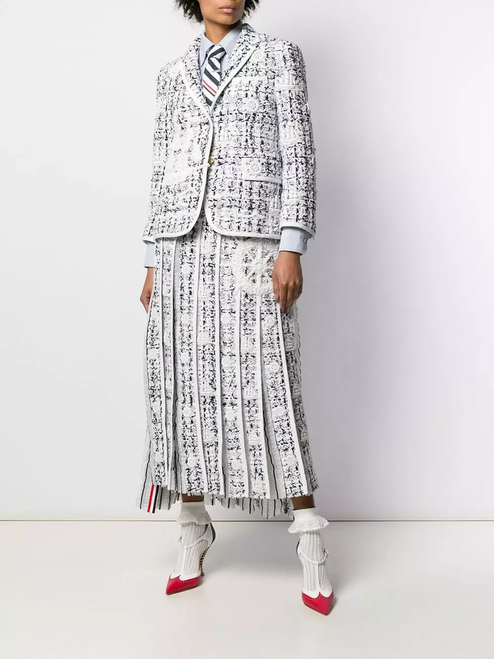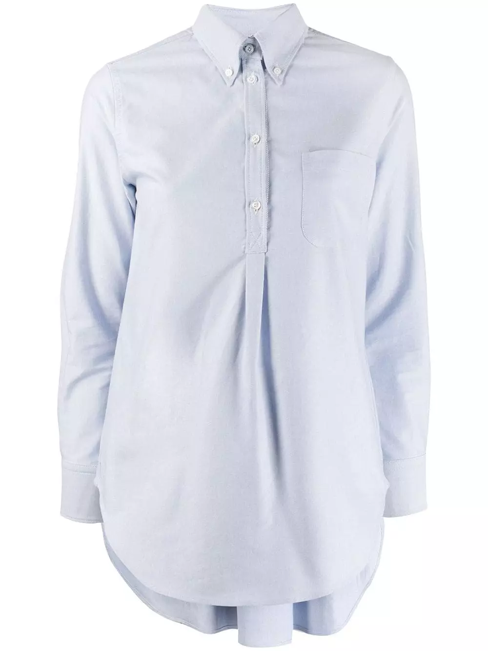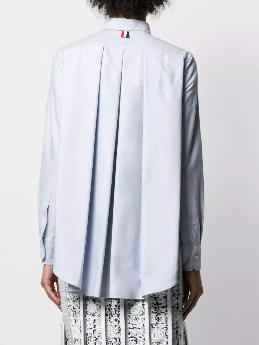From the front, this is a simple, relaxed fit shirt. However, turn around, and the pleated back reveals a feminine touch. A lesson in expert tailoring. Featuring a button down collar, a signature three stripe detail, back pleated details, a front button fastening, a patch pocket at the chest, a relaxed fit, long sleeves and button cuffs.
