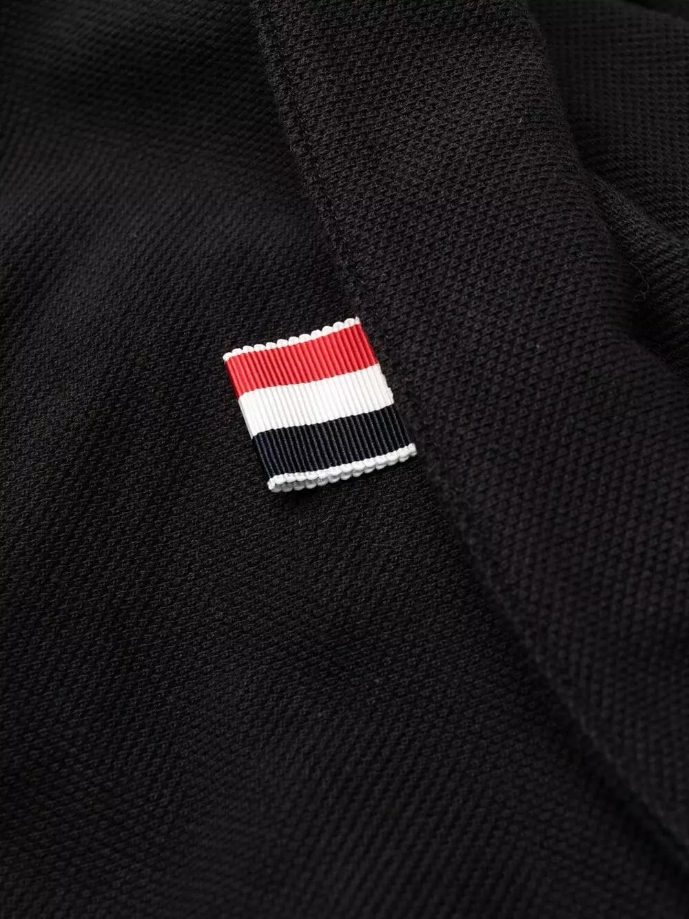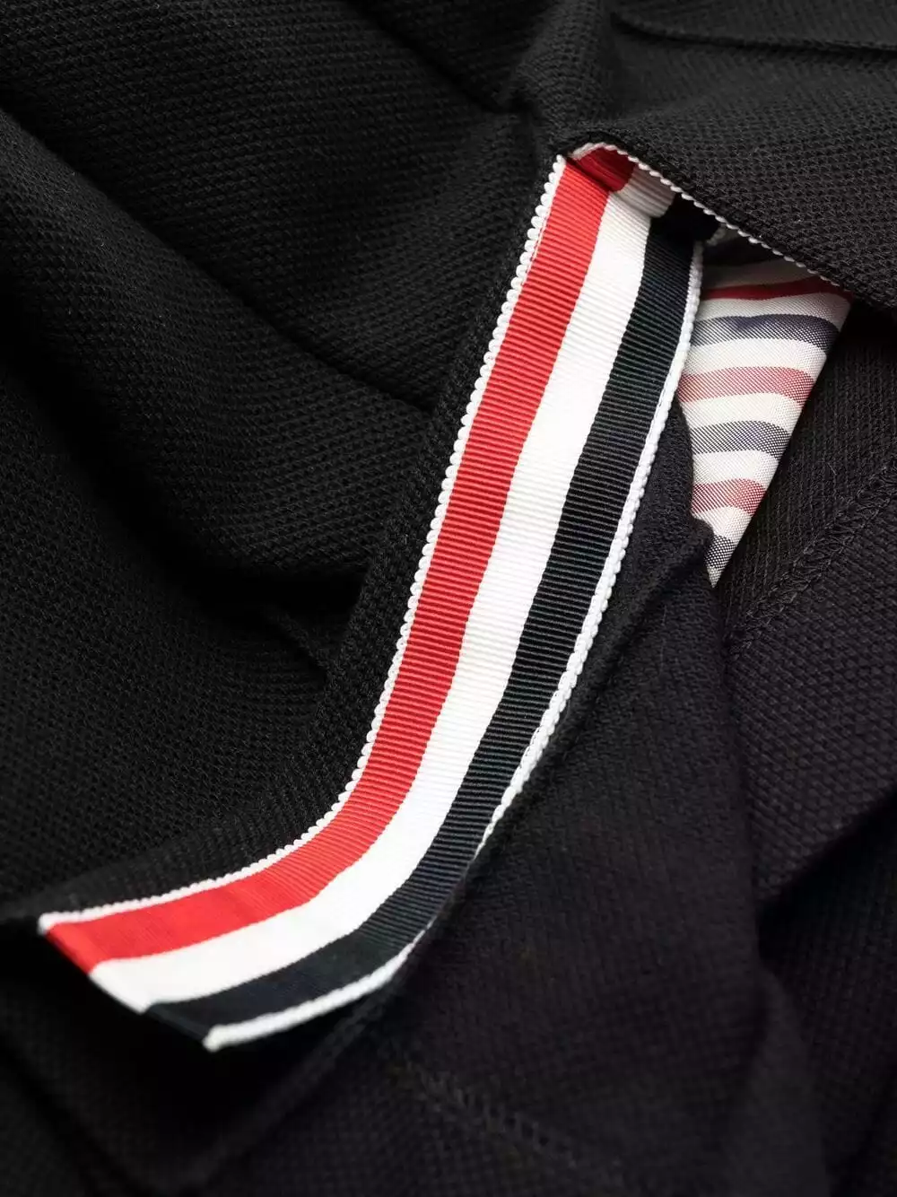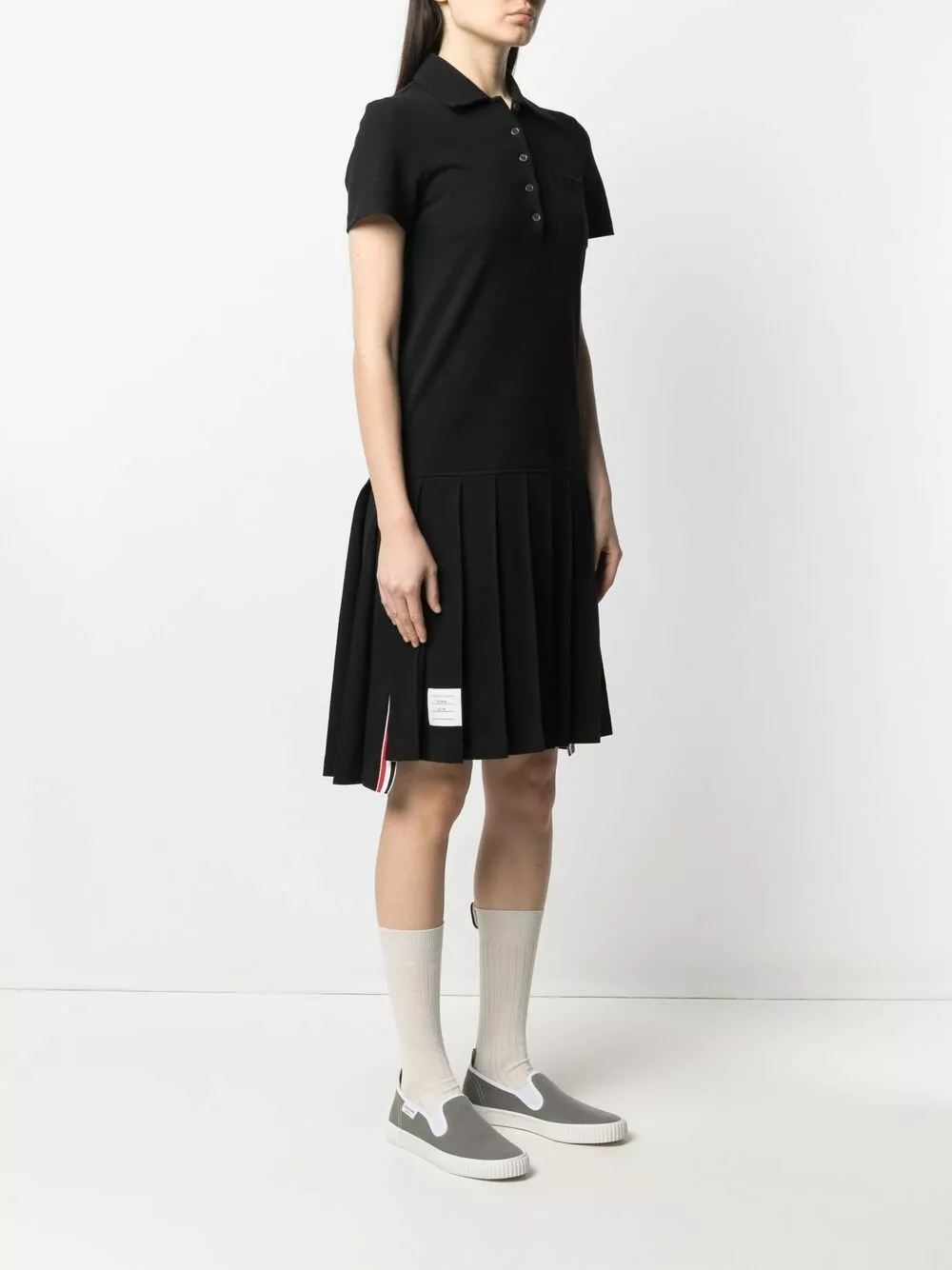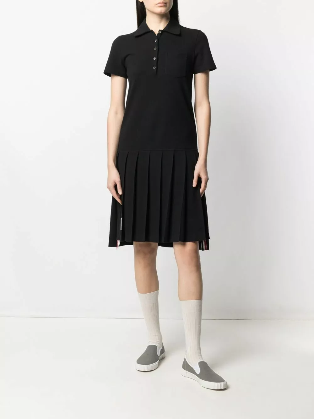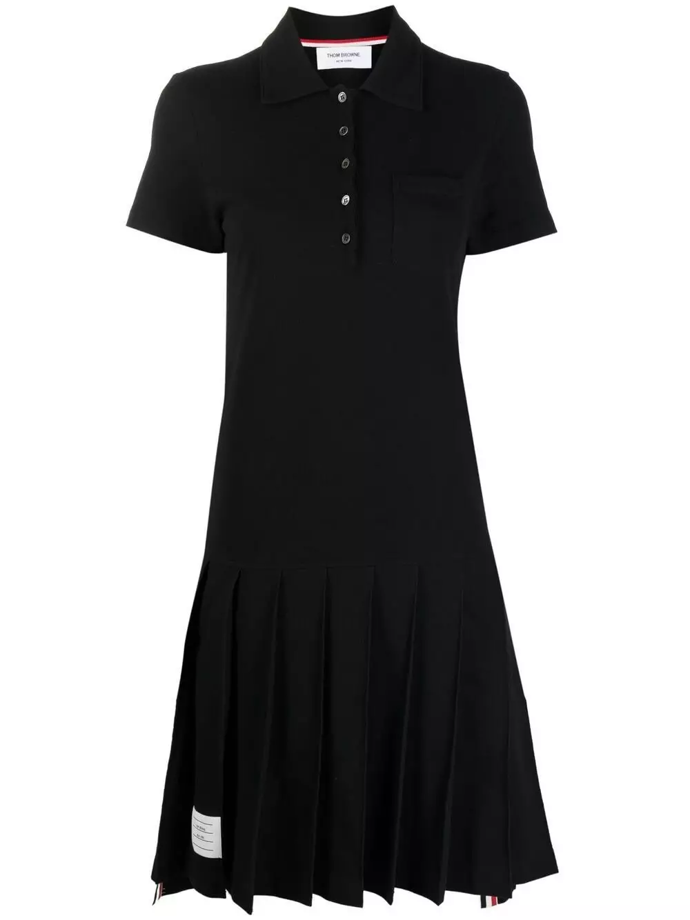 American fashion designer Thom Browne is known for his signature cropped silhouettes that celebrate the power of tailoring. This black cotton polo dress is detailed with the label’s signature tri-colour grosgrain ribbed trims and features a high-low pleated skirt.