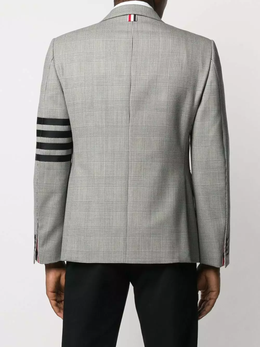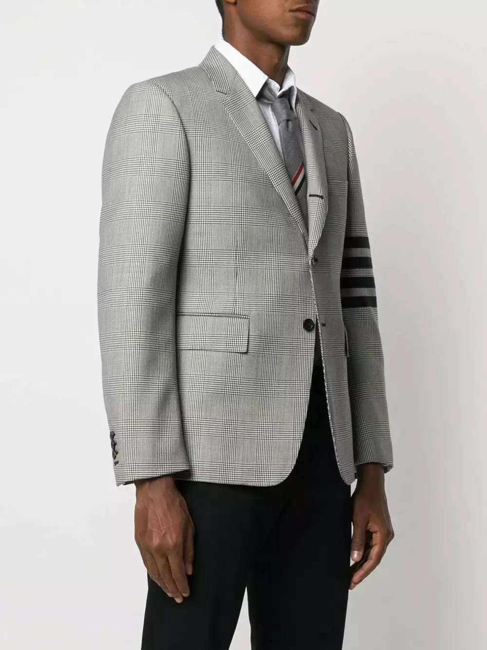 Pick a blazer, but make it Thom Browne. To be more exact, this black and white wool sport blazer with its check print and signature 4-Bar stripes. It’s a winner. Featuring a check print, a notched collar, a front button fastening, a chest pocket, front flap pockets, long sleeves, a straight hem, signature 4-Bar stripes and a striped lining.