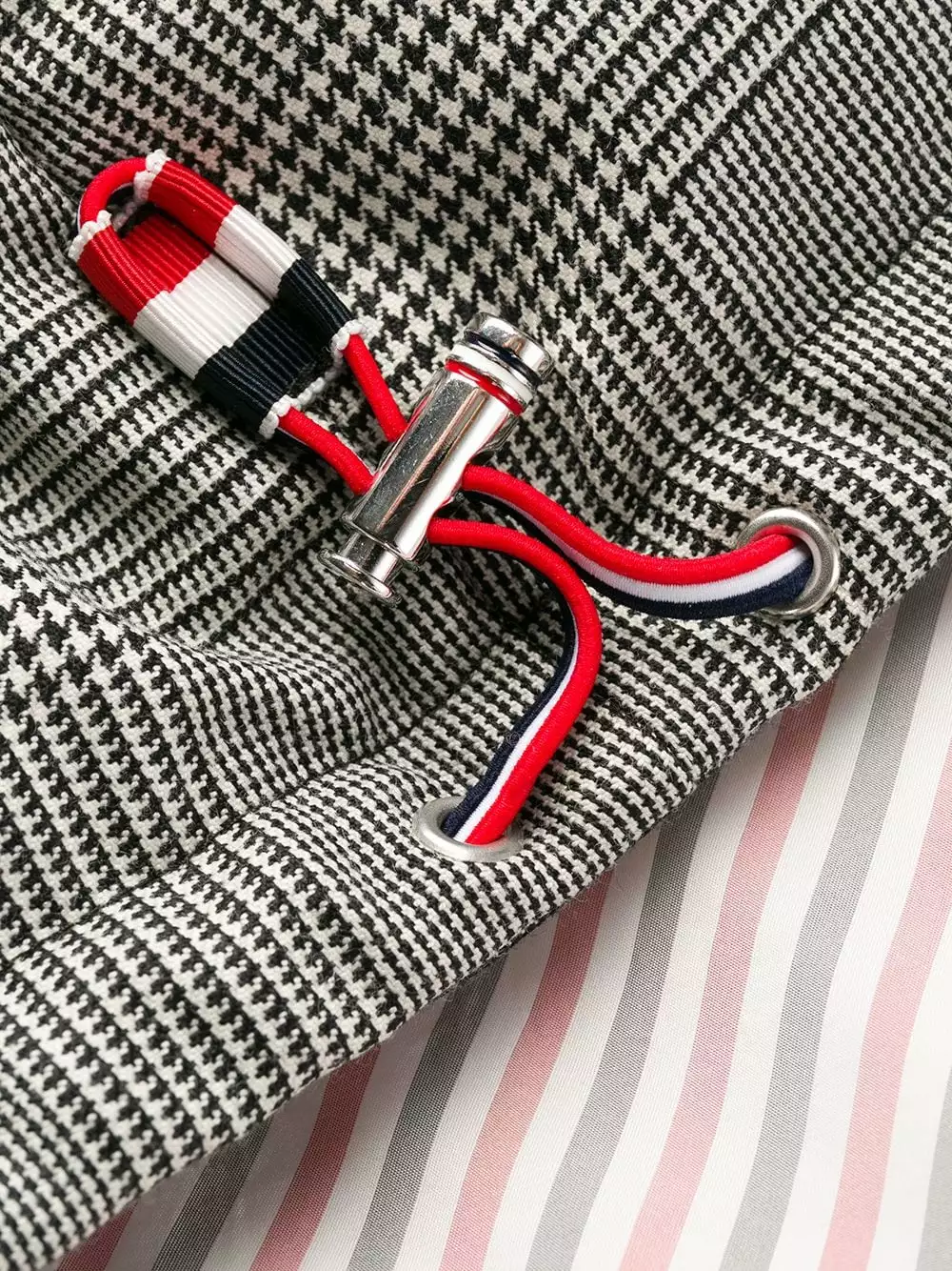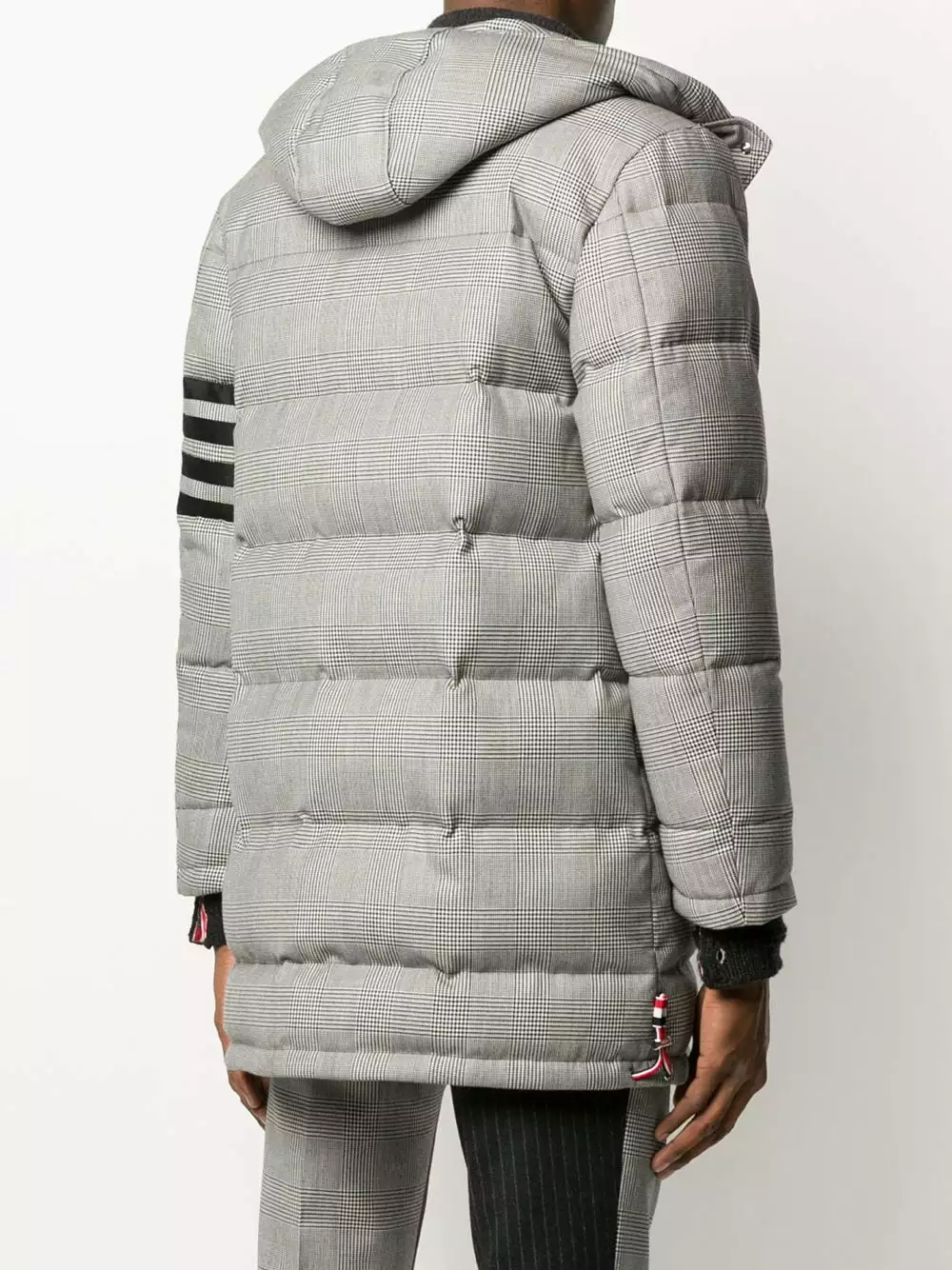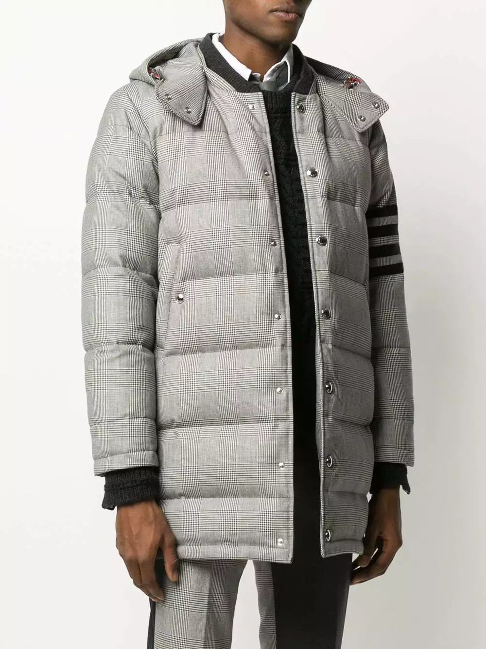 Versatility is the key to a successful wardrobe and this Prince of Wales padded coat from Thom Browne certainly offers that. It is topped with a detachable hood so you can alter your look based on your mood, or perhaps more suitably the weather. Check it out. Featuring a detachable hood, a snap fastening, side pockets, 4-bar stripes on the sleeve, a Prince of Wales check pattern and down-feather filling.