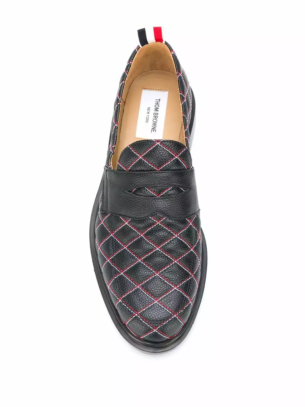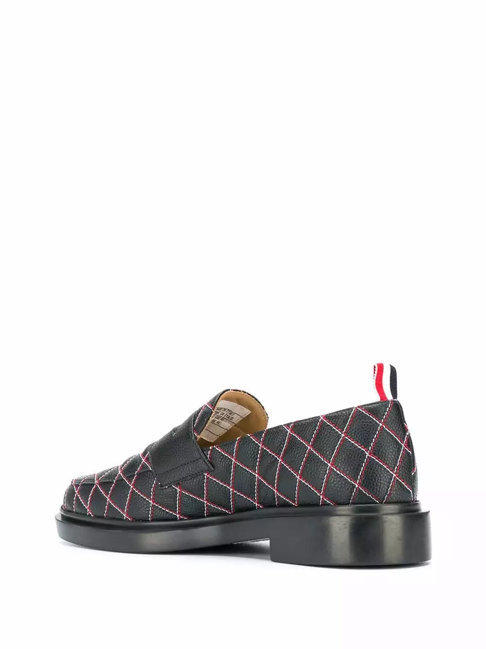 We are honoured to bring you these fabulous quilted loafers from Thom Browne. The black, calf leather loafers feature a quilted finish, logo pull-tab at the heel, flat leather sole, slip-on style and contrast stitching. Slip on and slip out.