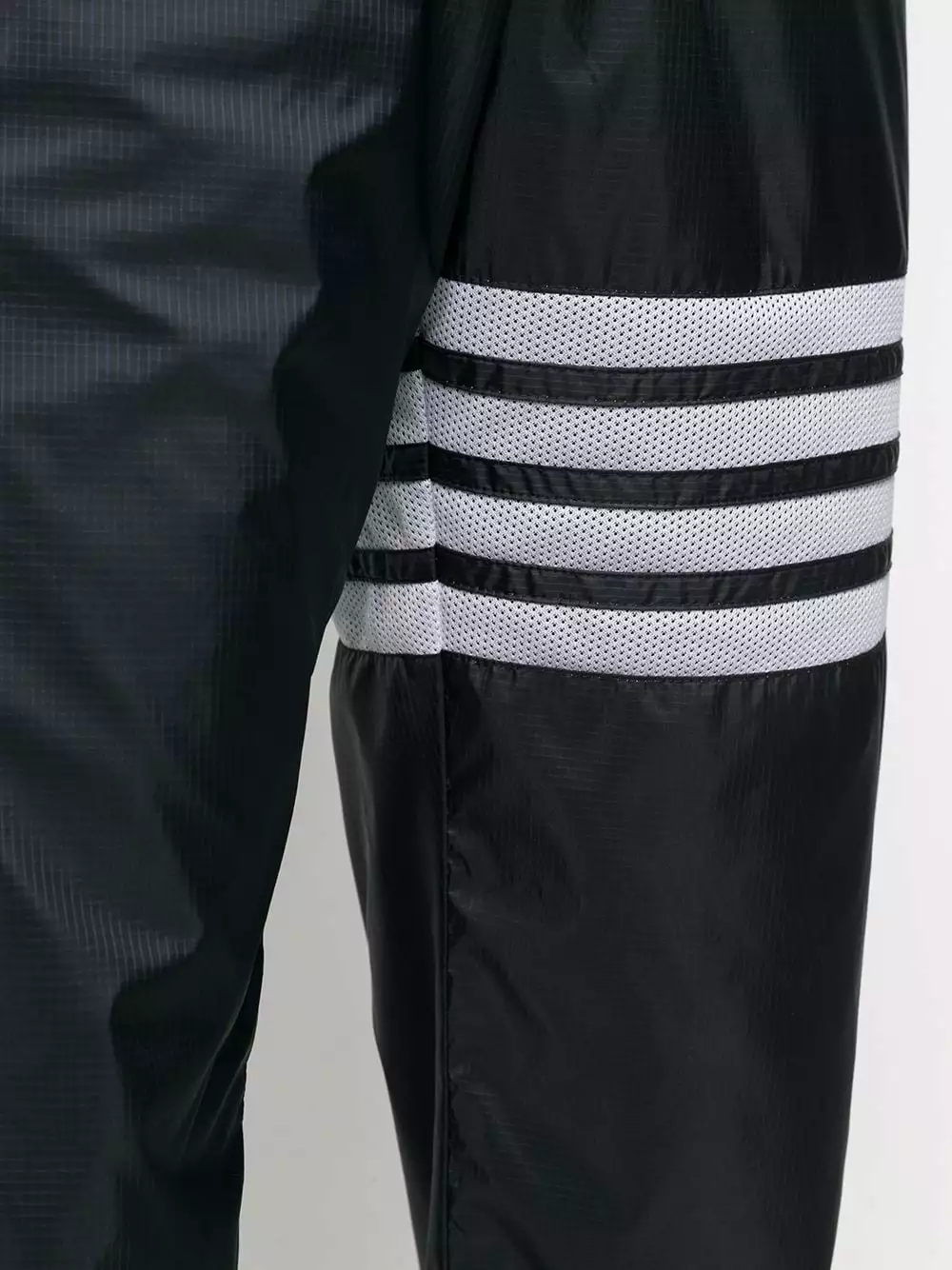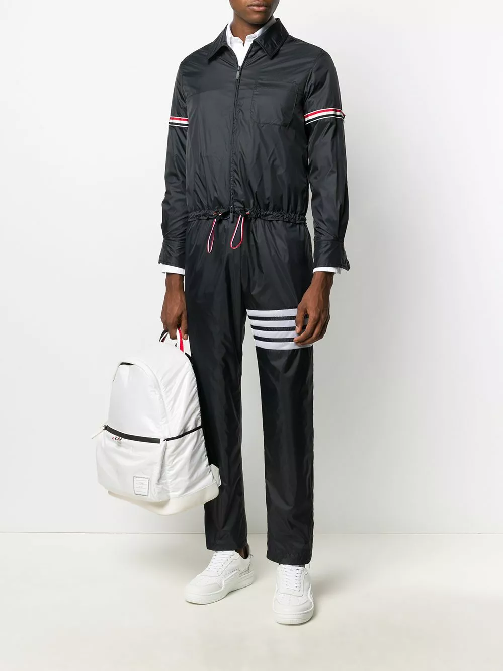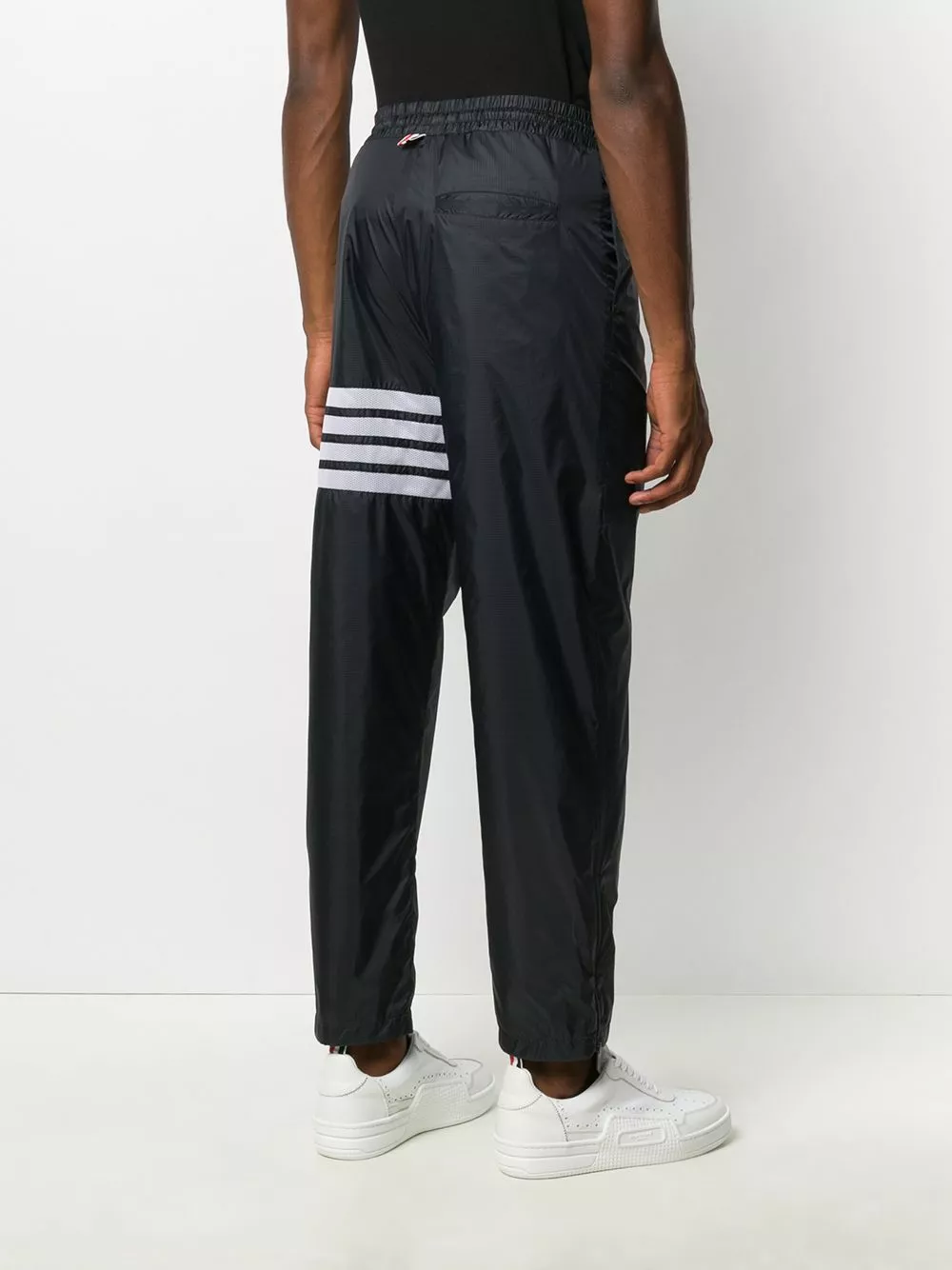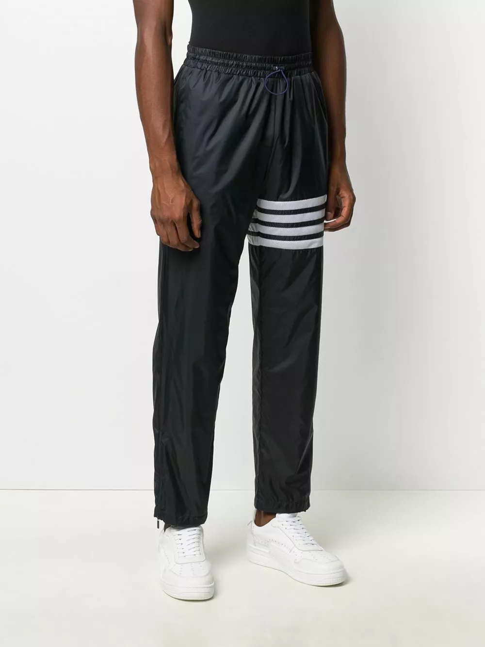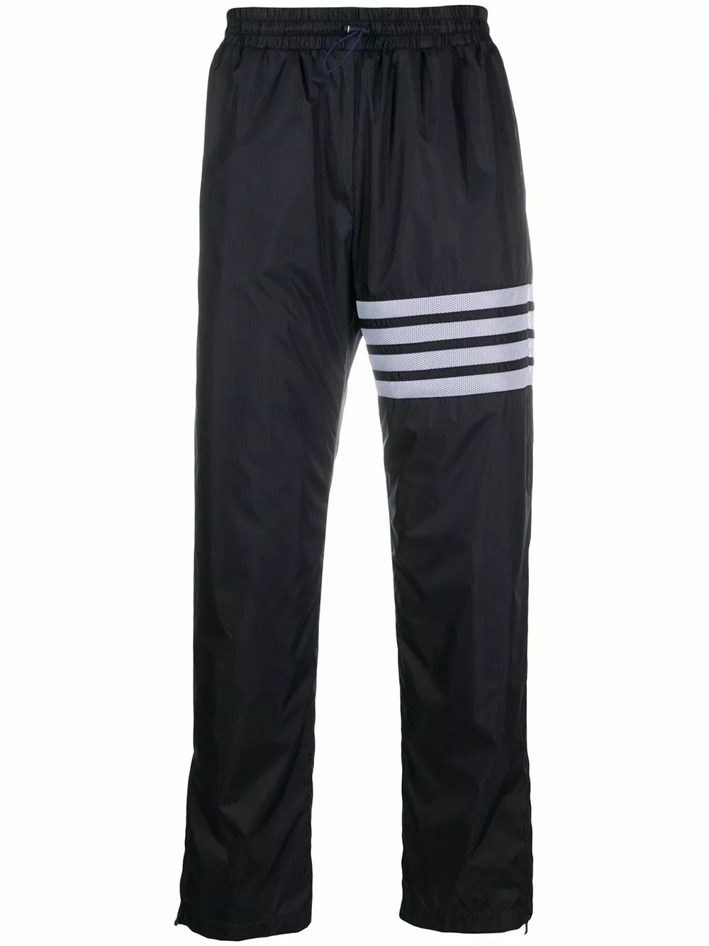 Tired of the same old cotton sweats? Perhaps it’s time for a futuristic way to relax. Not lounging on a spaceship, but more like you’re trying on these navy nylon trackpants. The future is here, courtesy of Thom Browne.