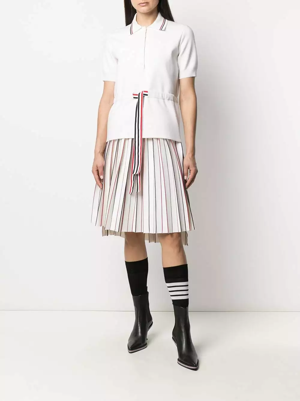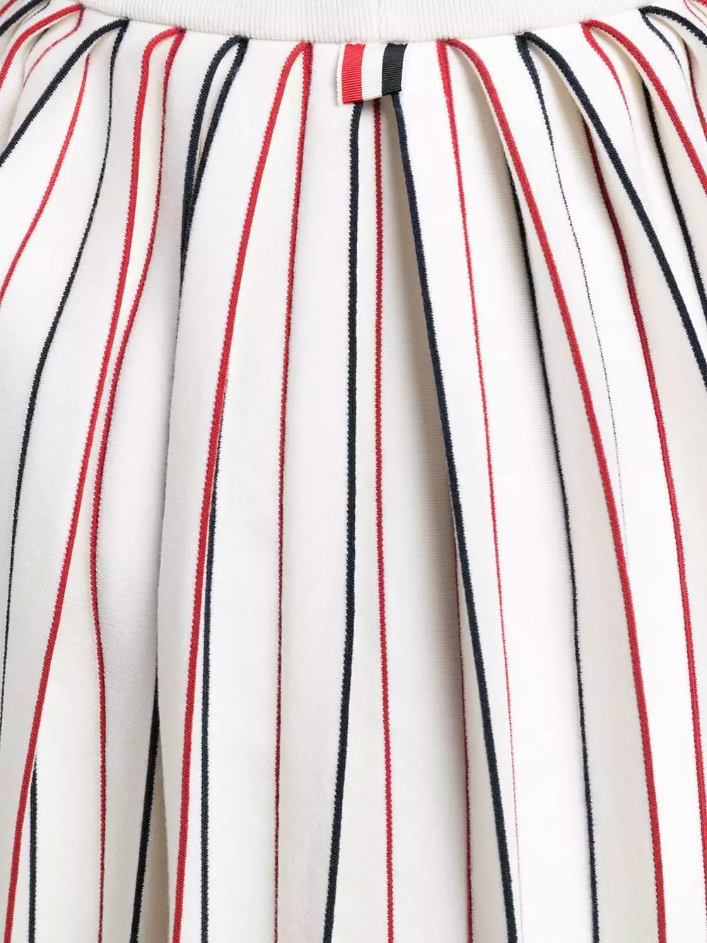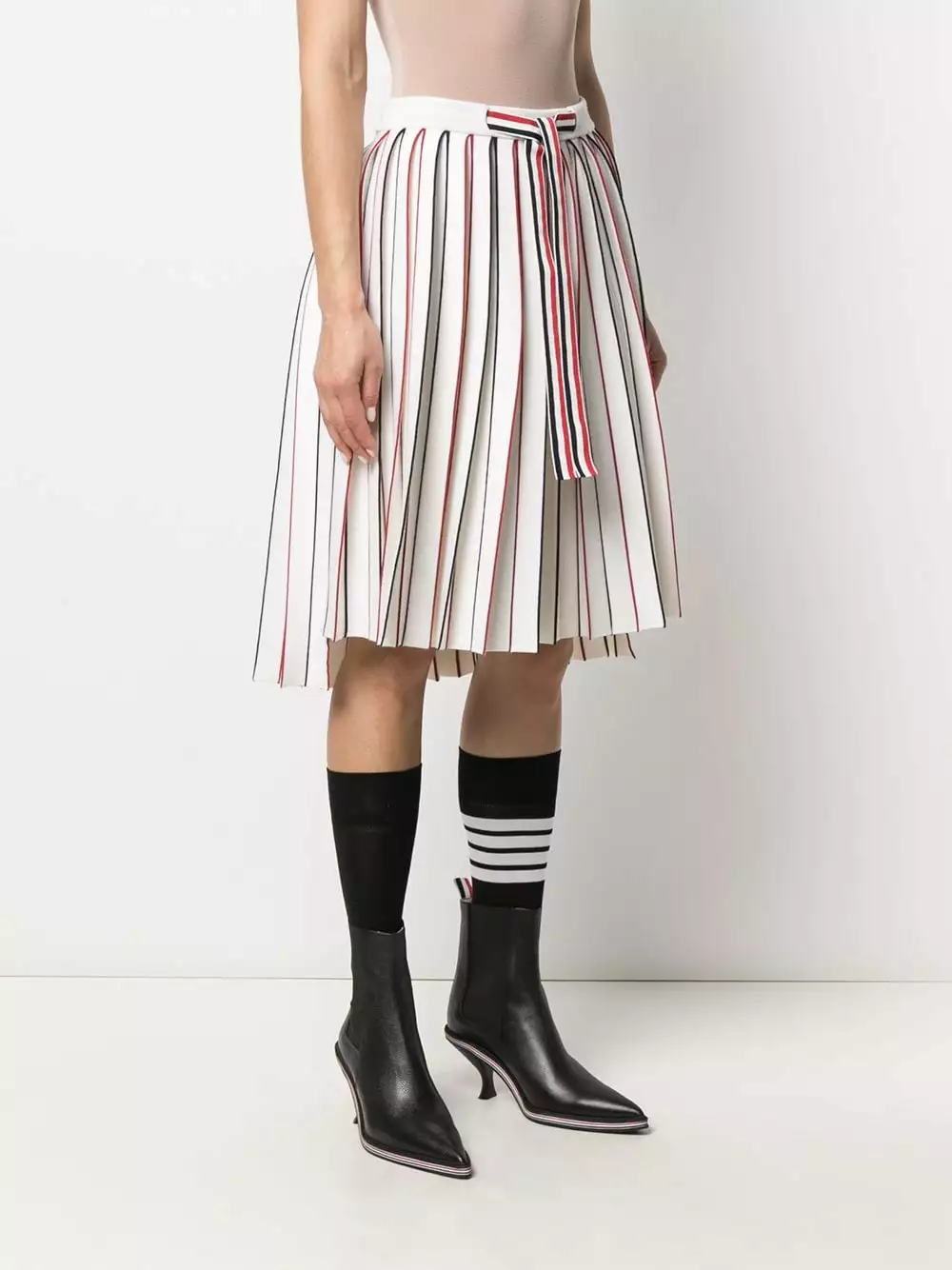 A preppy design, courtesy of Thom Browne. Crafted from stretch merino wool, this knife-pleat skirt features a vertical stripe pattern with the brand’s signature colours that will add a vibrant finishing touch to your outfit. Joyful.