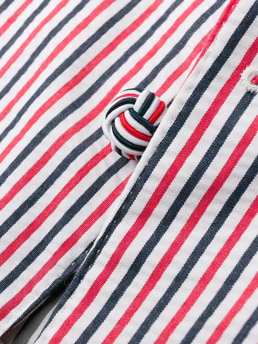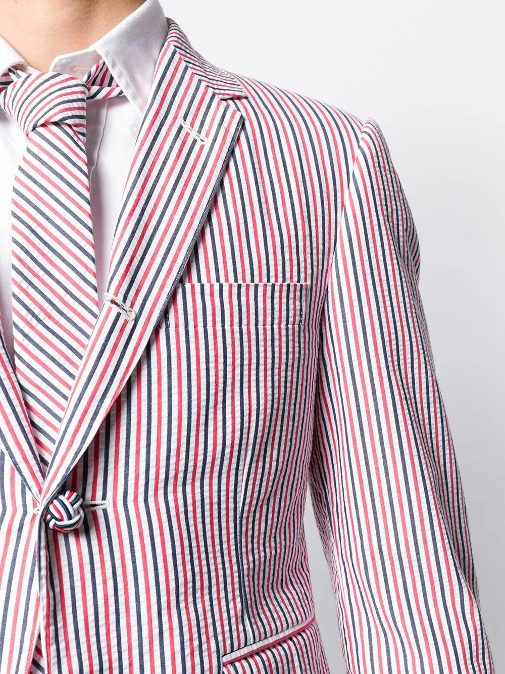 Launched in 2003, Thom Browne is internationally celebrated for its clean-cut silhouettes and couture-like sensibilities, as seen in this navy blue, red and white cotton RWB seersucker striped sport blazer. Featuring long sleeves, a v-neck, a chest pocket, front pockets, a button fastening, button cuffs and a contrasting grosgrain tab at the rear.