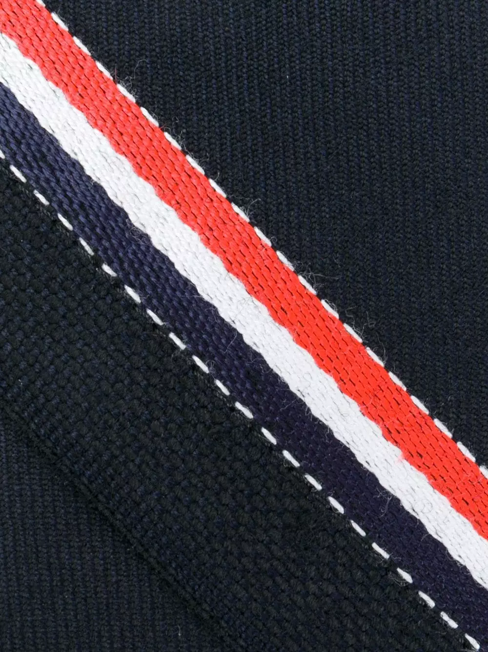 Acclaimed for his subtly deconstructed tailoring, Browne incorporates traditional craftsmanship techniques to modern transformations in men’s formalwear. Navy slim tie from Thom Browne featuring classic Thom Browne blue, white and red logo stripes.