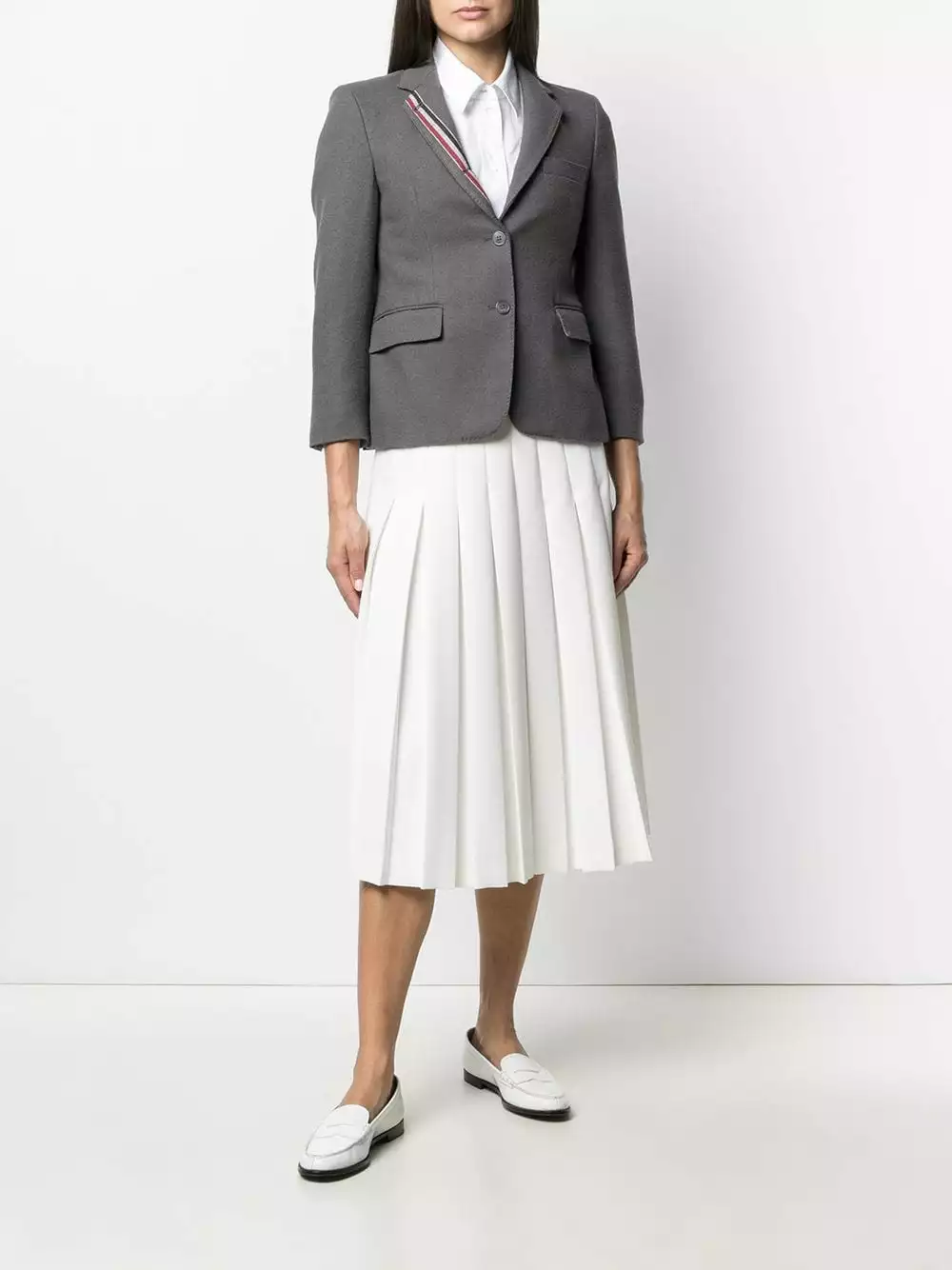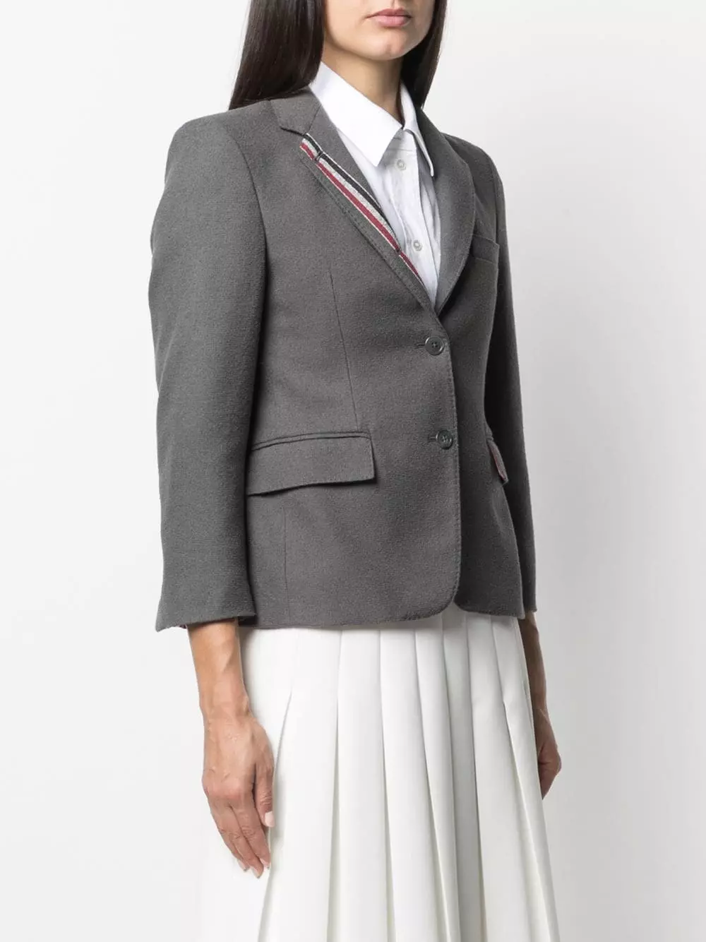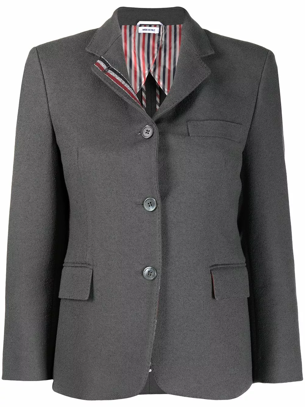 There’s no doubt what team you support. Constructed from dark grey cotton, this blazer from Thom Browne is adorned with the iconic RWB stripe along the collar that really sets the bar. Team Thom Browne forever.