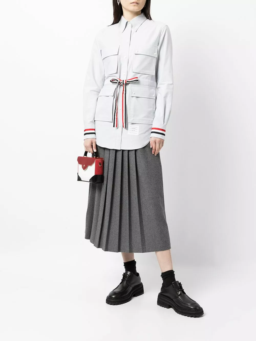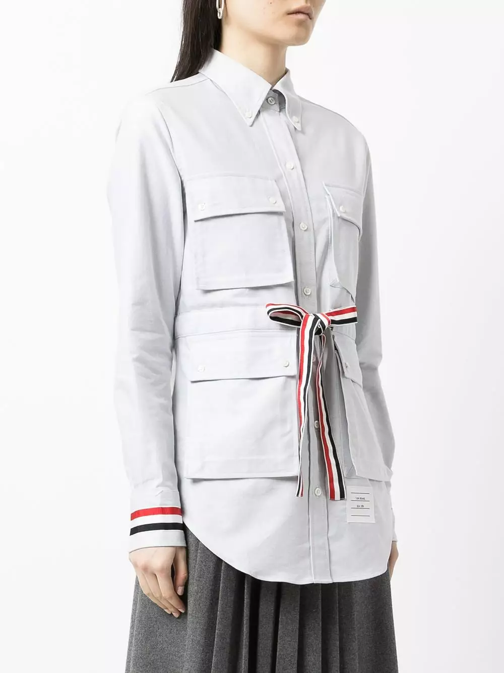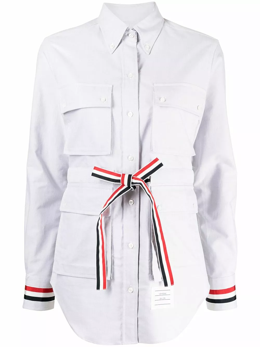 Thom Browne’s shirt riffs on classic military jackets. Featuring four flap pockets, it’s trimmed with the brand’s recognisable RWB stripe at the belted waist and cuffs.