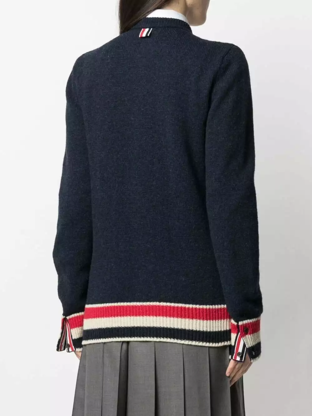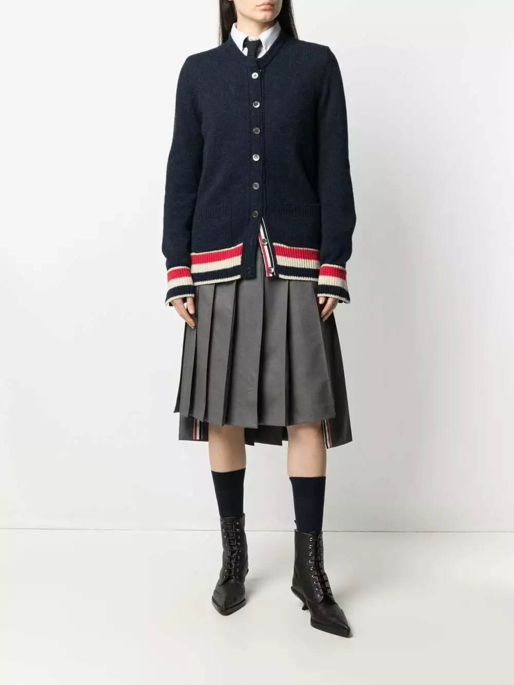 Next level knitwear. Boasting a classic round neck and the label’s signature RWB stripe at the hem, this chunky knit cardigan by Thom Browne is a welcome addition to any winter wardrobe.