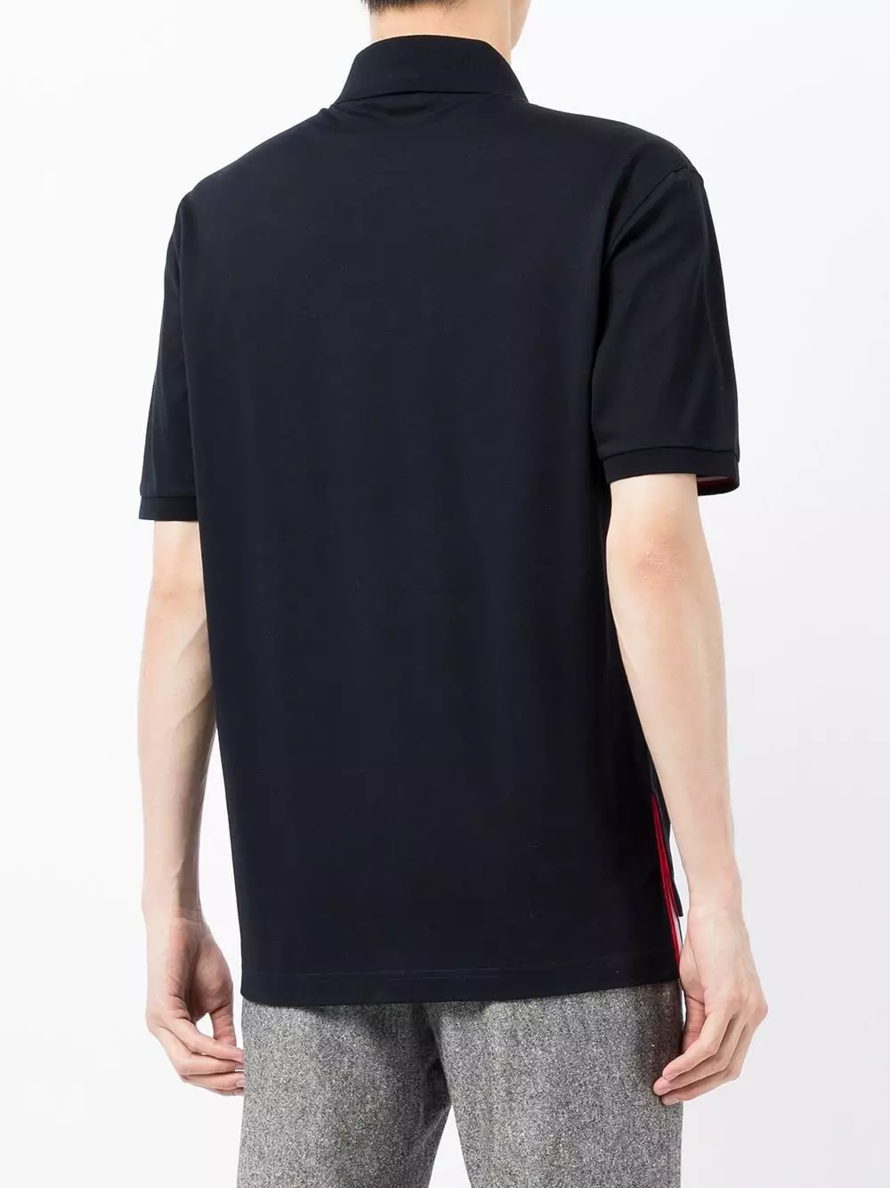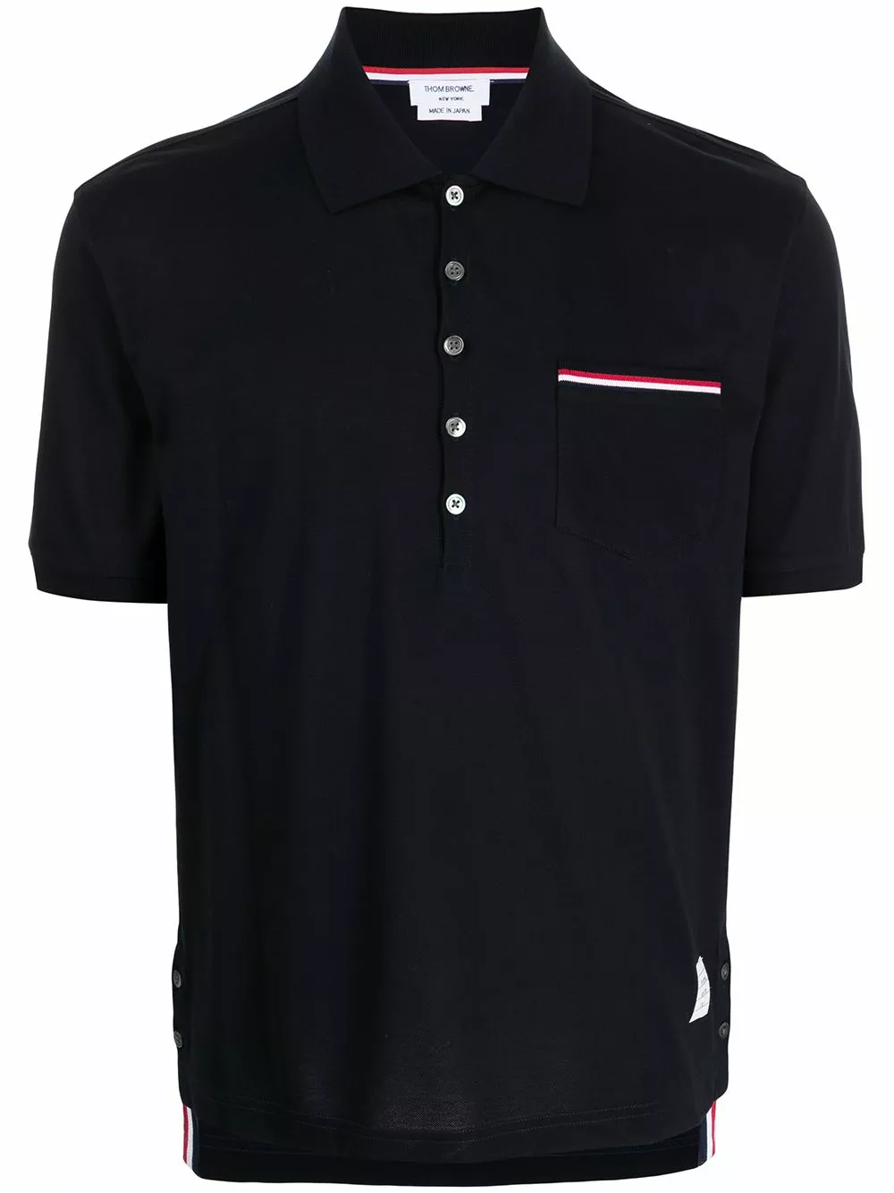 Thom Browne updates the classic polo shirt with signature details. This navy blue cotton piece has a chest patch pocket, trimmed with the brand’s iconic RWB stripe.
