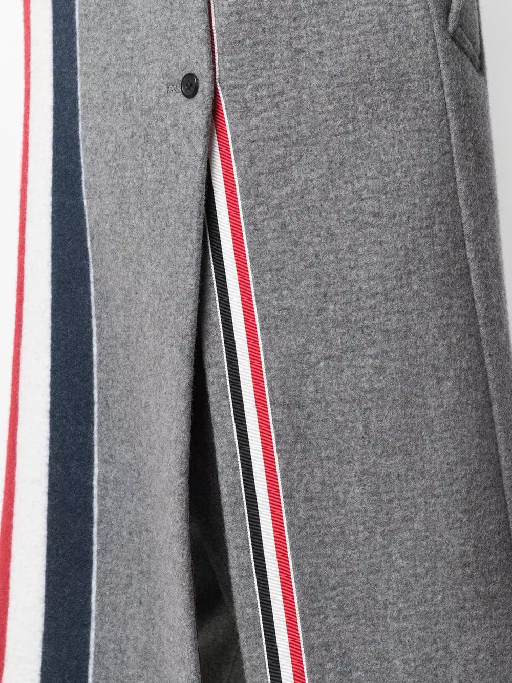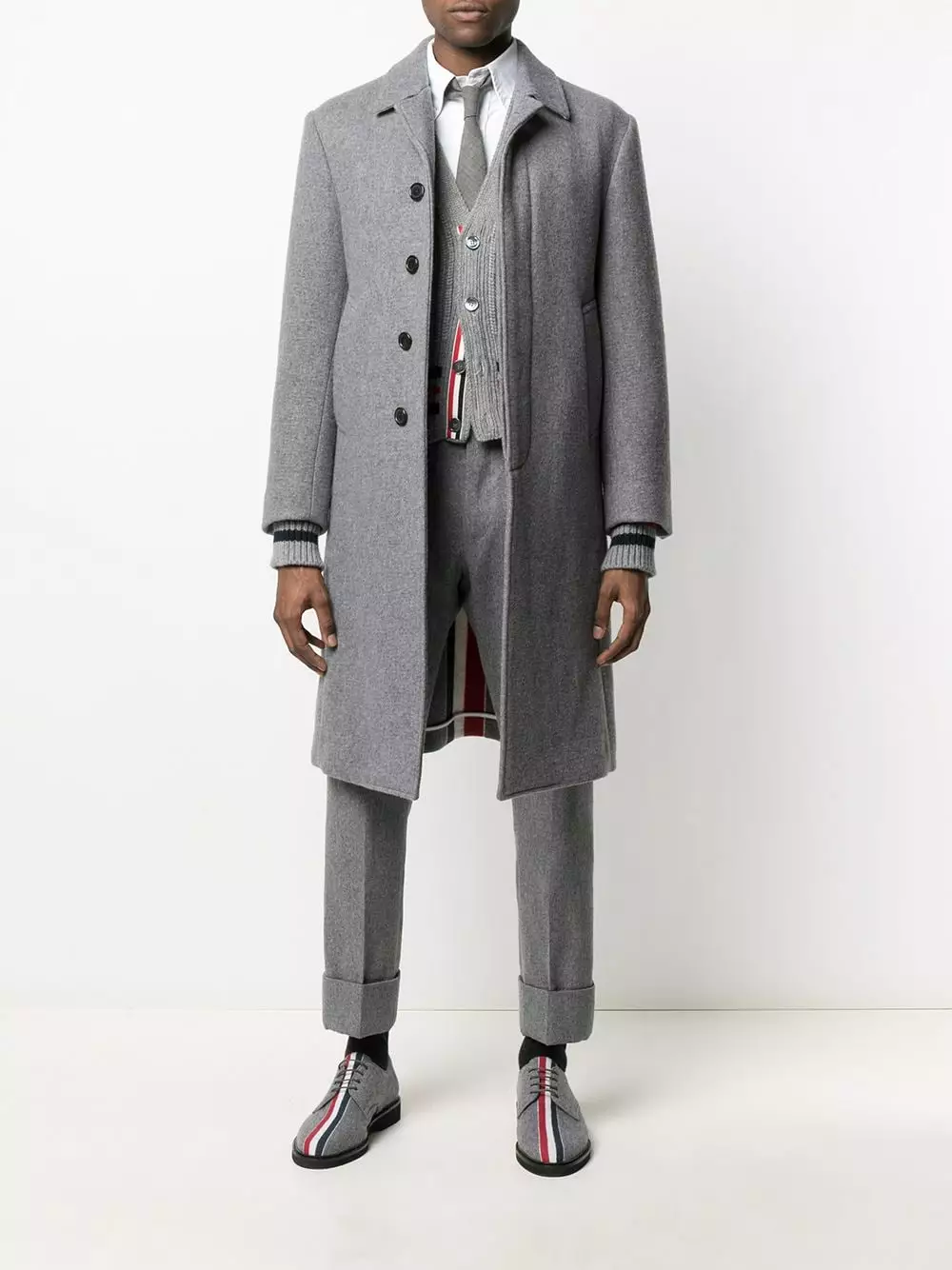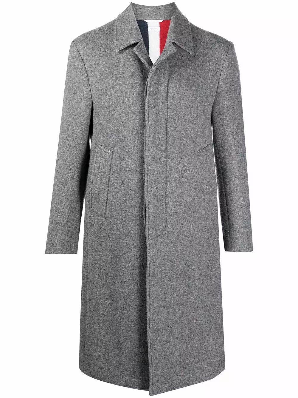 The weather outside might be frightful, but that doesn’t mean you can’t look delightful. In a medium grey hue with a RWB ribbon stripe to the rear, this tailored coat from Thom Browne is here to keep you layered up and looking your best.