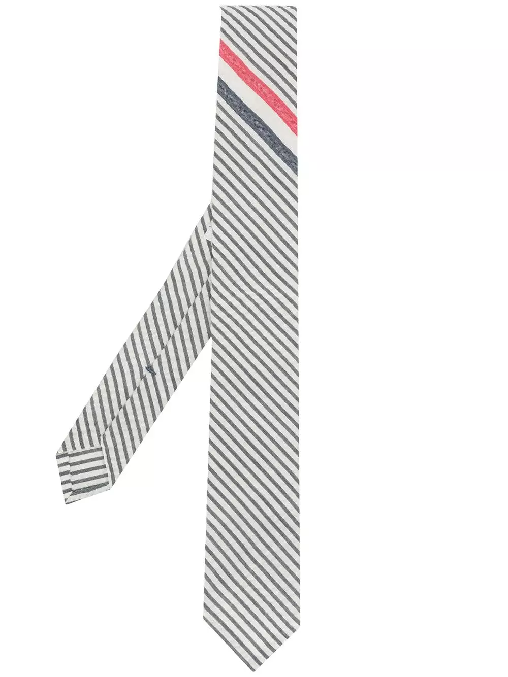 Thom Browne loves to play the reinvention game. Whether it to be classic suiting or comfortable sports-wear, the brand has a refreshed sense of style. Made in Italy, this medium grey wool RWB stripe point tip tie will put the pep back into your mid-week step (too much?). Featuring a pointed tip, an all-over diagonal striped design and the iconic tri-colour stripe to the front.