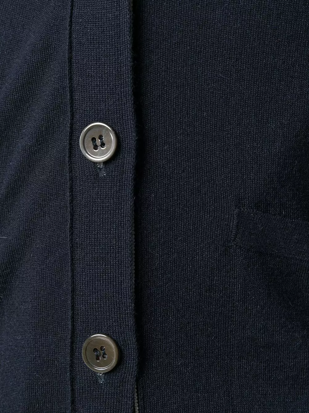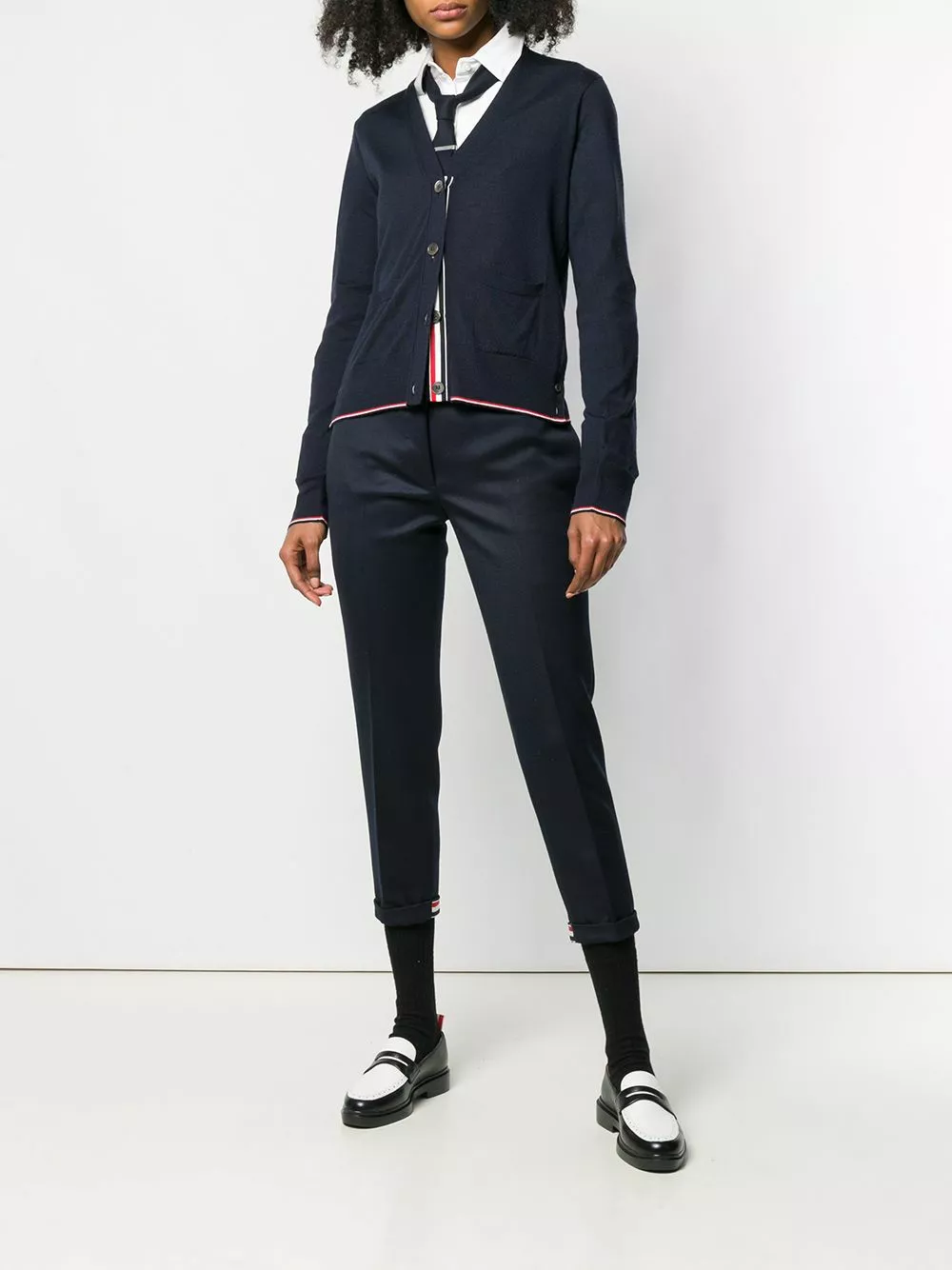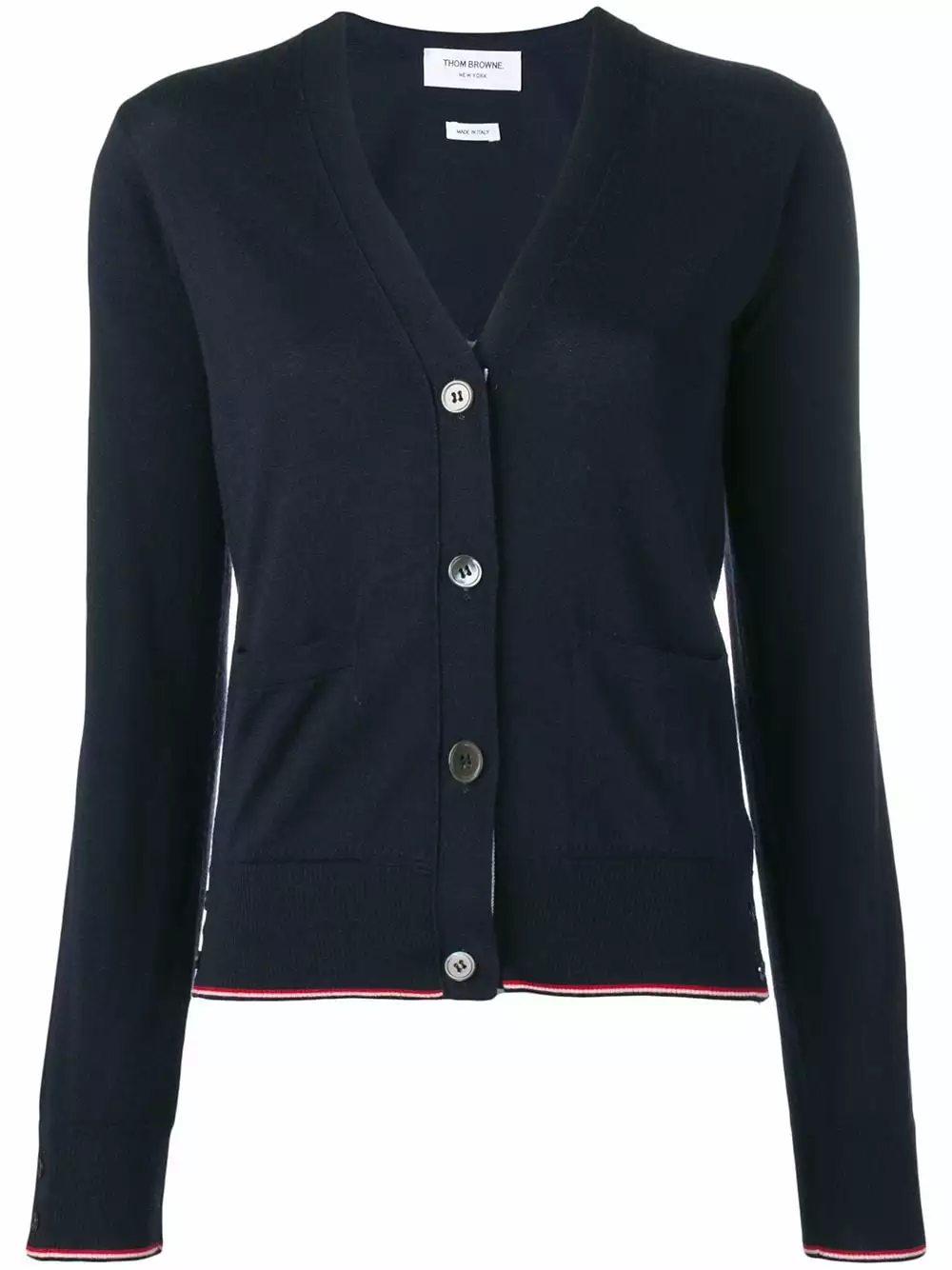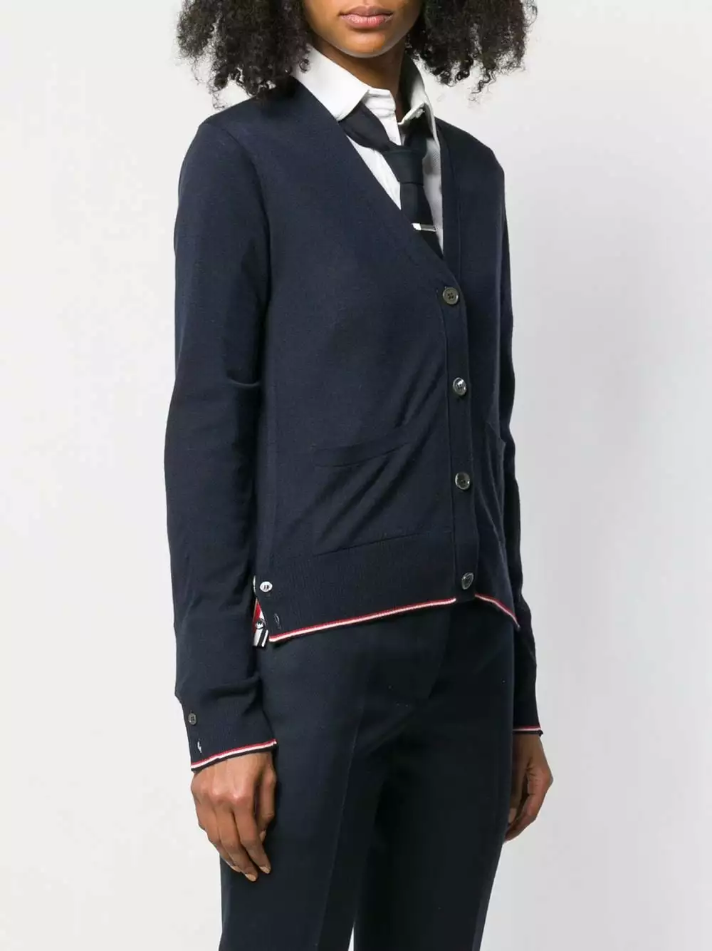 Keep your style on track even as the weather turns chilly. This RWB-detail Thom Browne cardigan is all you’ll want to pull on on those colder days. Get comfortable. Featuring a v-neck, a front button fastening, two front pockets, long sleeves, a ribbed hem and cuffs, button cuffs, a side button fastening, a signature grosgrain loop tab and RWB details.