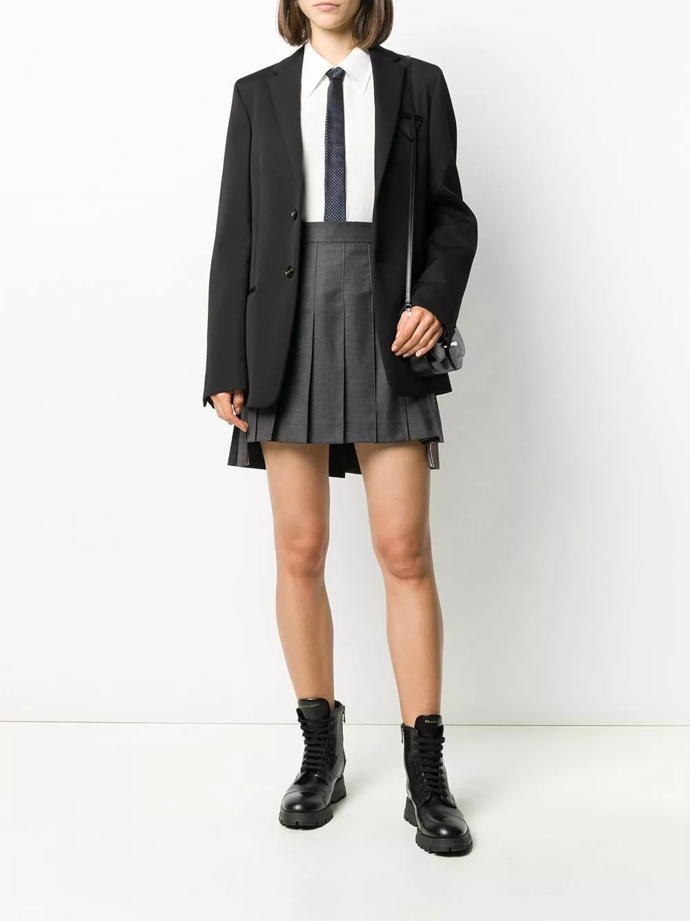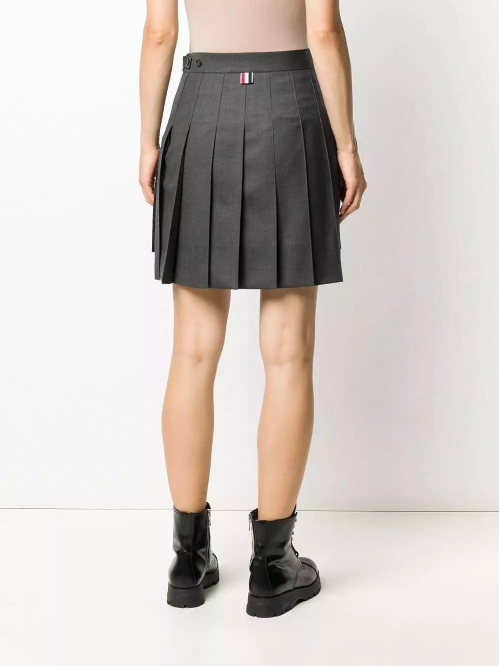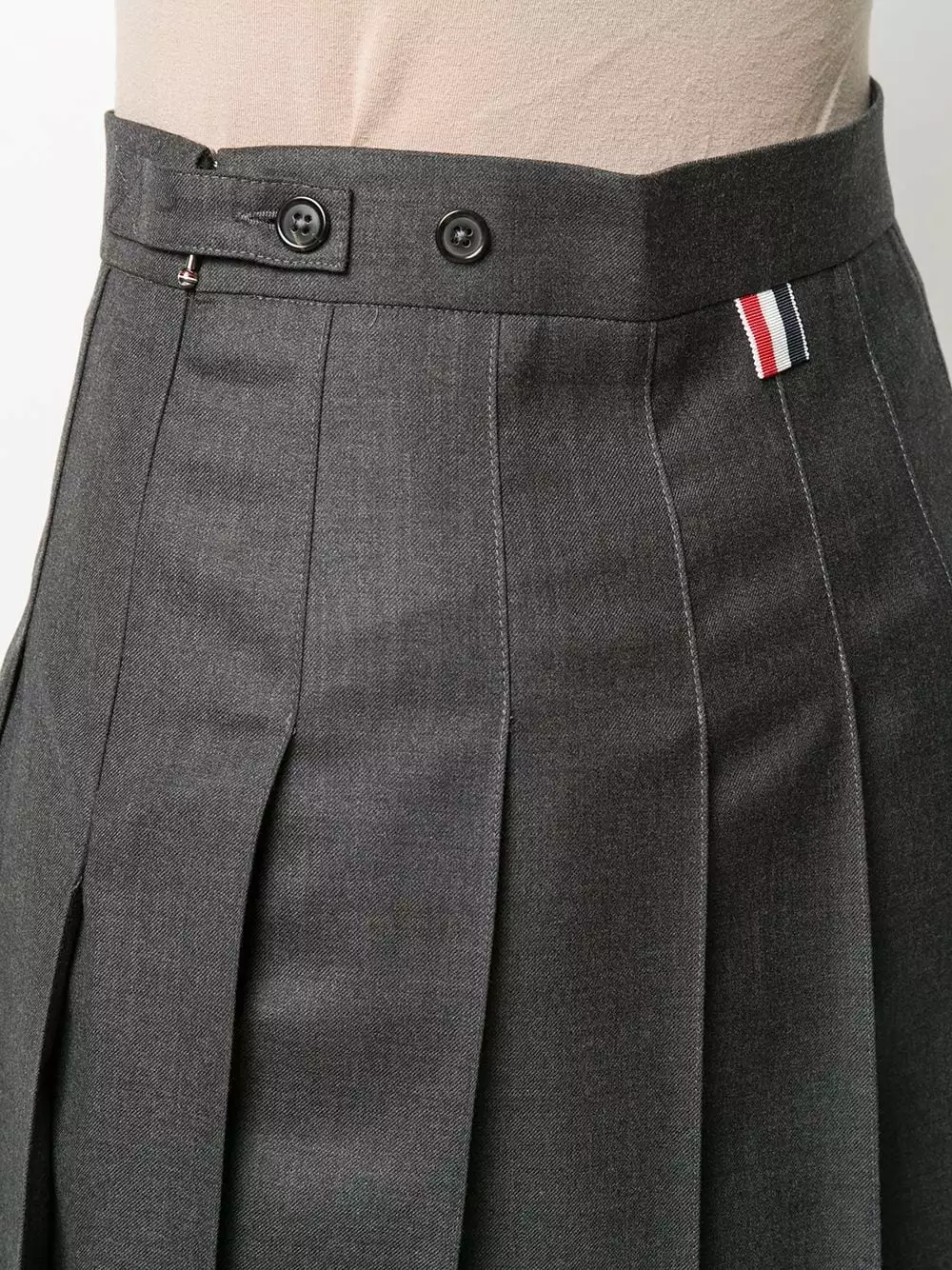 Dark grey wool School Uniform pleated skirt from THOM BROWNE featuring fully pleated, signature 4-Bar tab, high waist, side button fastening, side zip fastening and asymmetric hem.