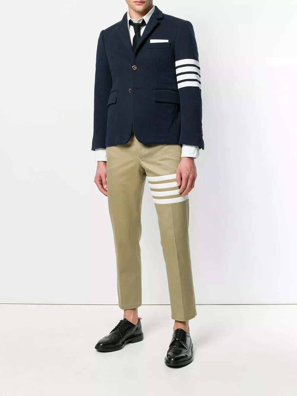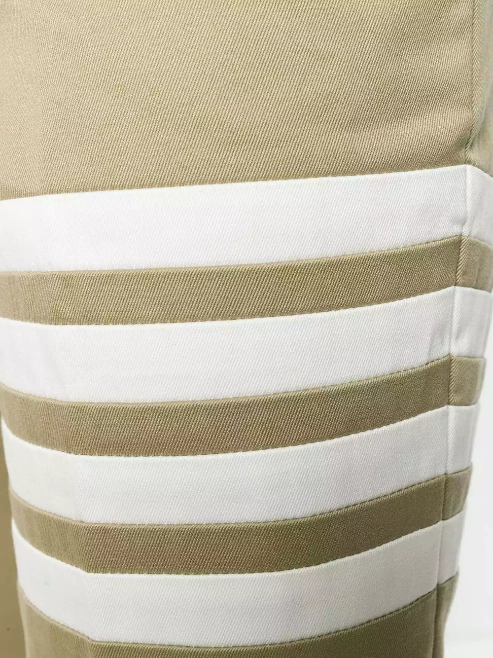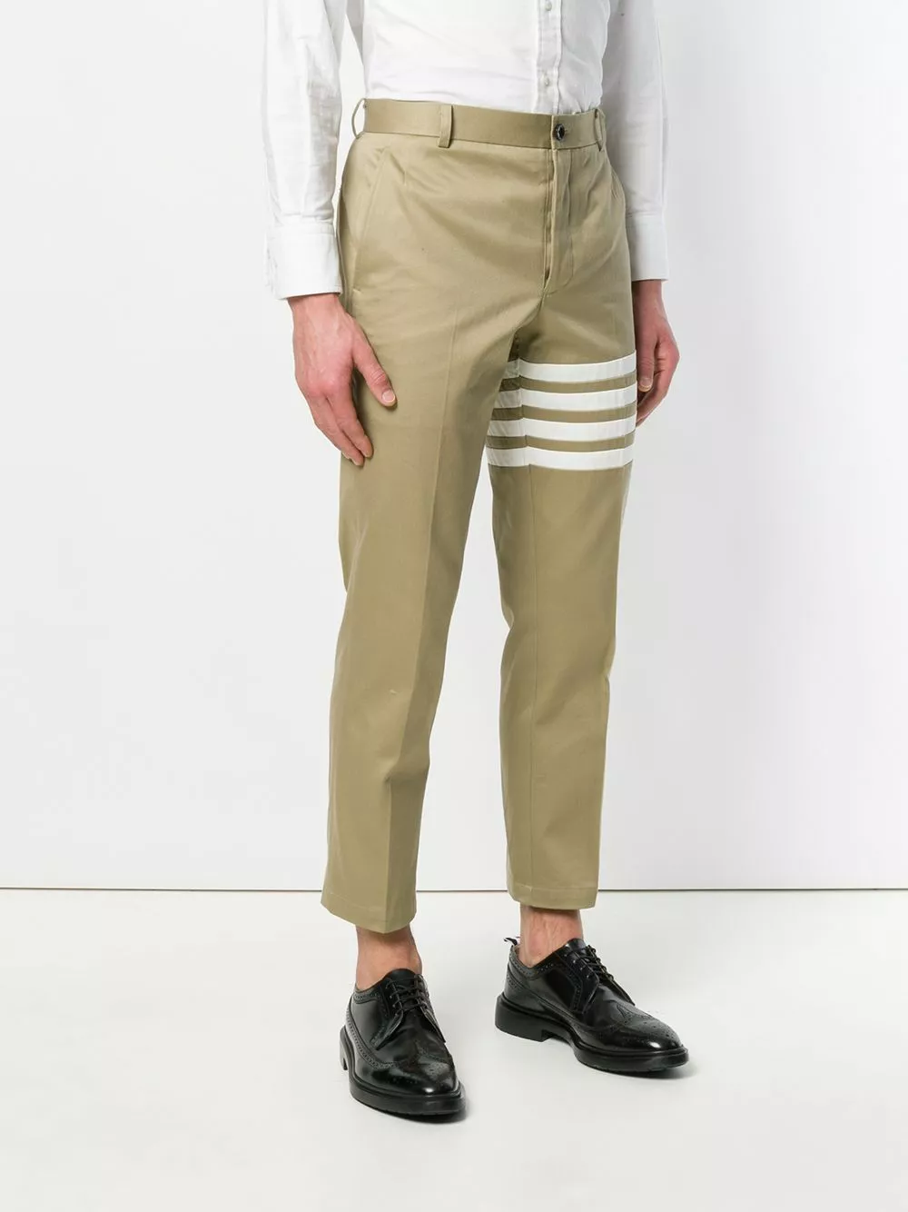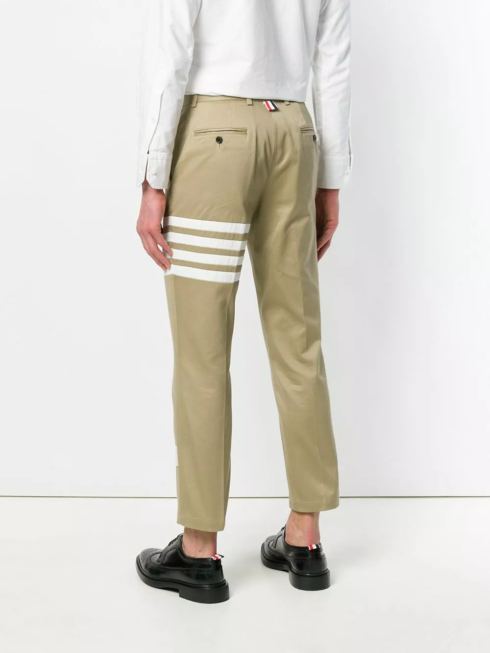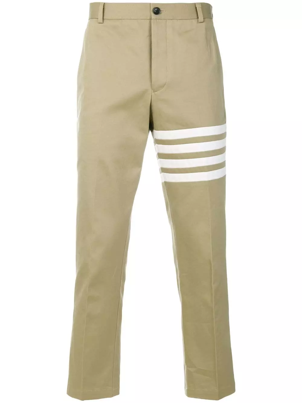 Combining highest-quality fabrics and a conservative sensibility with a touch of irreverence and humour, Thom Browne’s Autumn/Winter 2018 is full of modern must-haves. Crafted in Japan from beige cotton-twill accented with sporty stripes at the left leg, these immaculately tailored chinos feature a comfortable mid rise, a button and zip fly, a waistband with belt loops, side slit pockets, two back buttoned welt pockets and sharply pressed creases that highlight the slim, slightly cropped shape. Detailed with a front logo patch and a tricolour striped tab to the rear for an on-brand finish, style yours with a coordinating blazer and polished brogues for a modern take on smart-casual dressing.