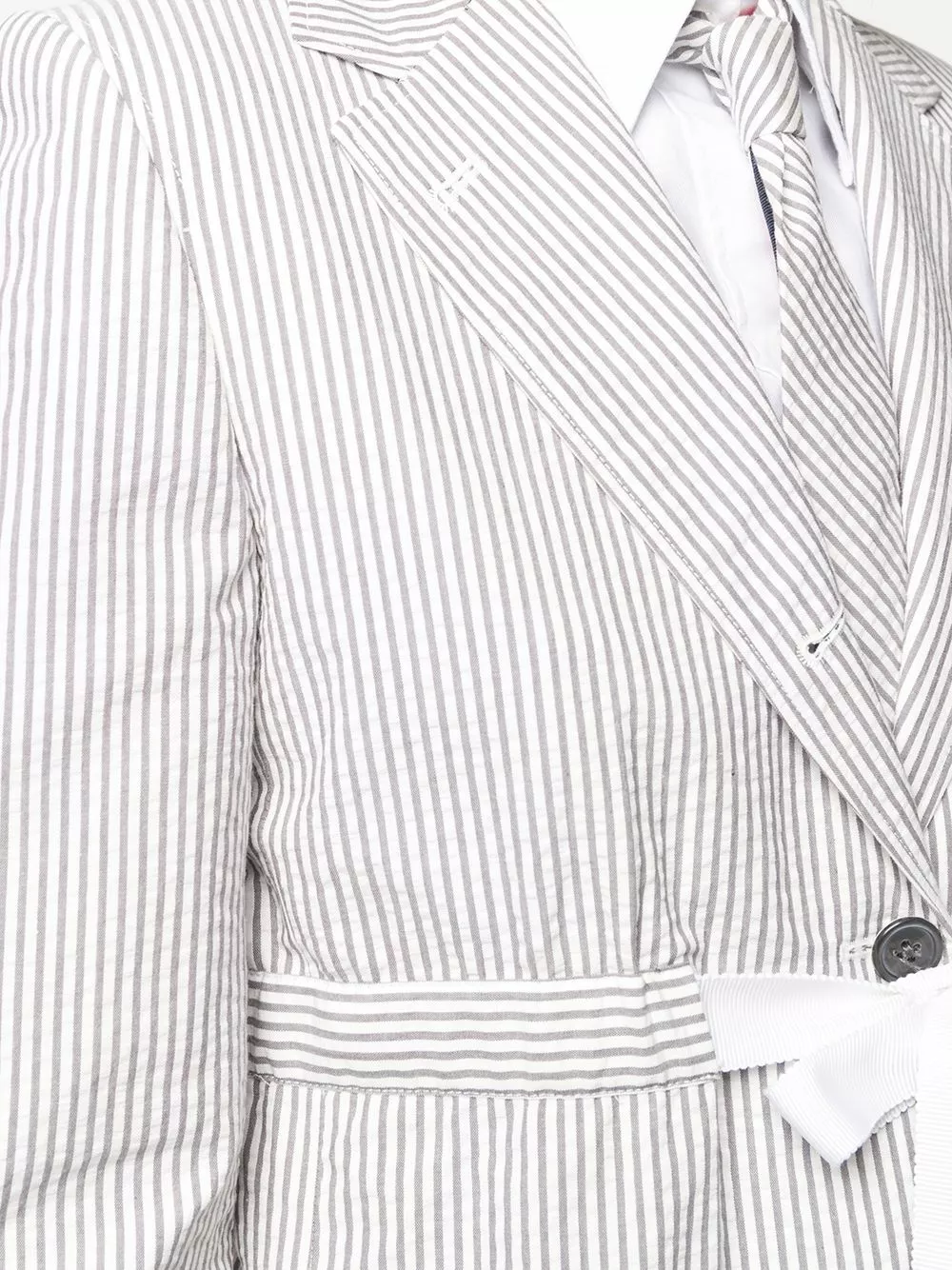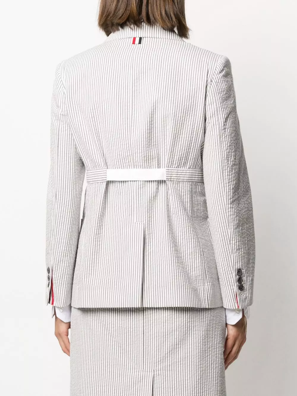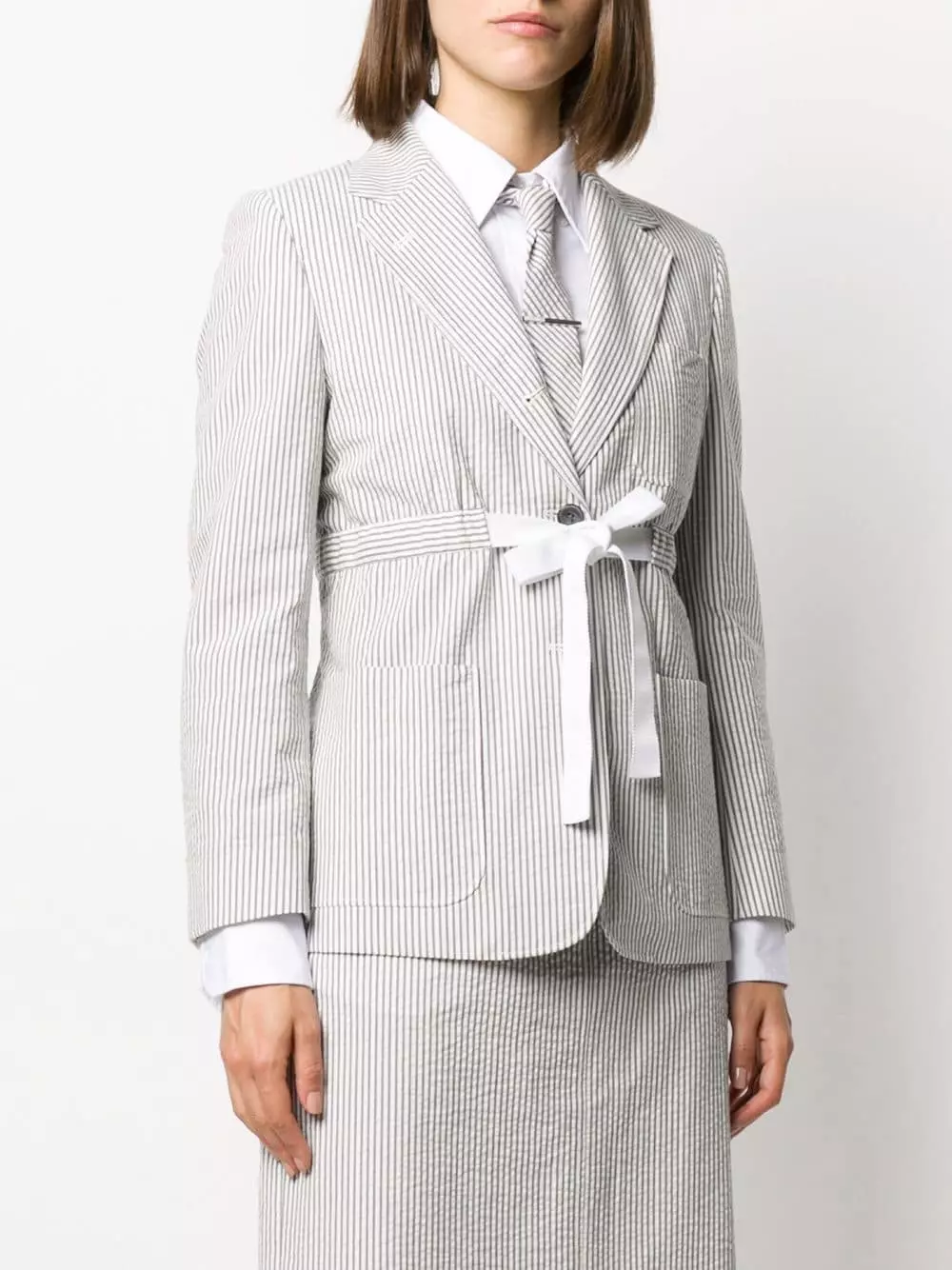 A tailored design and seersucker pattern? It has to be Thom Browne. Make this belted sack jacket your new uniform.