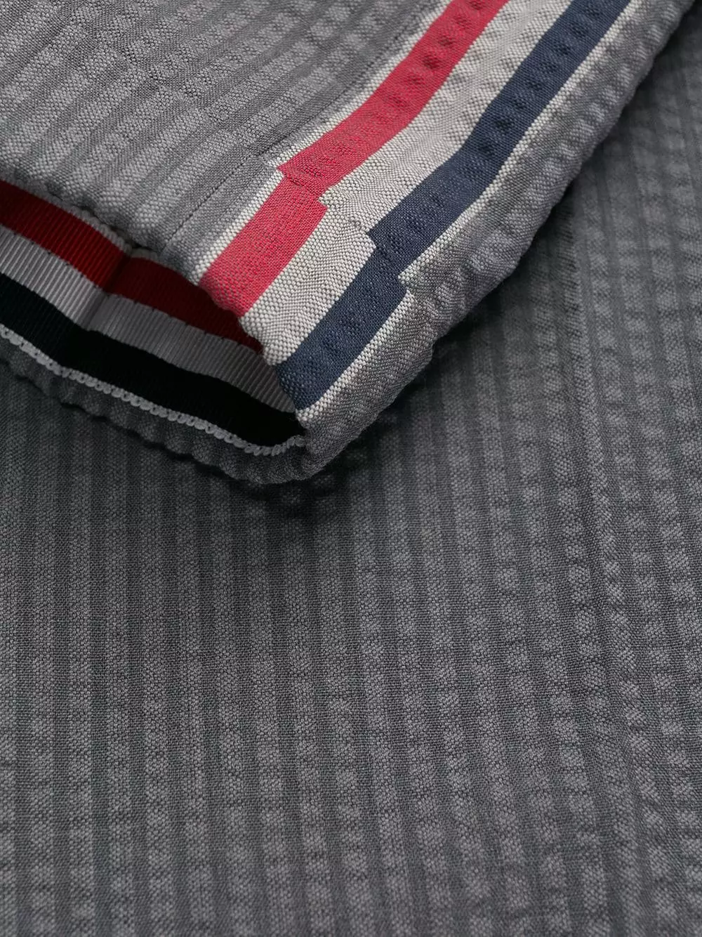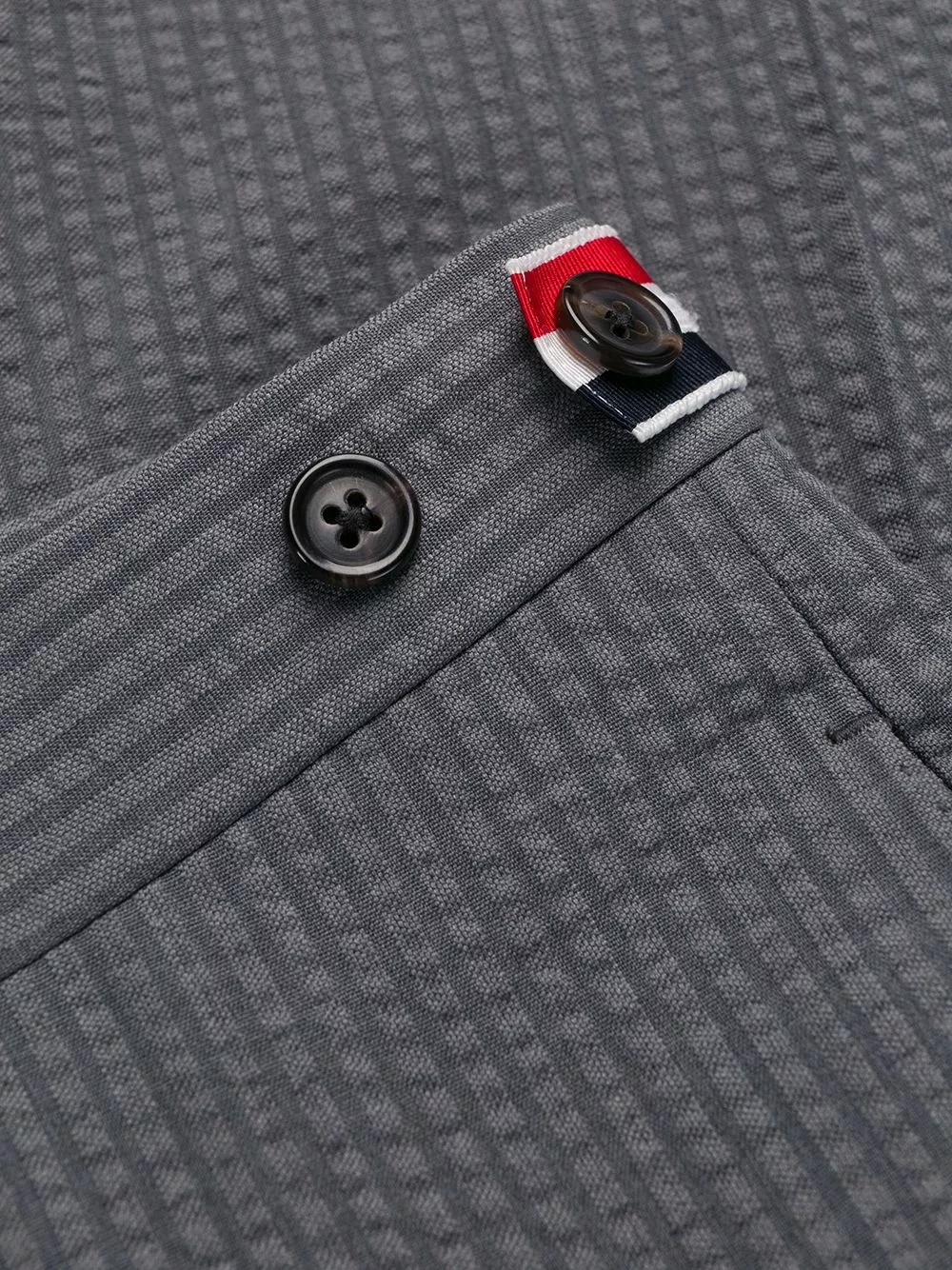Casual Fridays are a thing of the past. These dark grey wool seersucker low-rise trousers from Thom Browne will make you want to suit up every day of the week. Show them you mean business. Featuring a concealed front fastening, a slim fit, a low rise, a textured style, two back buttoned welt pockets, side slit pockets, a side button fastening and a signature tri-colour striped trim.