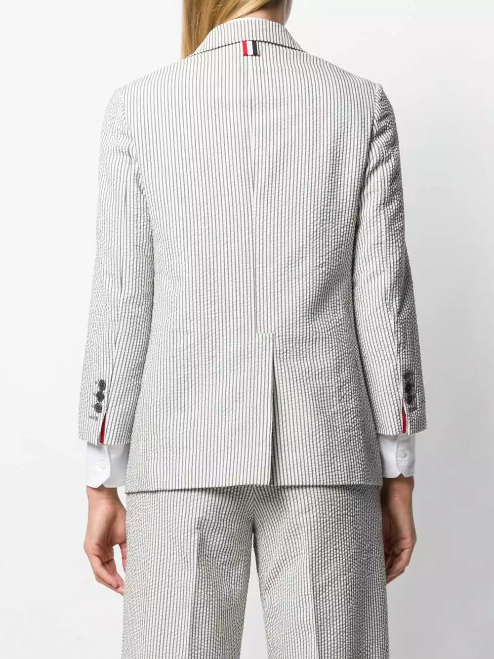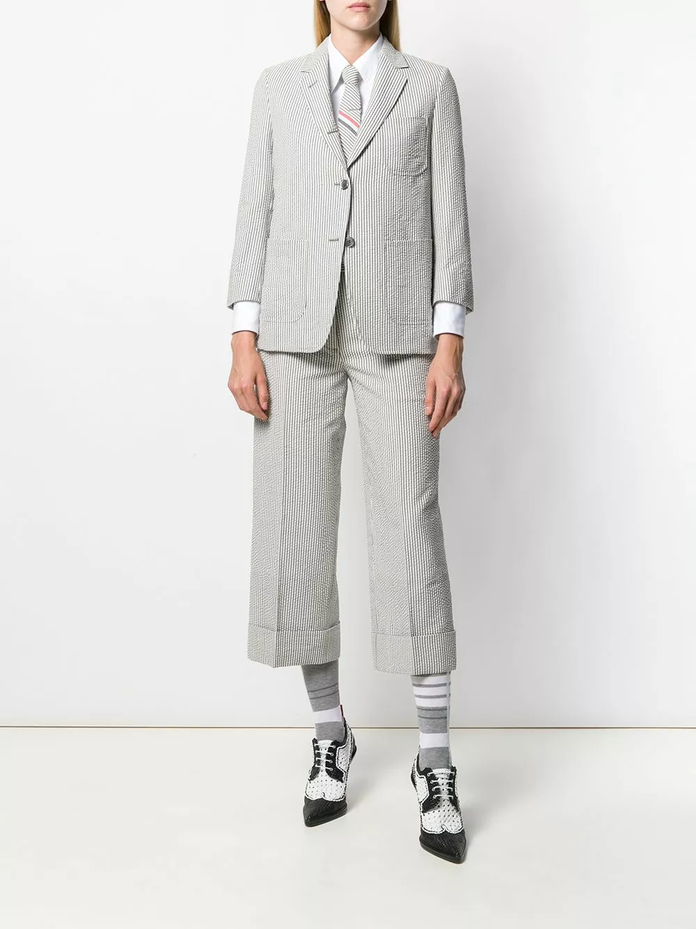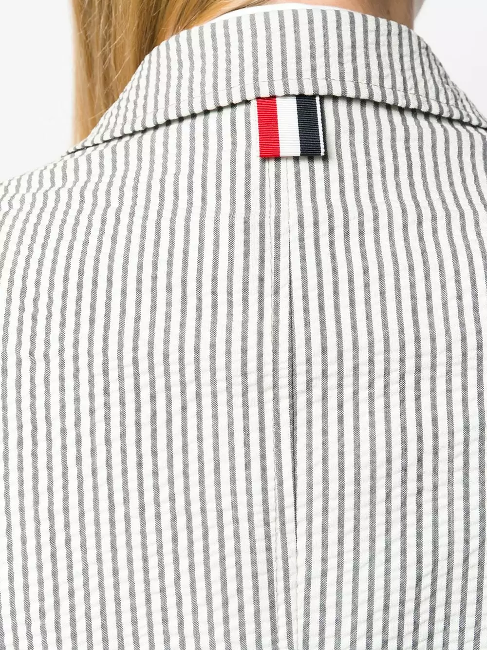 Those girls who look like they have their whole life together? Join their ranks by pulling on this grey and white striped tailored blazer from Thom Browne. Whether you do or not, you can look the part completely. Featuring classic lapels, a broad welt chest pocket, a front button fastening, a striped pattern, patch pockets, cropped sleeves and a signature grosgrain loop tab.