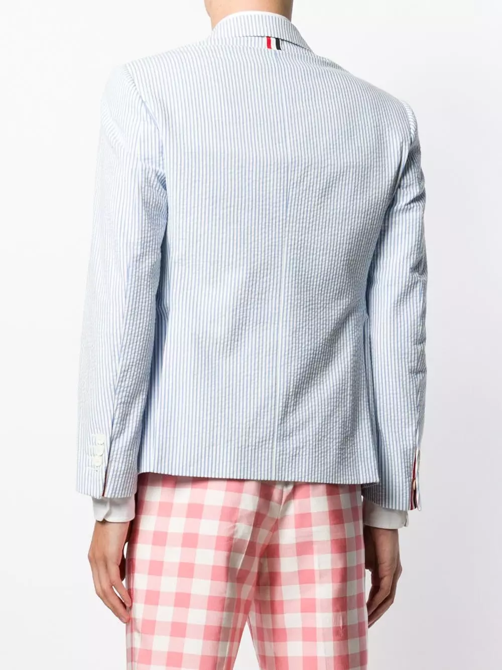 A lineup of investment pieces designed to withstand the test of time, Thom Browne’s Spring/Summer 2019 collection continues to blur the lines between refined tailoring and contemporary sportswear. Crafted from blue and white cotton, this seersucker sport coat features notched lapels, a front button fastening, long sleeves, button cuffs, a chest pocket, front flap pockets, a double vent to the rear, pinstripes, a fitted silhouette, a tricolour grosgrain tab on the rear and a signature striped lining.