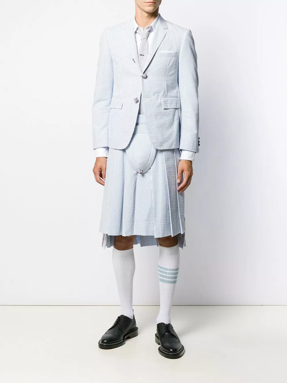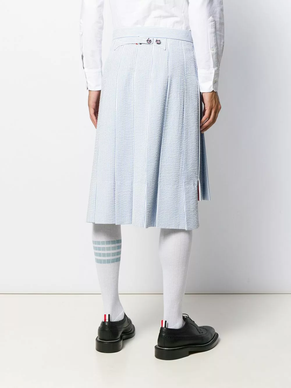 “They’re the type of items that I really hope and I do think will be in vintage stores in 20, 30 years” says Thom Browne about his innovative garments, widely recognised by many museums and style connoisseurs around the world. Crafted from blue cotton, this seersucker striped pleated skirt makes a quirky, yet refined statement. Featuring a signature three stripe detail, a fitted waist and front panel covering.