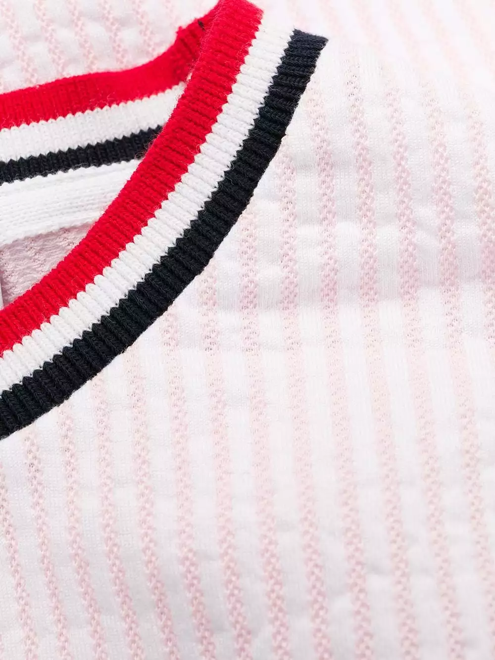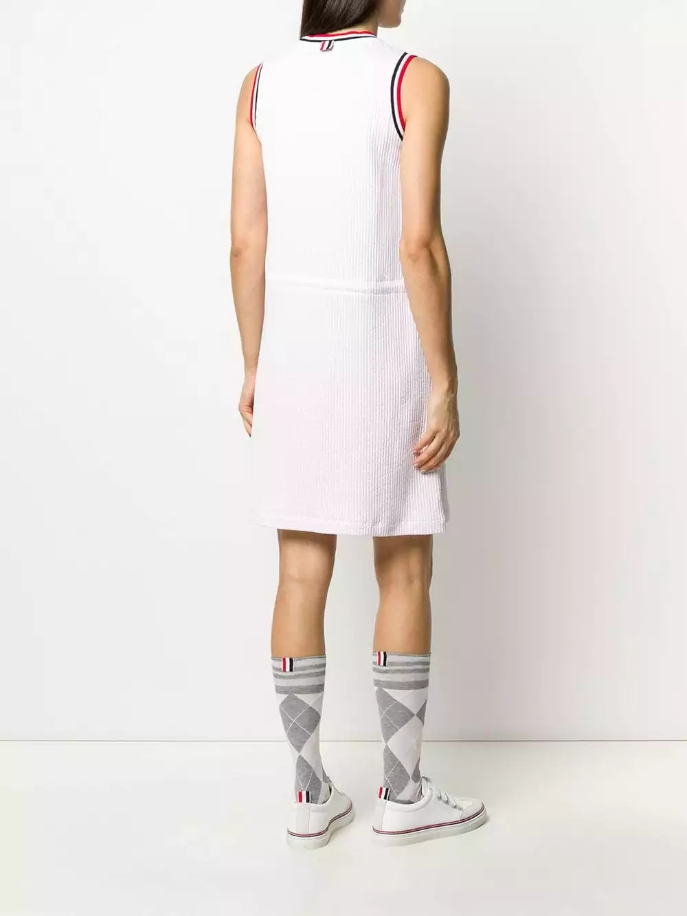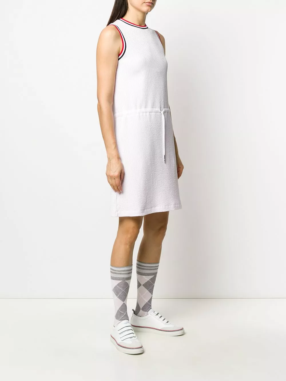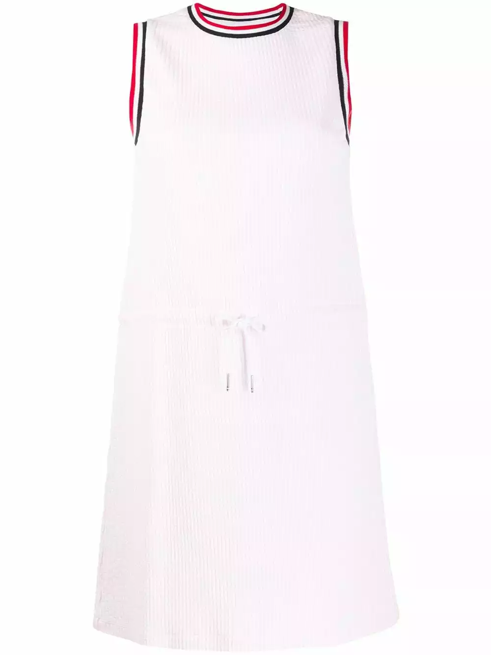 Keep yourself sporty and stylish all the time with this cool light pink cotton seersucker striped sleeveless dress from Thom Browne. Simple, but undoubtedly a statement piece. Featuring a round neck, a contrasting collar, a drawstring waist, a sleeveless design, a ribbed knit, a mid-length and a logo tag.