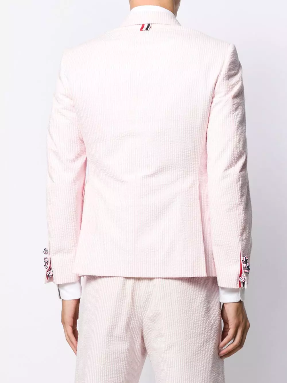 “They’re the type of items that I really hope and I do think will be in vintage stores in 20, 30 years” says Thom Browne about his innovative garments, widely recognised by many museums and style connoisseurs around the world. Presented in seersucker-textured cotton, this striped sports blazer features notched lapels, button cuffs, a button fastening, front flap pockets, a seersucker texture and signature tricolour striped buttons.