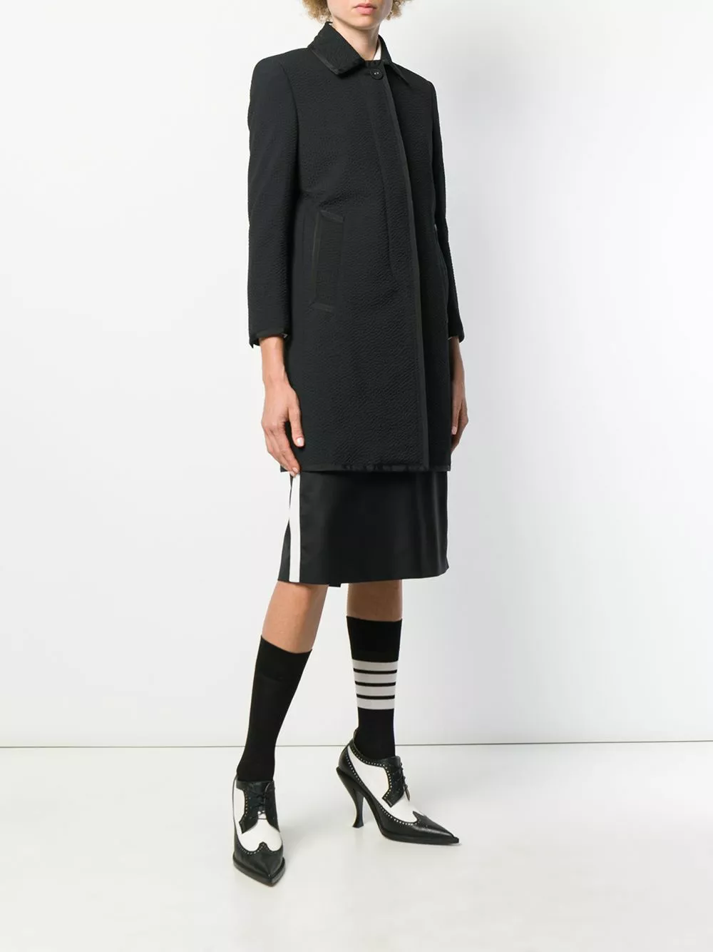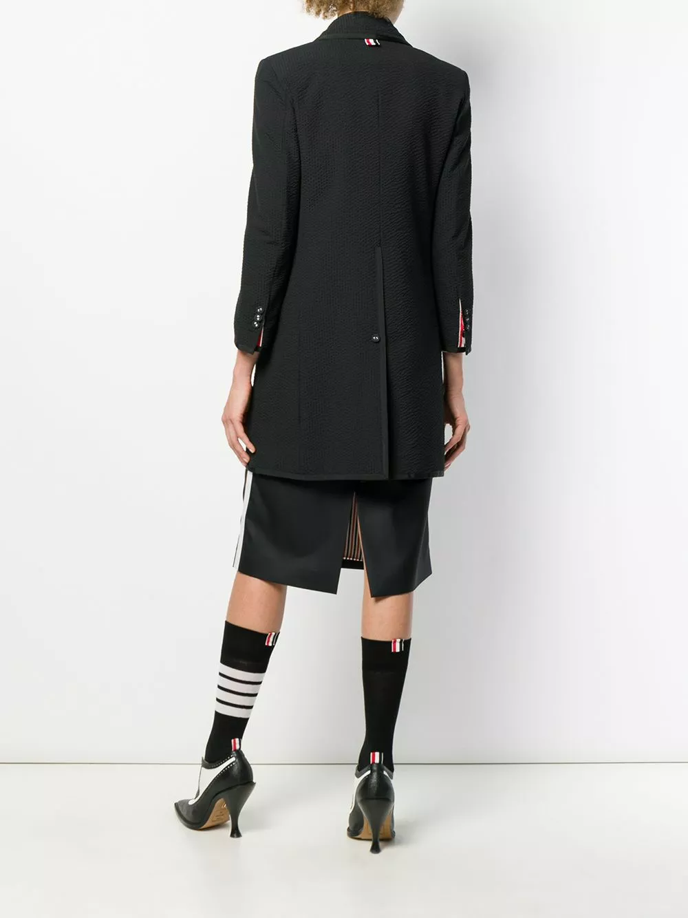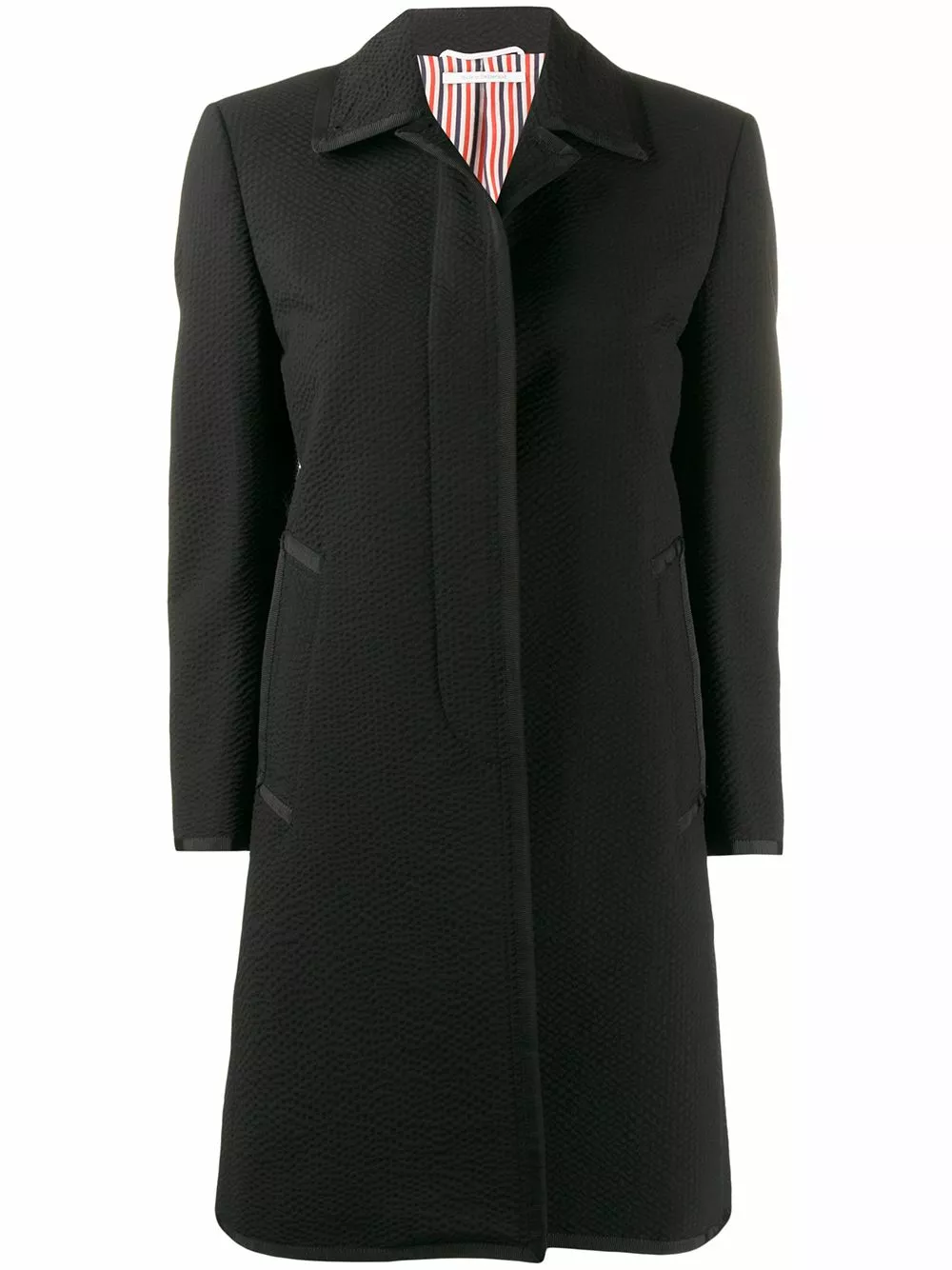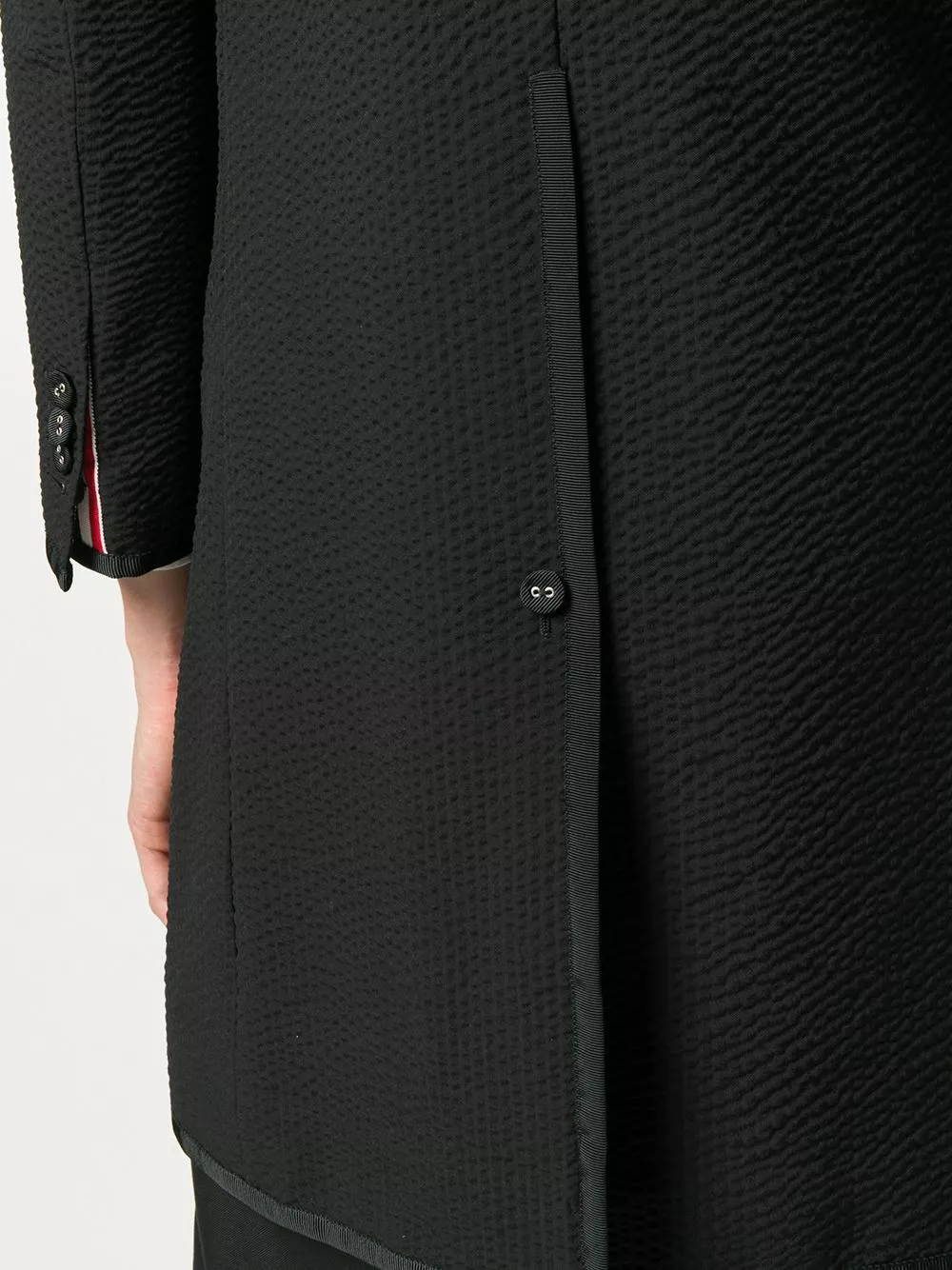 Imagine a life where looking good every time you leave the house is effortless. Then, pull on this seersucker Thom Browne wool overcoat and watch that dream come true. It’s like magic! Featuring a classic collar, a concealed front fastening, cropped sleeves, two front pockets, a rear central vent, a printed lining and a signature grosgrain loop tab.