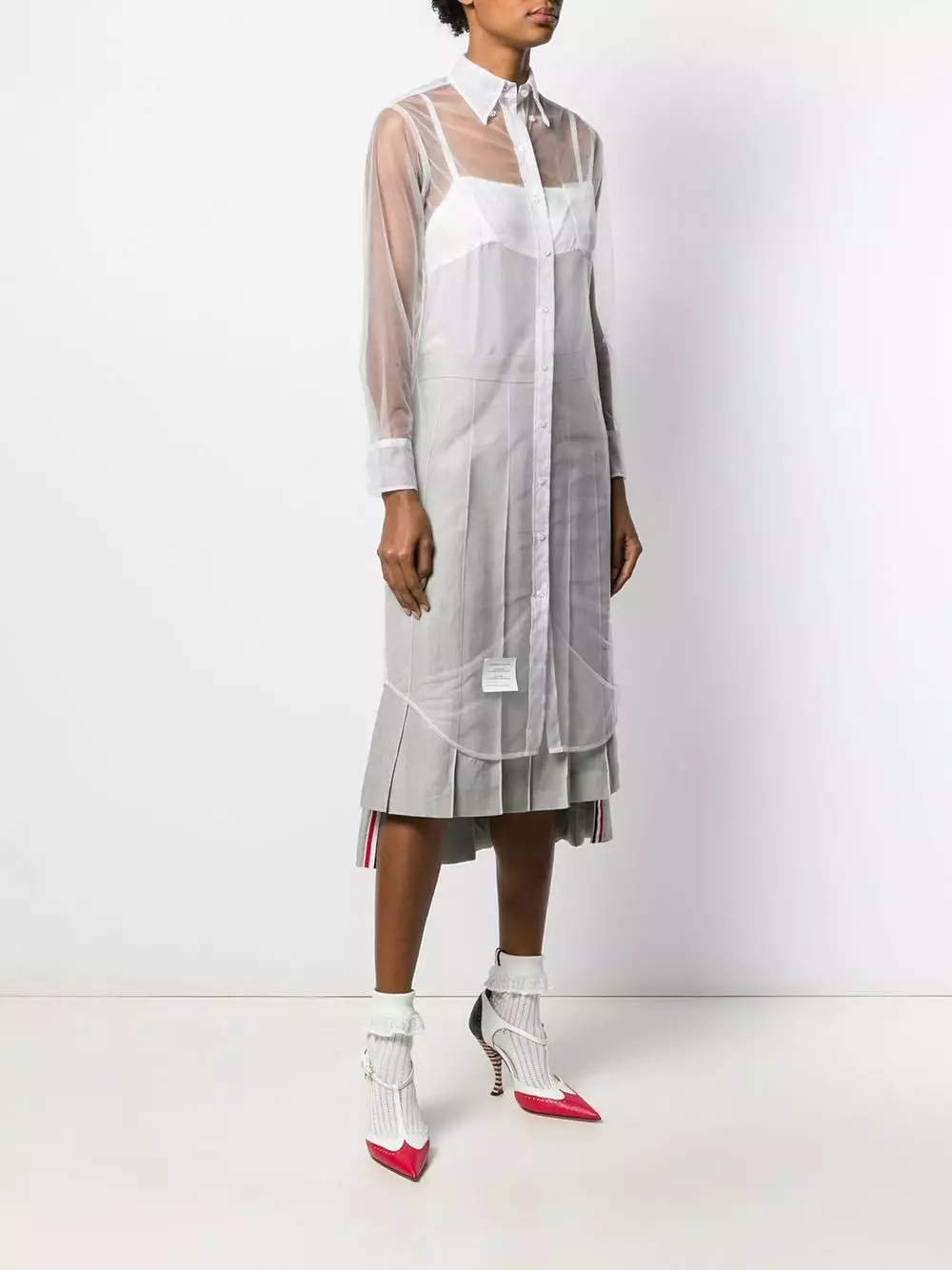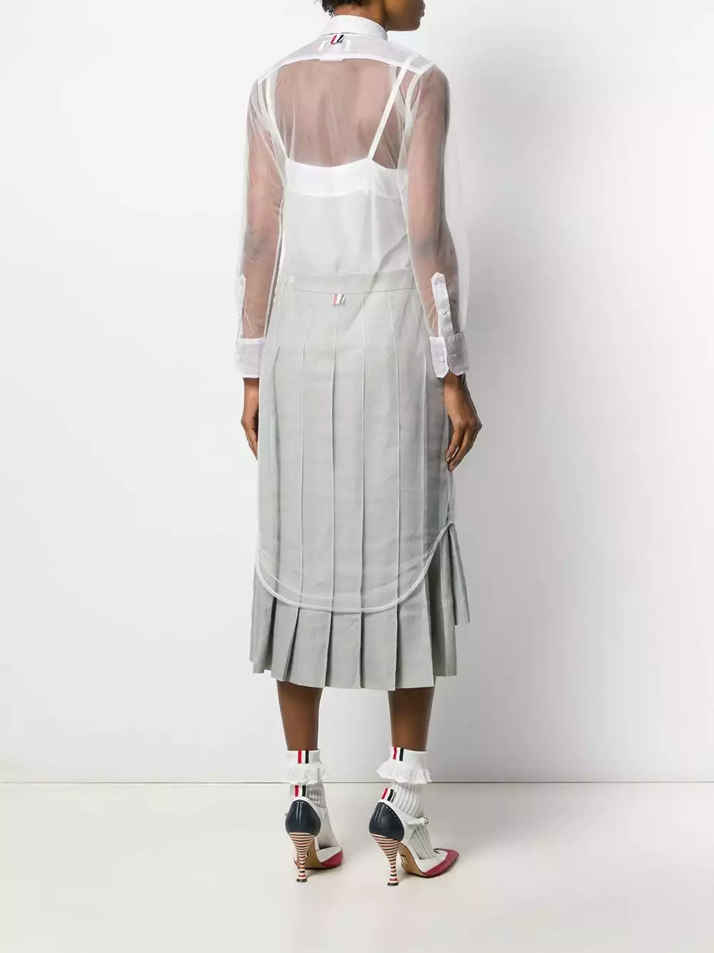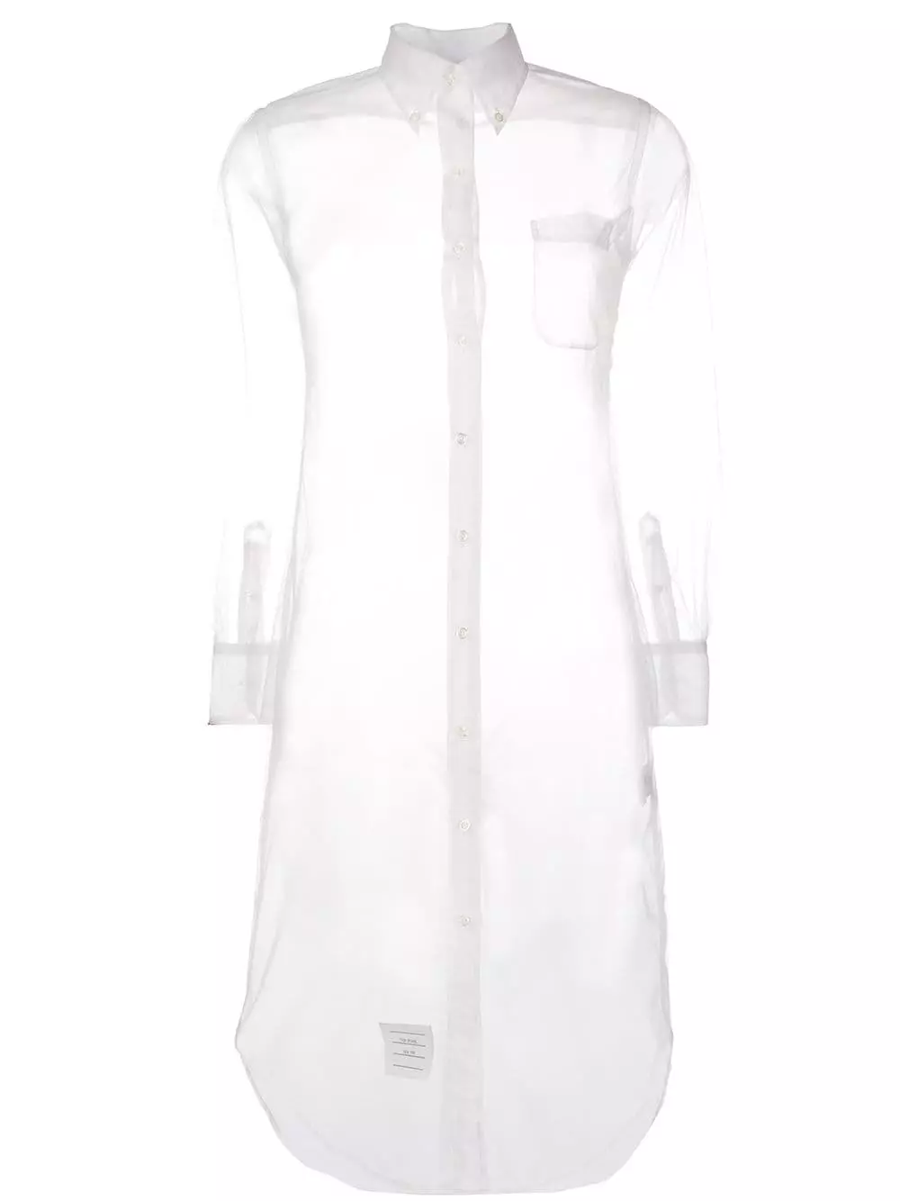 Add an unexpected layer to your look. The sheer design of this shirt lets the tailoring shine through. Thom Browne updates a traditional style in an unexpected way. Featuring a button collar, a signature three stripe detail, a front button fastening, a sheer construction, long sleeves, button cuffs and a mid-length.