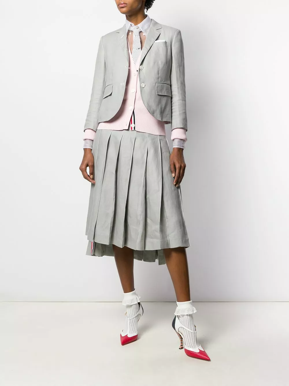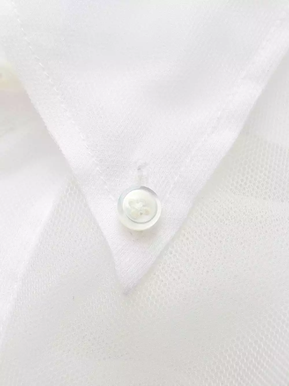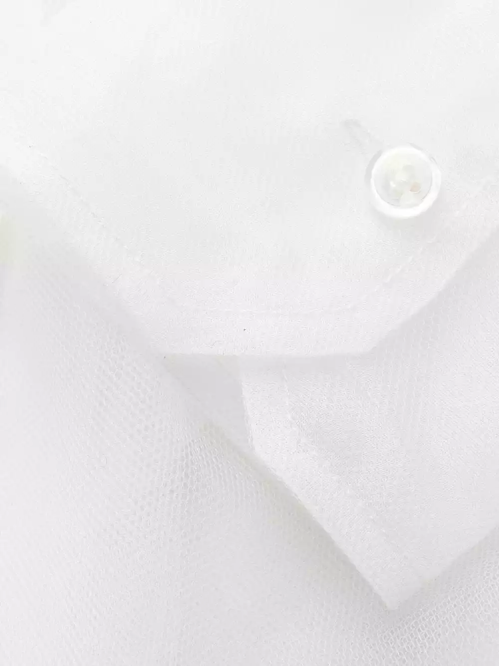 Add an unexpected layer to your look. The sheer design of this shirt lets the tailoring shine through. Thom Browne updates a traditional style in an unexpected way. Featuring a button collar, a signature three stripe detail, a front button fastening, a sheer construction, long sleeves, button cuffs and a mid-length.