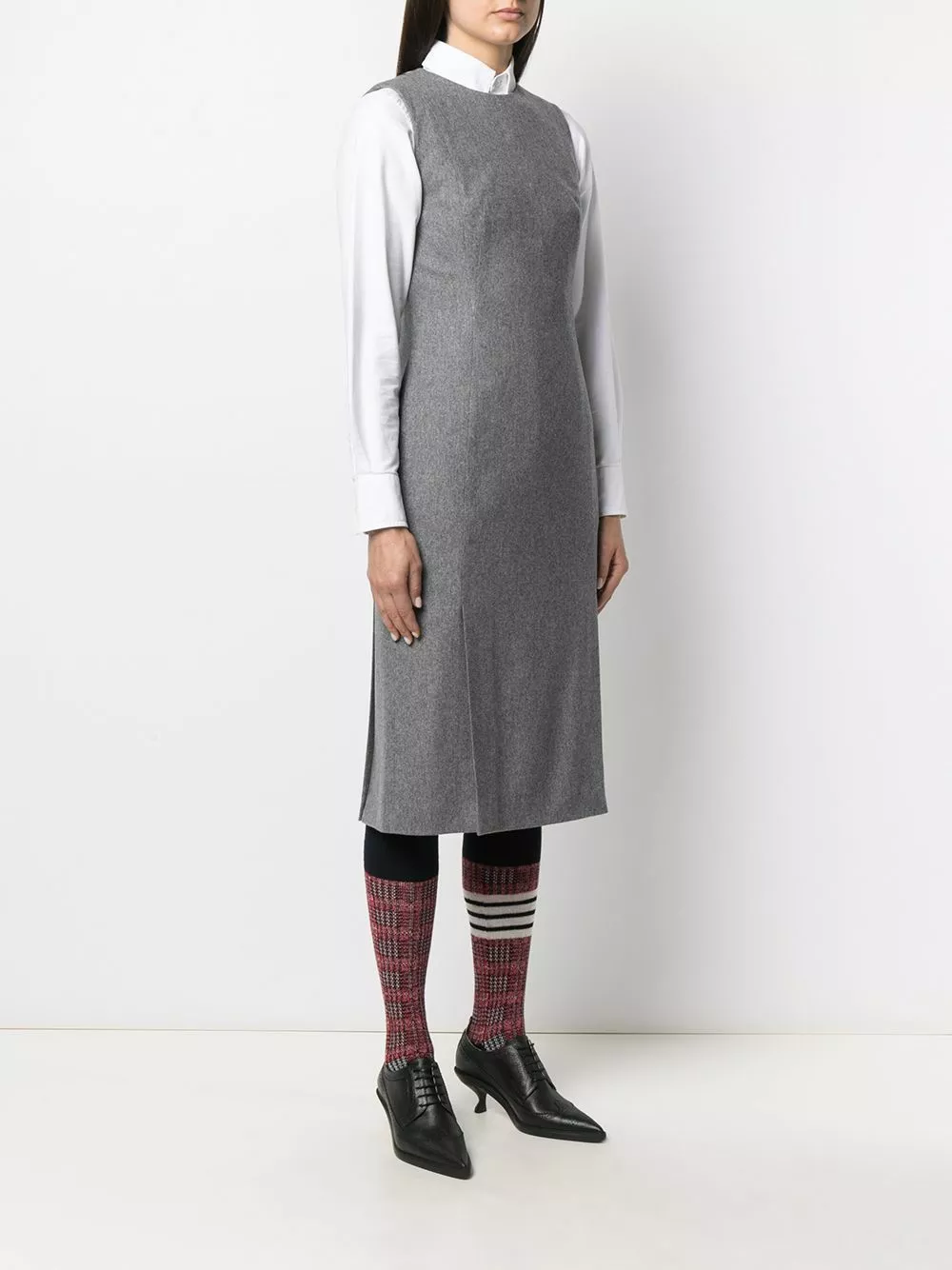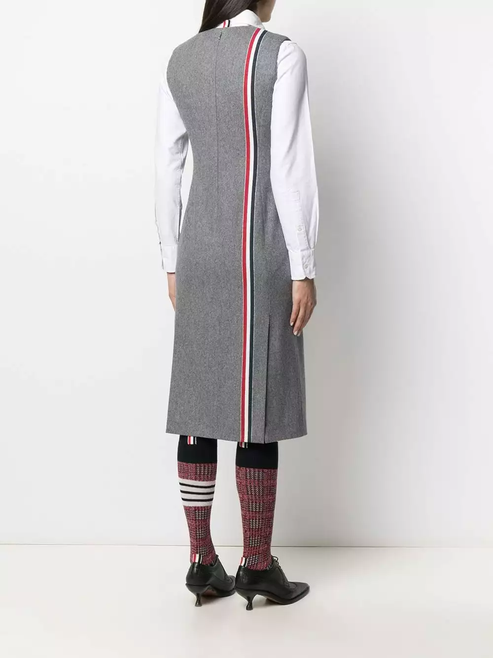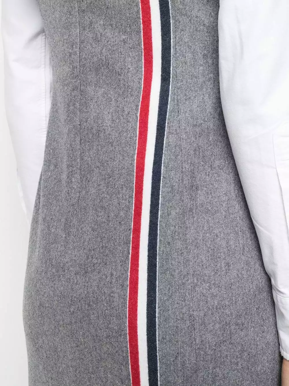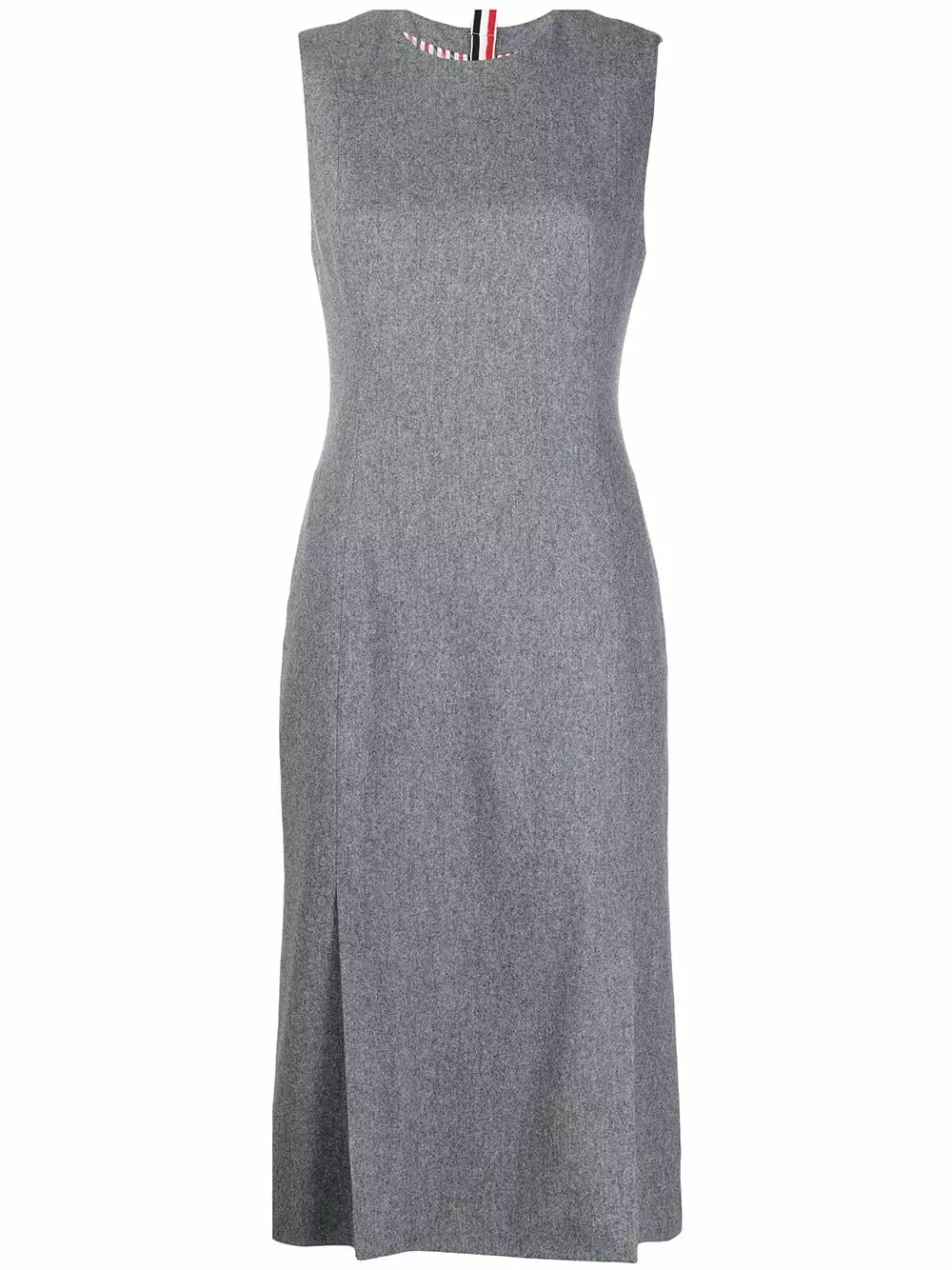 Tailoring for the modern woman. Featuring RWB stripe detailing, this sleeveless 4-vent pencil dress from Thom Browne will add a contemporary twist to your outfit. Forward is the way.