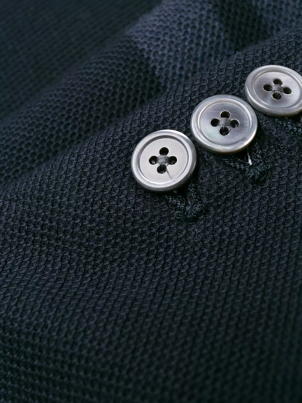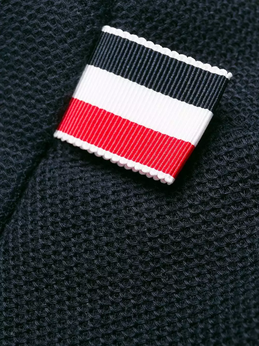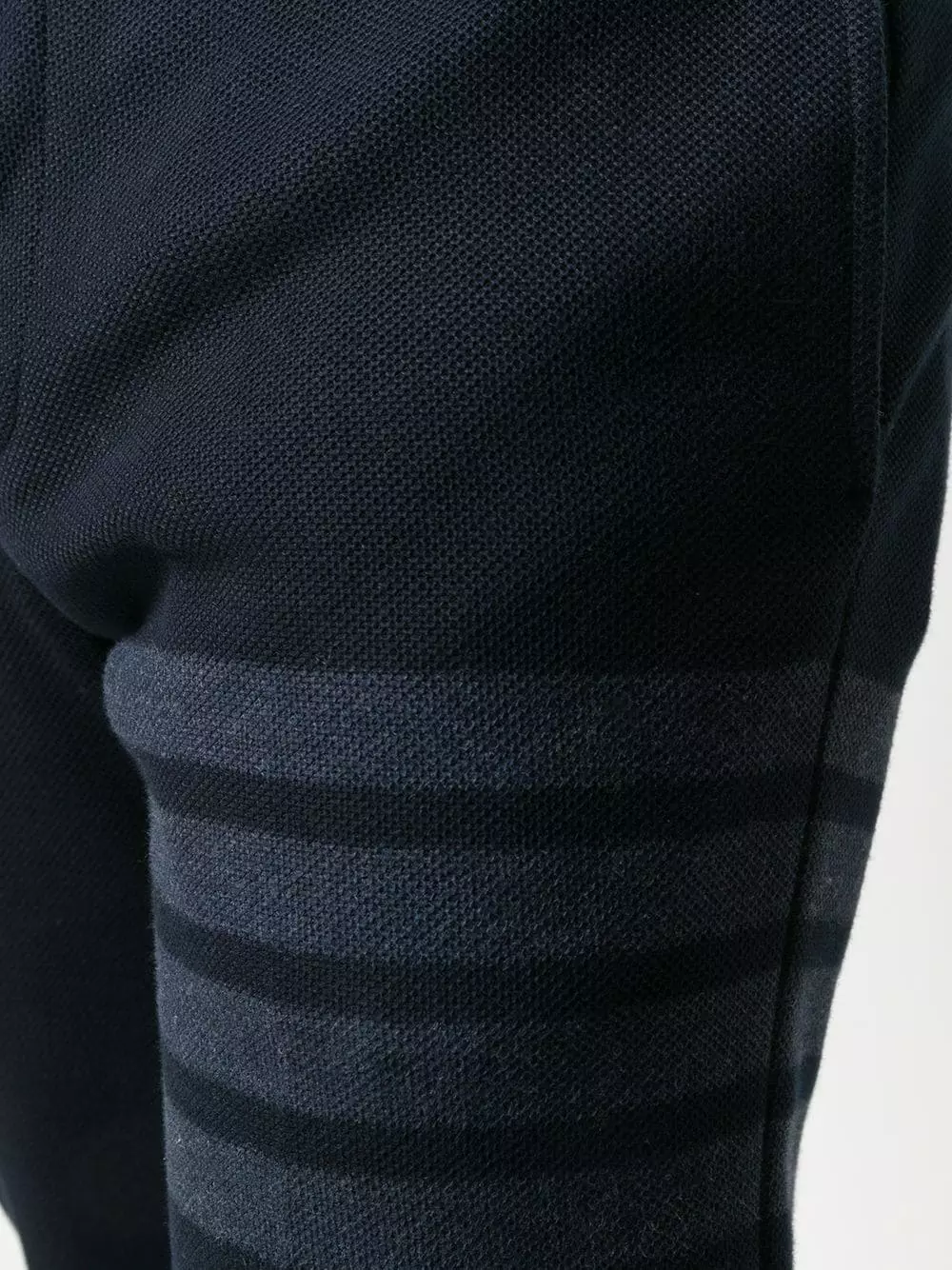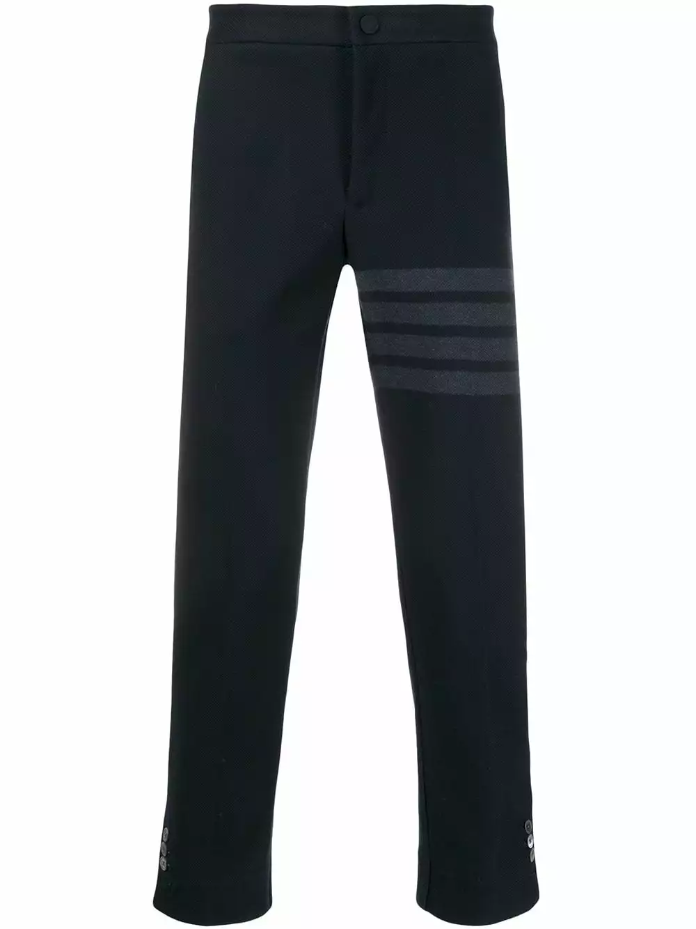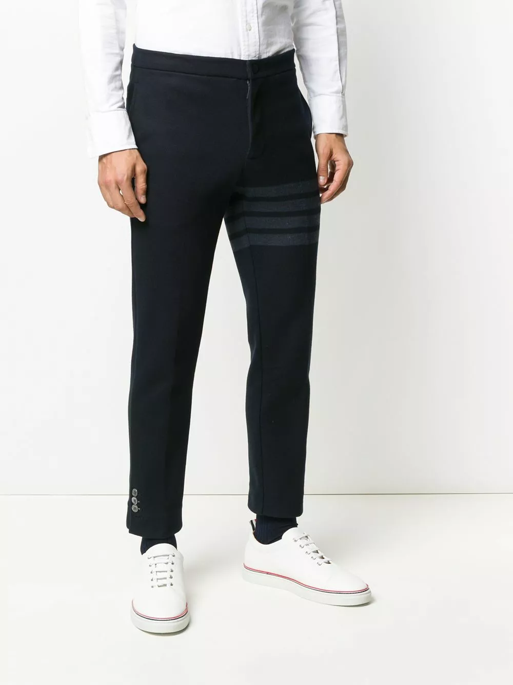 Casual Fridays are a thing of the past. These navy cotton slim-fit tonal 4-Bar trousers from Thom Browne will make you want to suit up every day of the week. Show them you mean business. Featuring a mid-rise, a slim fit, a front button fastening, side slit pockets, a cropped length, a stripe detail to the side, two back buttoned welt pockets, a signature tri-colour striped trim and a pull tab at the rear.
