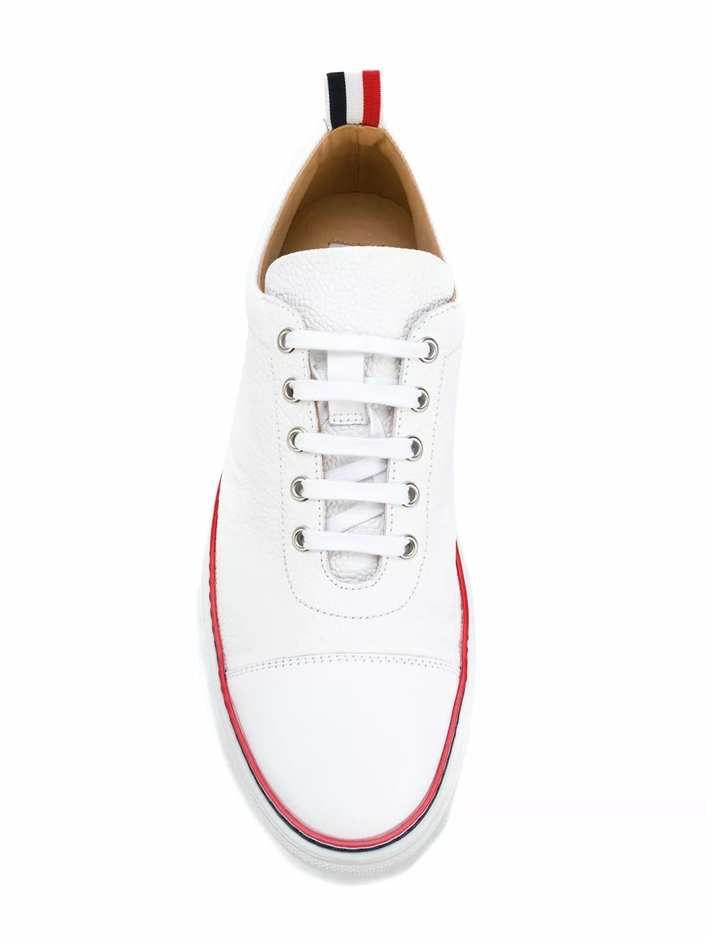 Whilst Thom Browne is highly recommended for his devotion to high-end tailoring, much of his love is also addressed to the integration of sports, often including athletic characteristics to his ever-sophisticated designs. These low top sneakers were constructed from pebble grained white leather in a laid-back design. It boasts signature red, white and navy blue stripe appliqués all around the sole, also featuring a round toe, a front lace up detail, a branded insole, a cup sole, chrome grommets and a rear stripe detail pull tab.