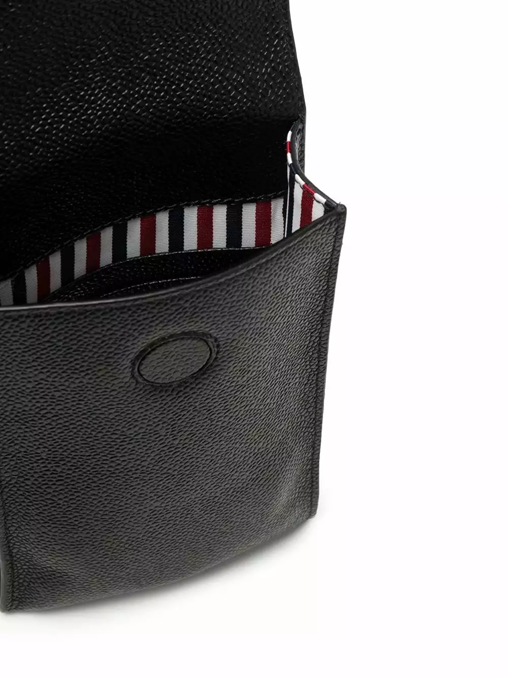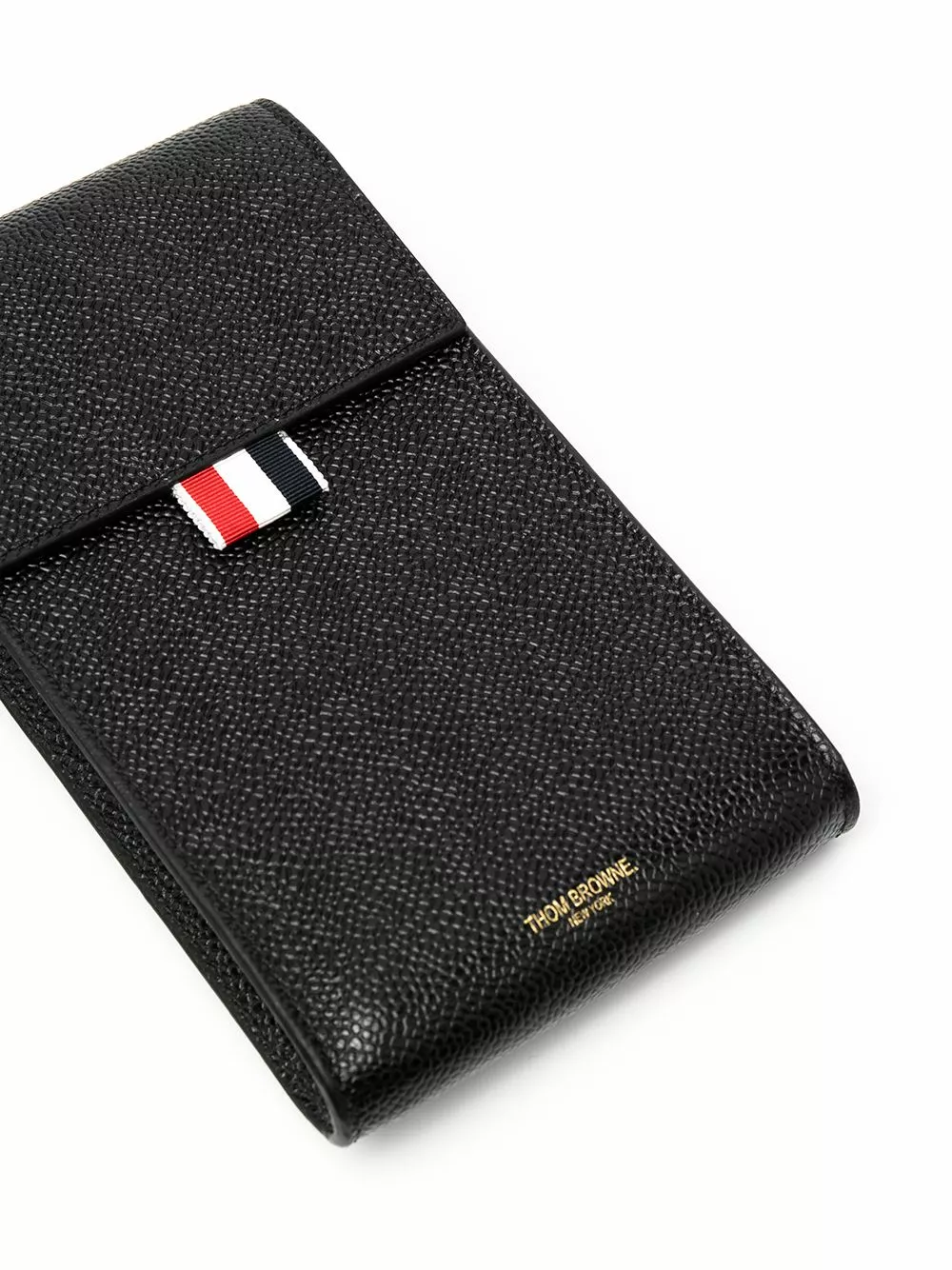 Tired of having your pockets full? Slide your phone in this black calf leather strap phone holder from Thom Browne. Hands-free and elegant. Featuring a shoulder strap, a top flap closure, a main internal compartment, a printed logo to the front, a pebbled leather texture and a signature RWB stripe.