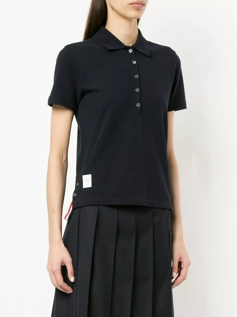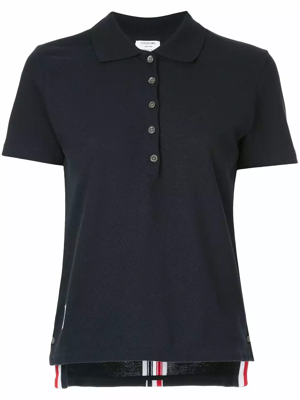Navy blue cotton stripe-trim polo top from Thom Browne featuring a classic polo collar, a straight hem, a front logo patch, side button detailing and a signature red, white and blue stripe to the back.