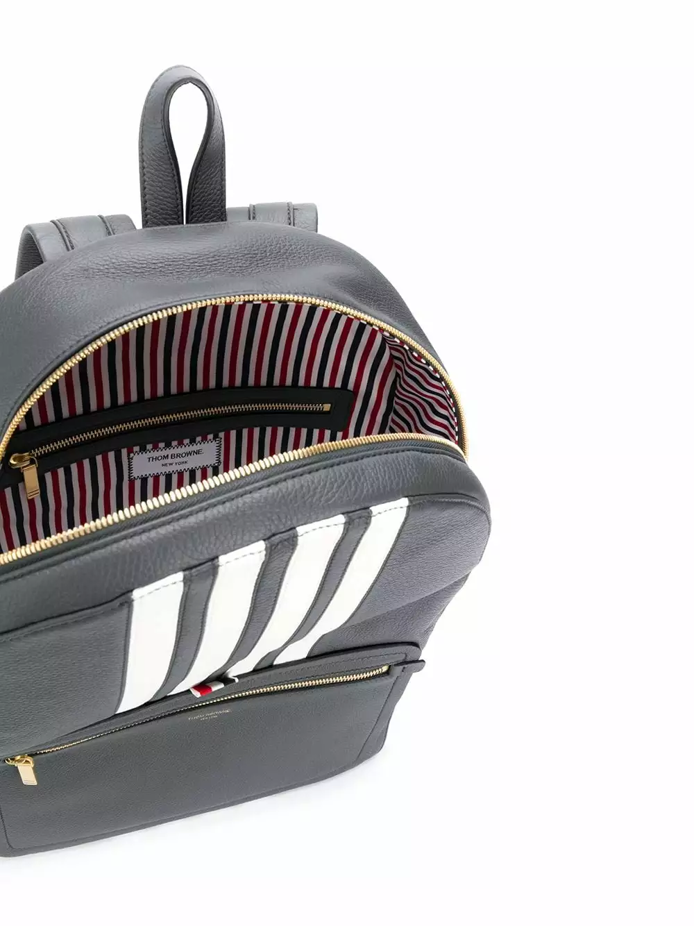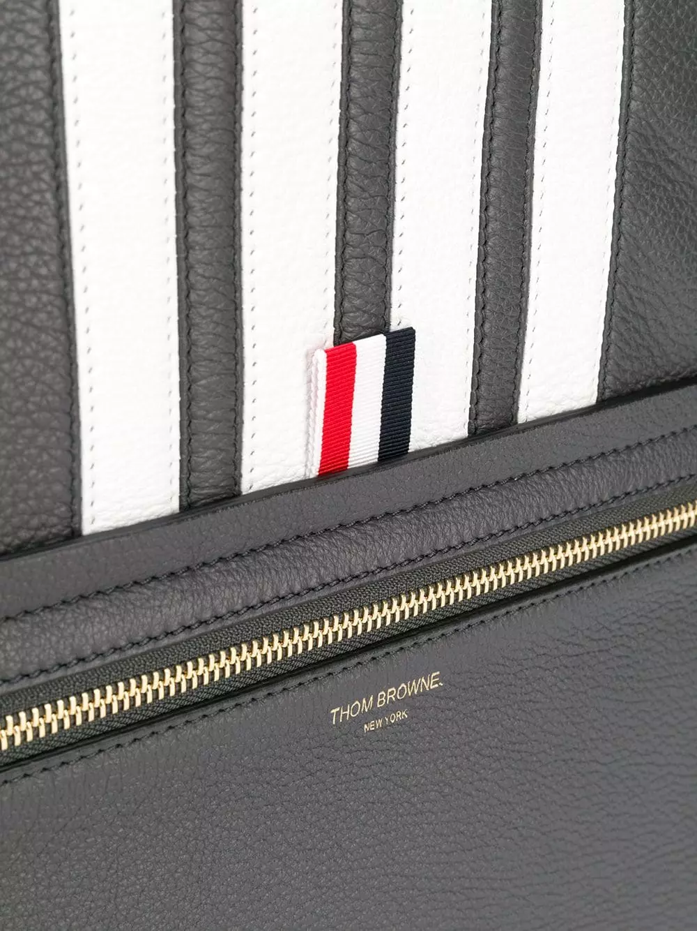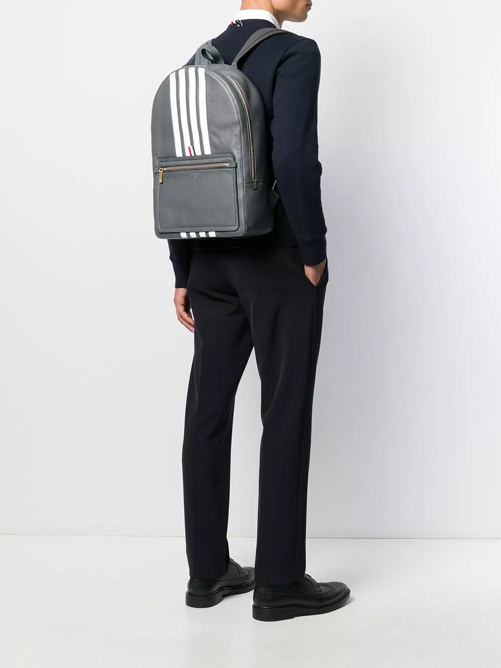 Earn yous stripes with this backpack from Thom Browne. Made from leather, this navy backpack has a structured design, a gold-tone top zip fastening, an internal zipped pocket, a zipped pocket at the back and the brand’s signature three stripe detailing.