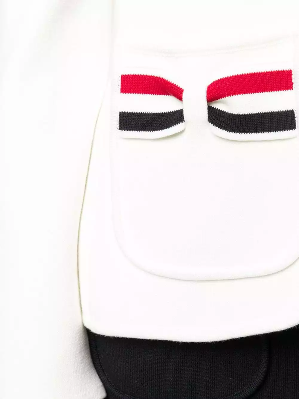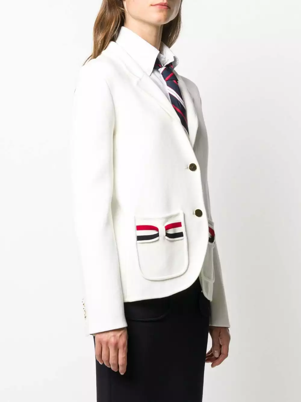 We all need a good blazer in our life, and this could be yours. This white cotton striped bow blazer from Thom Browne features bow detailing, classic lapels, front button fastening and two side patch pockets.