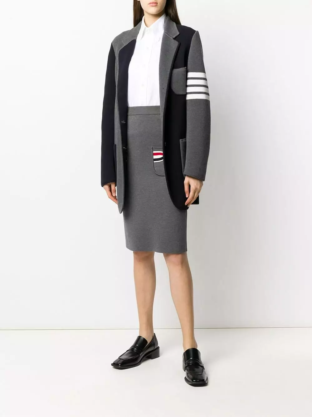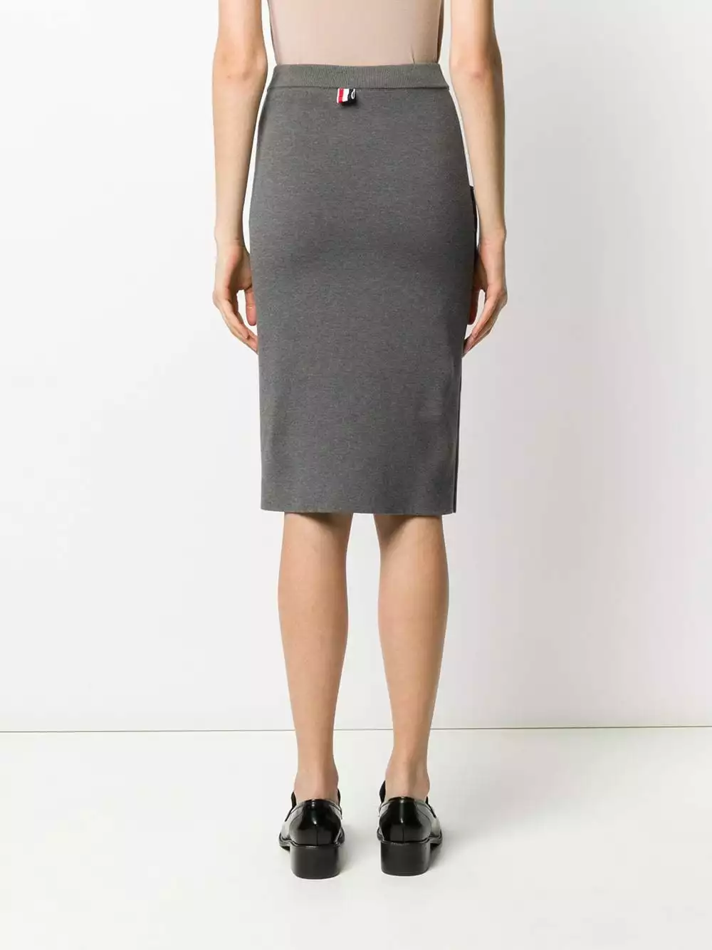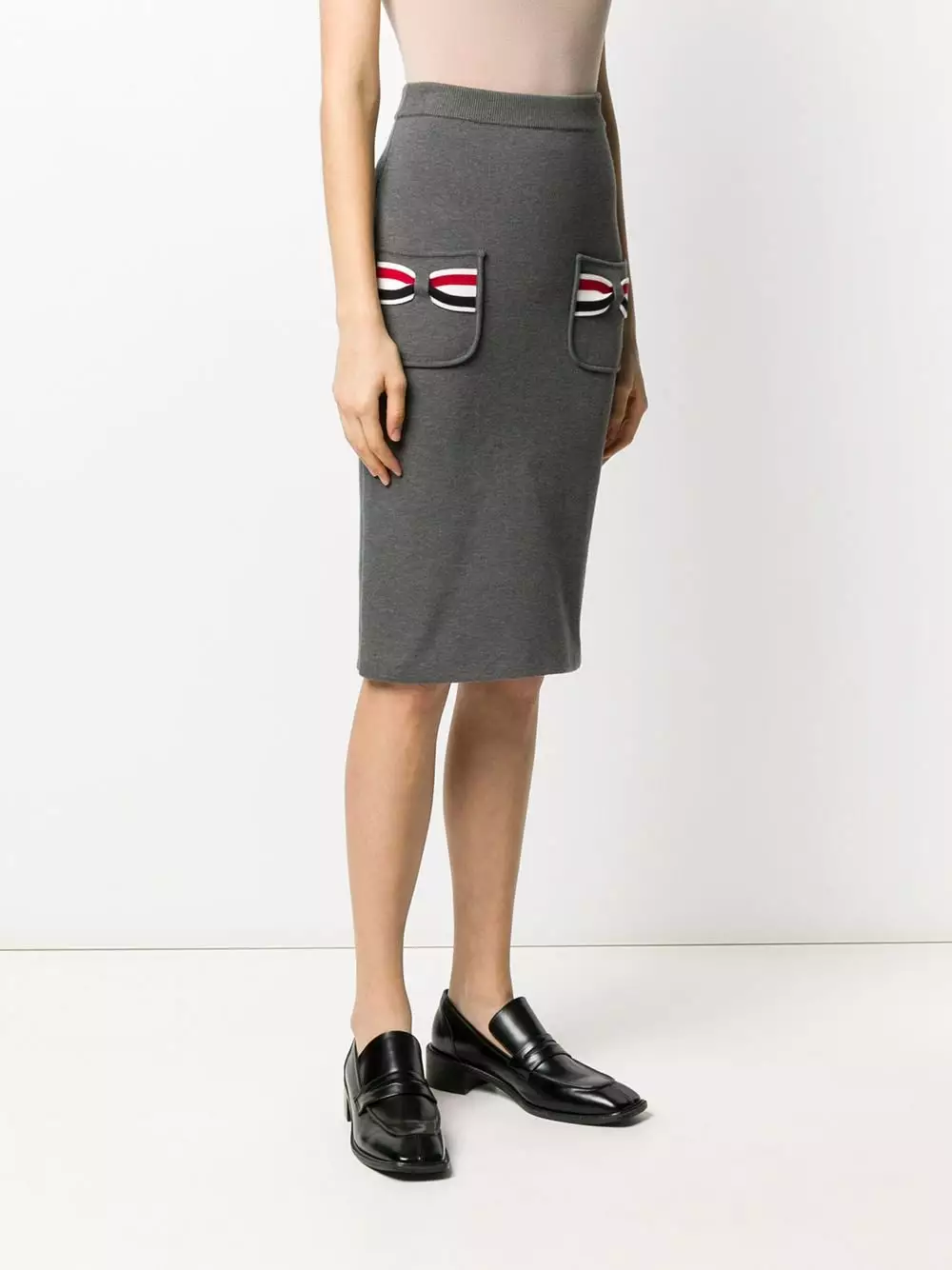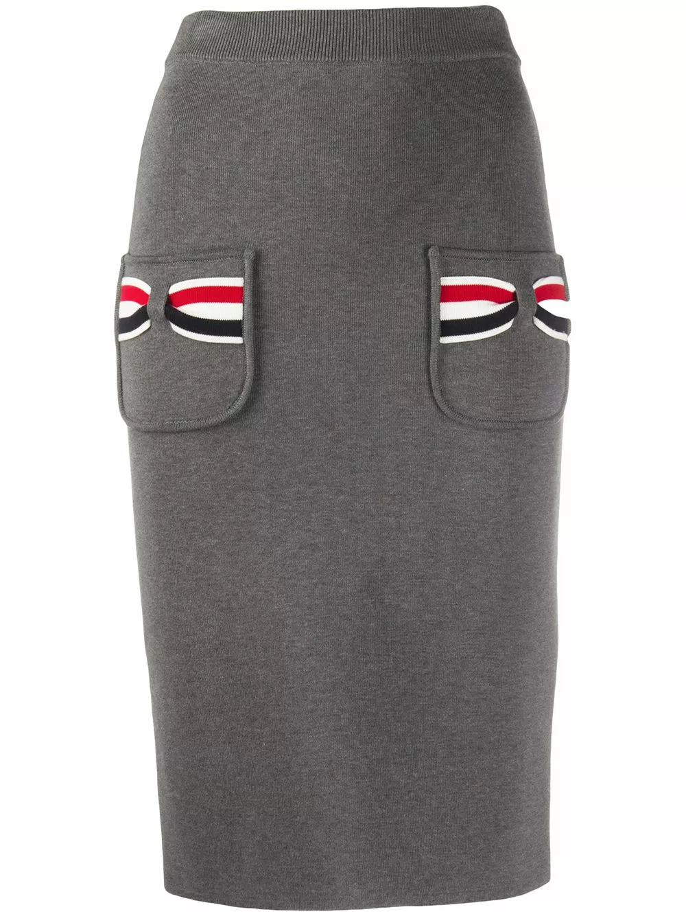 You’ll want to make space in your wardrobe for this addition. Made from medium grey cotton, this knitted pencil skirt from Thom Browne is detailed RWB stripes on the pockets. It’s all in the details.