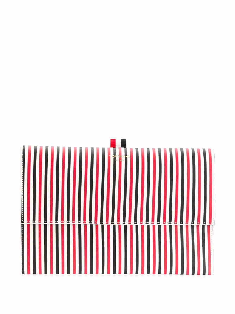 Red, white and black lambskin leather striped flap folio from THOM BROWNE featuring vertical stripes, a rectangular body and a foldover top with magnetic closure.