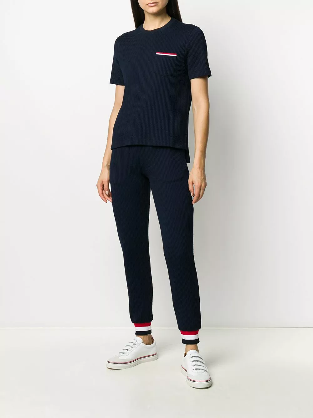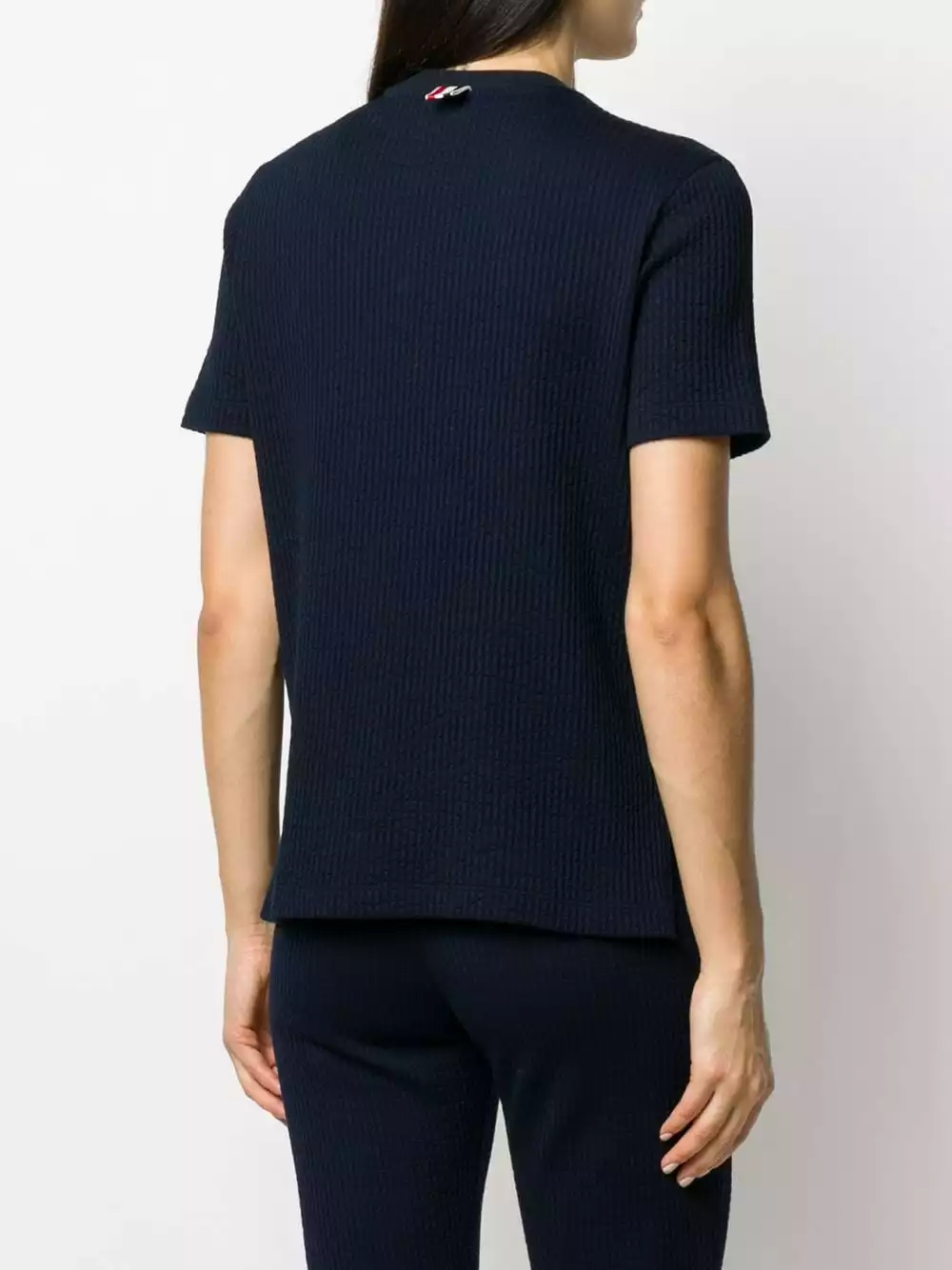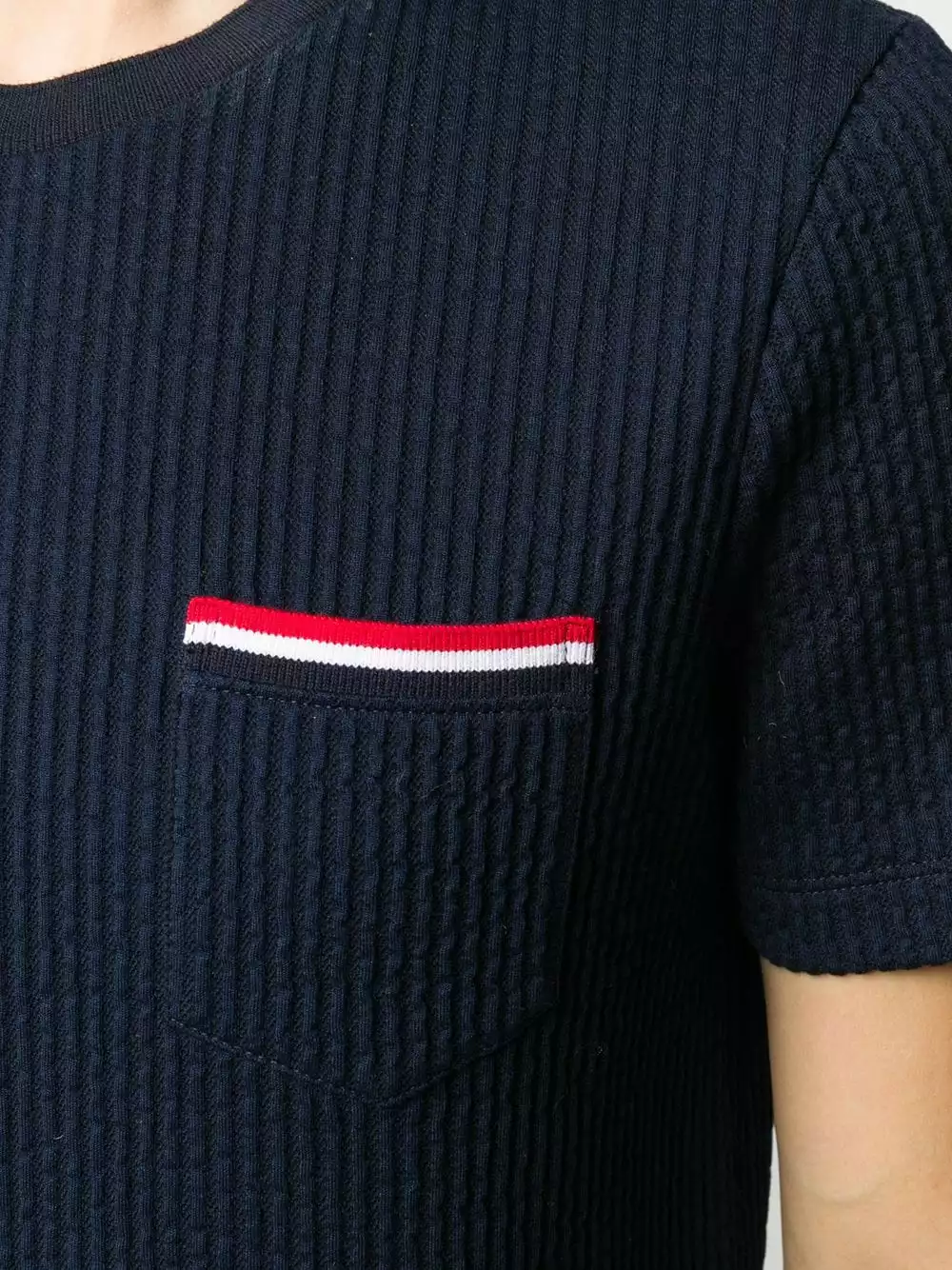 Who says that seersucker is just for summer? Thom Browne challenges the norm with this seersucker short-sleeve T-shirt. The signature RWB stripe at the pocket makes it instantly recognisable. Featuring a patch pocket at the chest, a round neck, seersucker knit and RWB stripe on the pocket.