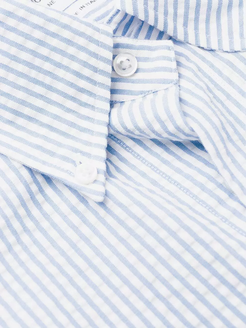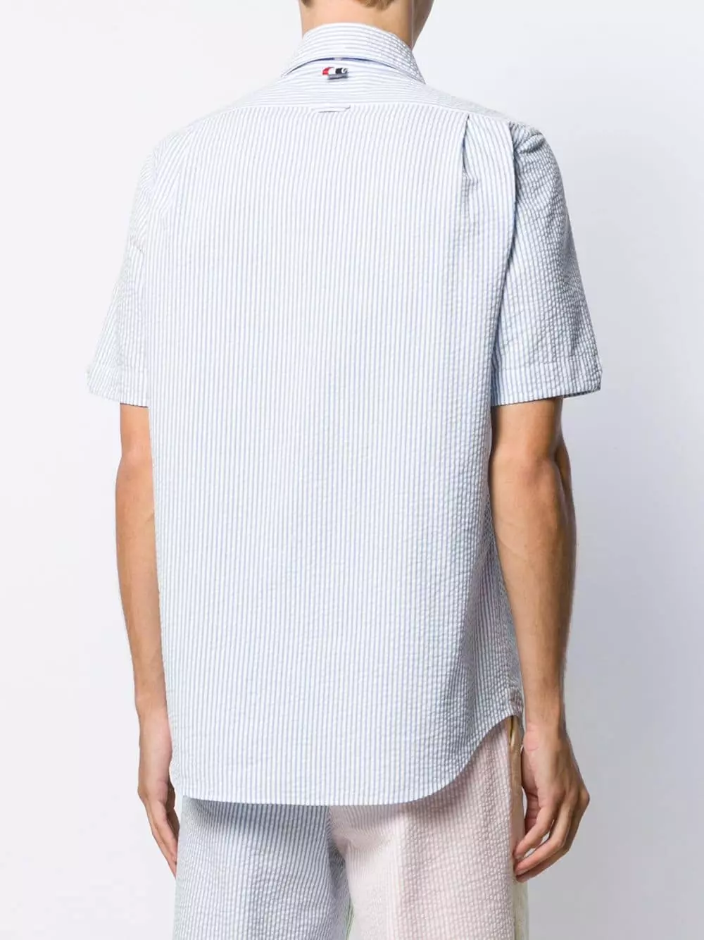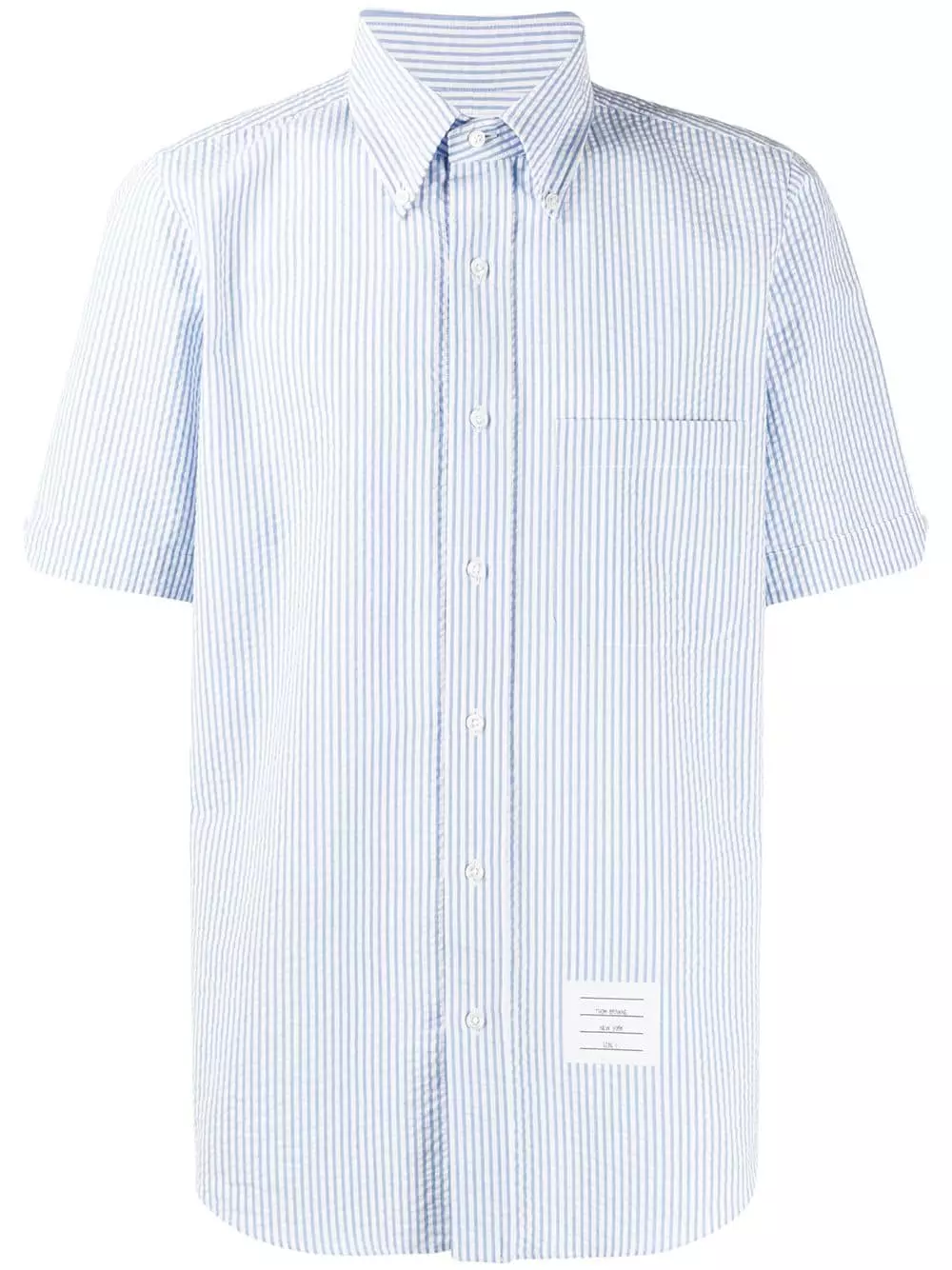 After a long week of work you’ve definitely earned your stripes for a new look to be added into your wardrobe. Treat yourself with this blue cotton striped seersucker shirt from Thom Browne that is perfect for SS20 that has short sleeves and keeps you feeling fresh throughout the day. Featuring a button-down collar, a front button fastening, a chest pocket, a front logo patch, a relaxed fit, a curved hem, short sleeves and a signature three stripe detail.