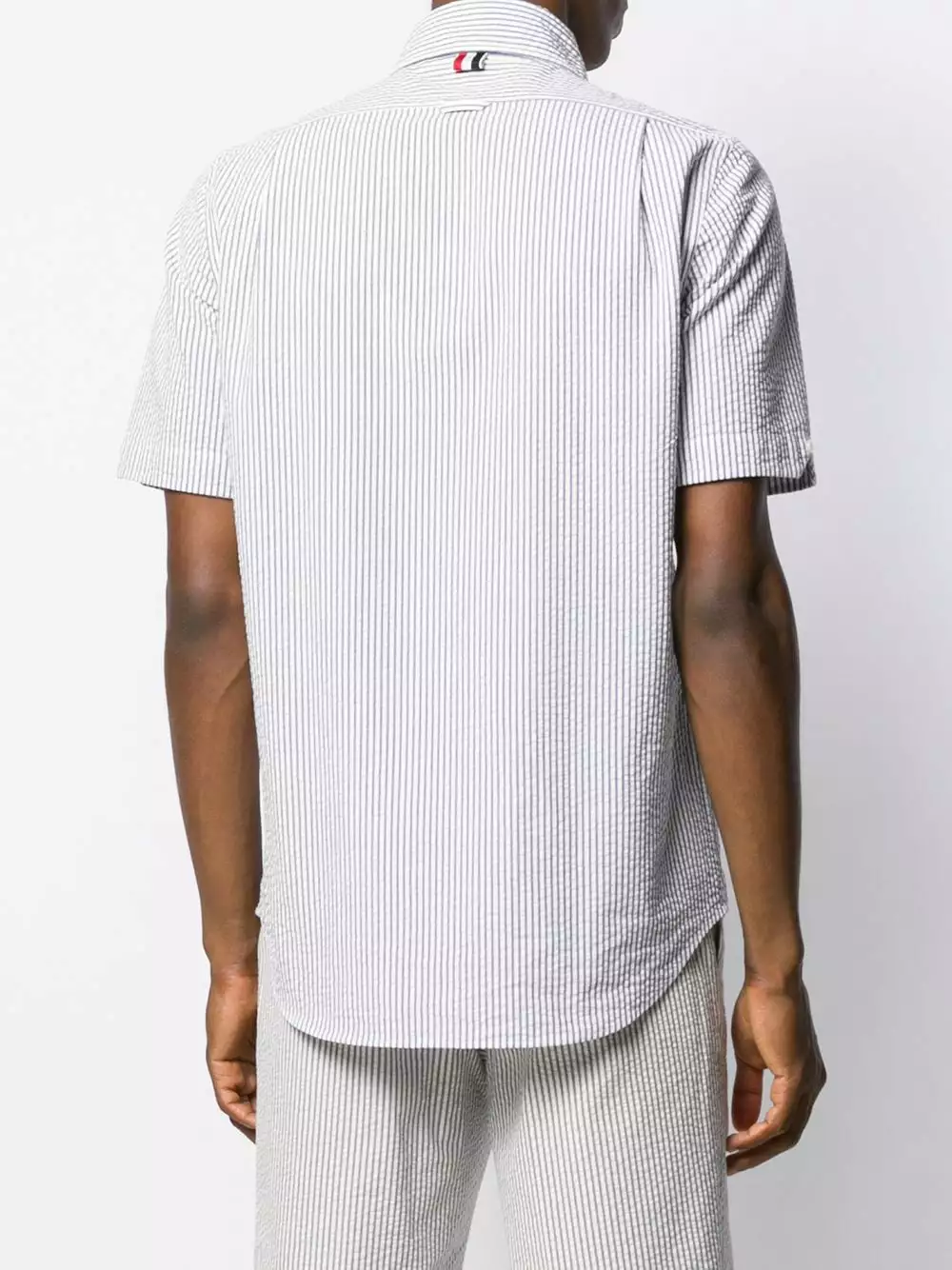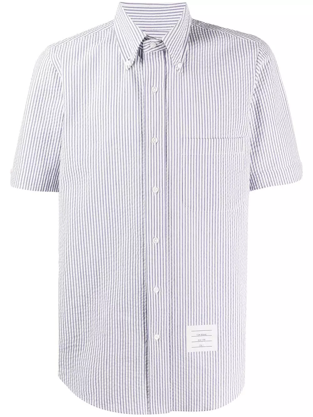Thom Browne’s newest edit captures the immaculate craftsmanship and minimalist designs that have come to define the American label, as seen with this blue and white cotton striped seersucker shirt featuring a button-down collar, a front button fastening, short sleeves, a chest pocket, a front logo patch and a curved hemline.