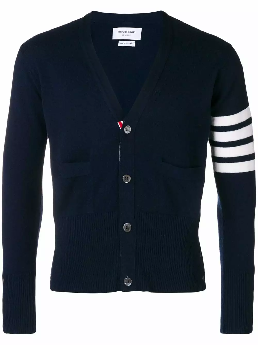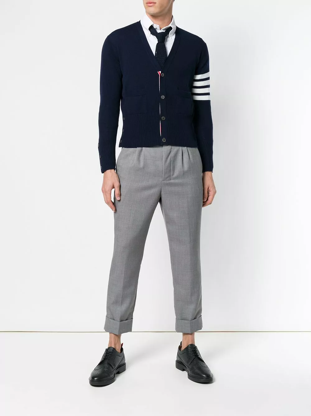 Navy and white cashmere striped sleeve cardigan from Thom Browne.