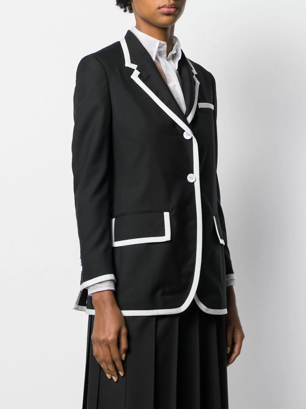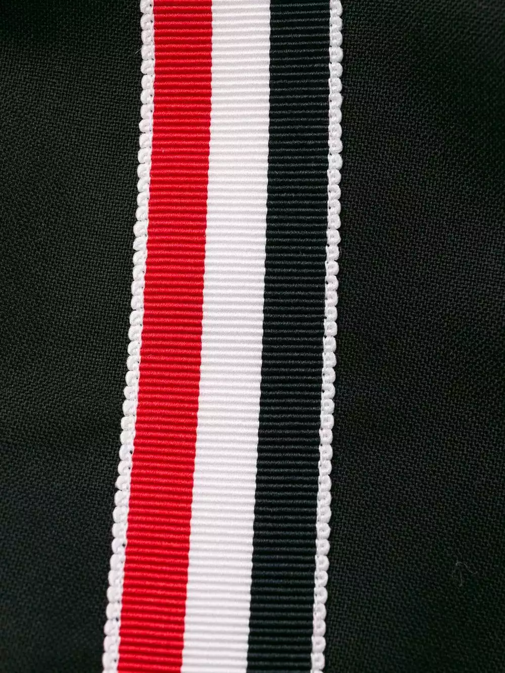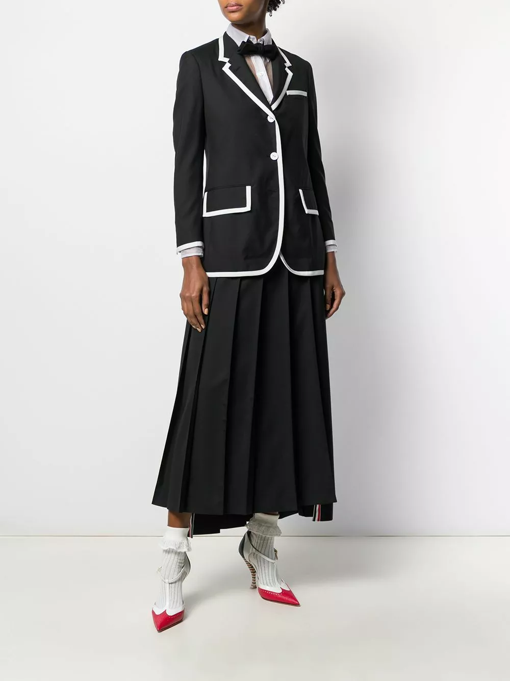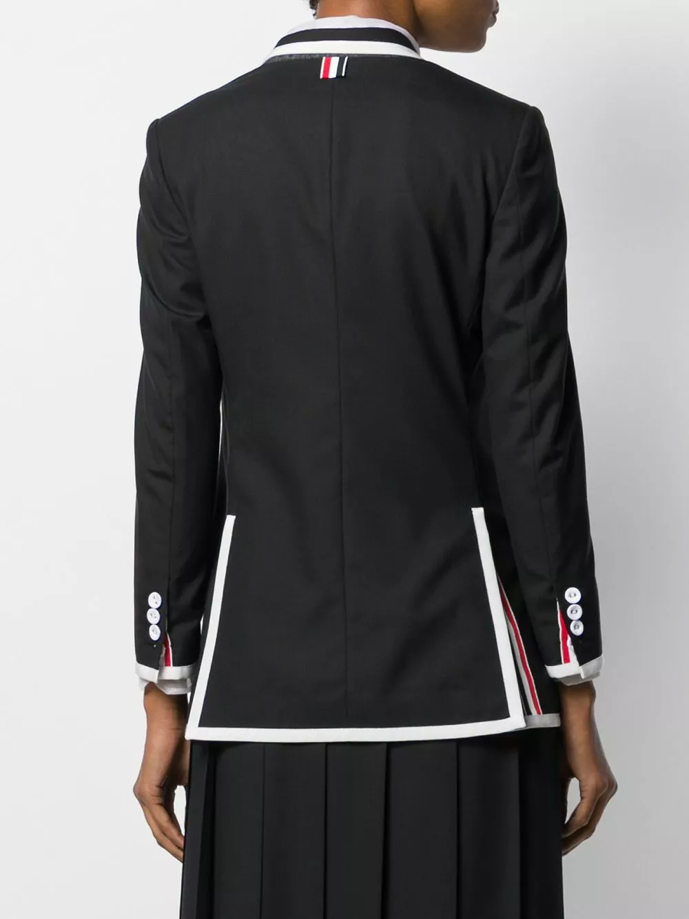 You can’t go wrong with a tailored black blazer. But when that blazer is from Thom Browne, you can go very, very right. ‘Blaze-r’ a style trail. Featuring notched lapels, a front button fastening, long sleeves, a chest pocket, front flap pockets, a double vent to the rear, a signature grosgrain loop tab, a contrasting trim and a RWB stripe.