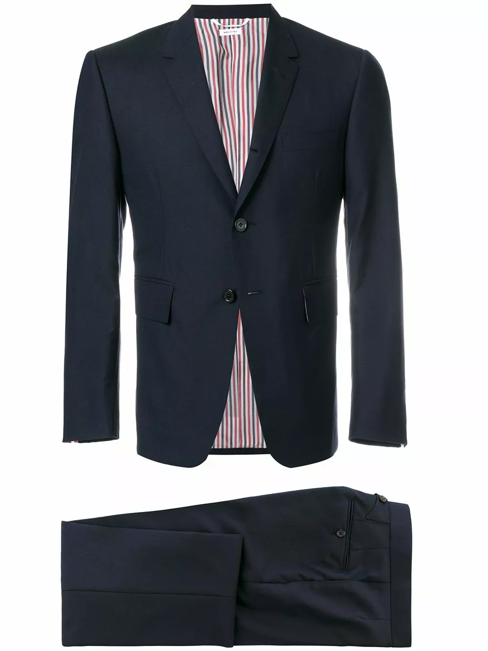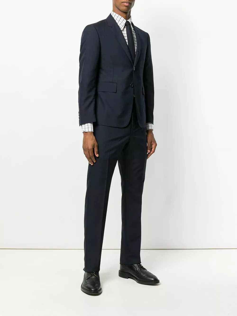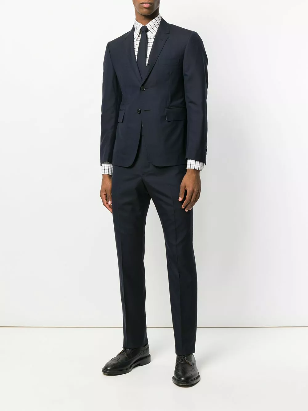 Navy blue wool Super 120s Plain Weave Suit from Thom Browne featuring notched lapels, cropped sleeves, button cuffs, a front button fastening, a broad welt chest pocket, front flap pockets, a double vent to the rear, a full lining, a hook and zip fly, side slit pockets, two back buttoned welt pockets, a tailored design and a regular length.