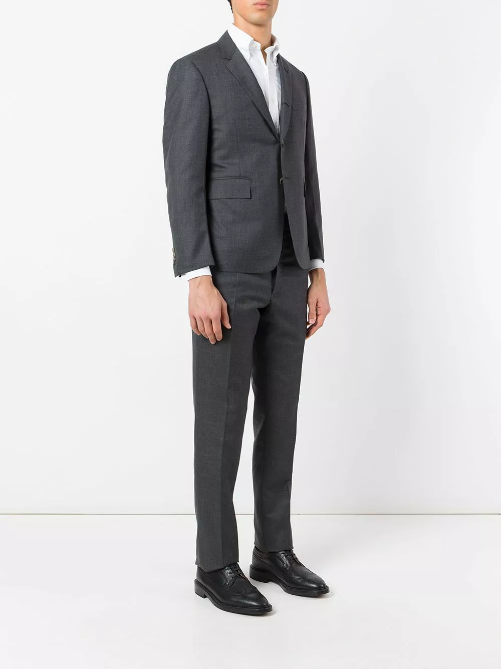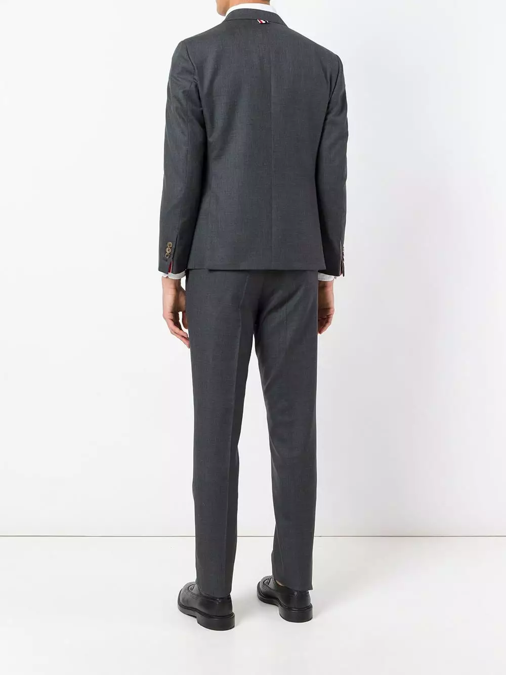 Exude charm and sophistication in this dark grey wool Super 120s twill suit from Thom Browne. Designed with notched lapels, straight-leg trousers, and signature tricolour striped details, this dapper two-piece makes formal dressing an effortless affair. Featuring a jacket with notched lapels, a signature tricolour tab to the back, a broad welt chest pocket, cropped sleeves, button cuffs, a front button fastening, front flap pockets, a double vent to the rear, and a tricolour striped full lining, as well as trousers featuring a concealed front fastening, side slit pockets, two back buttoned welt pockets, and a straight leg.